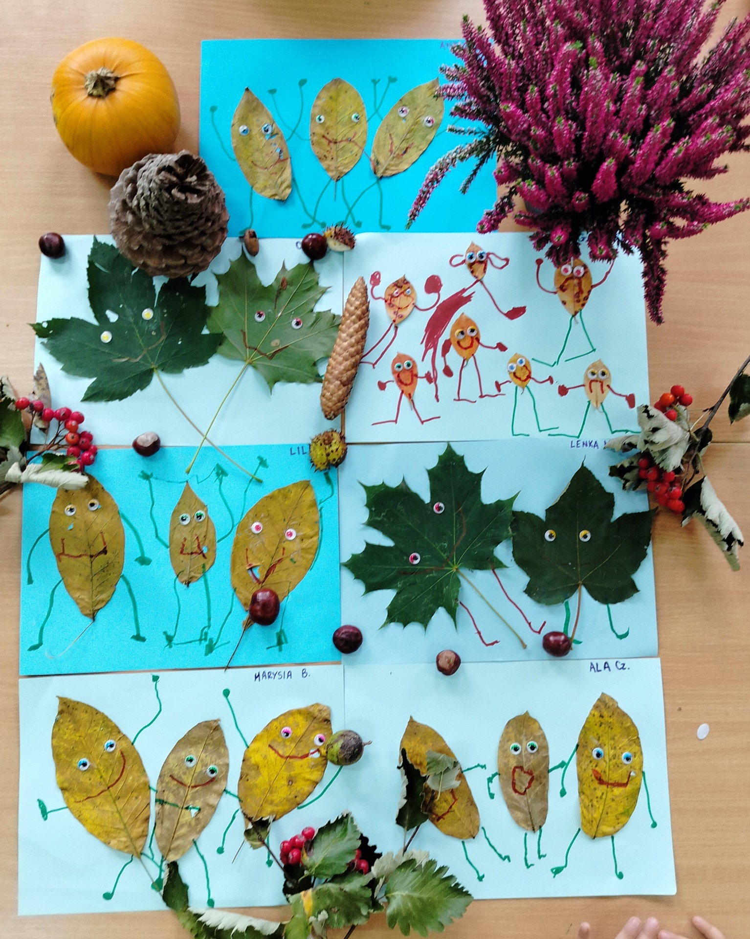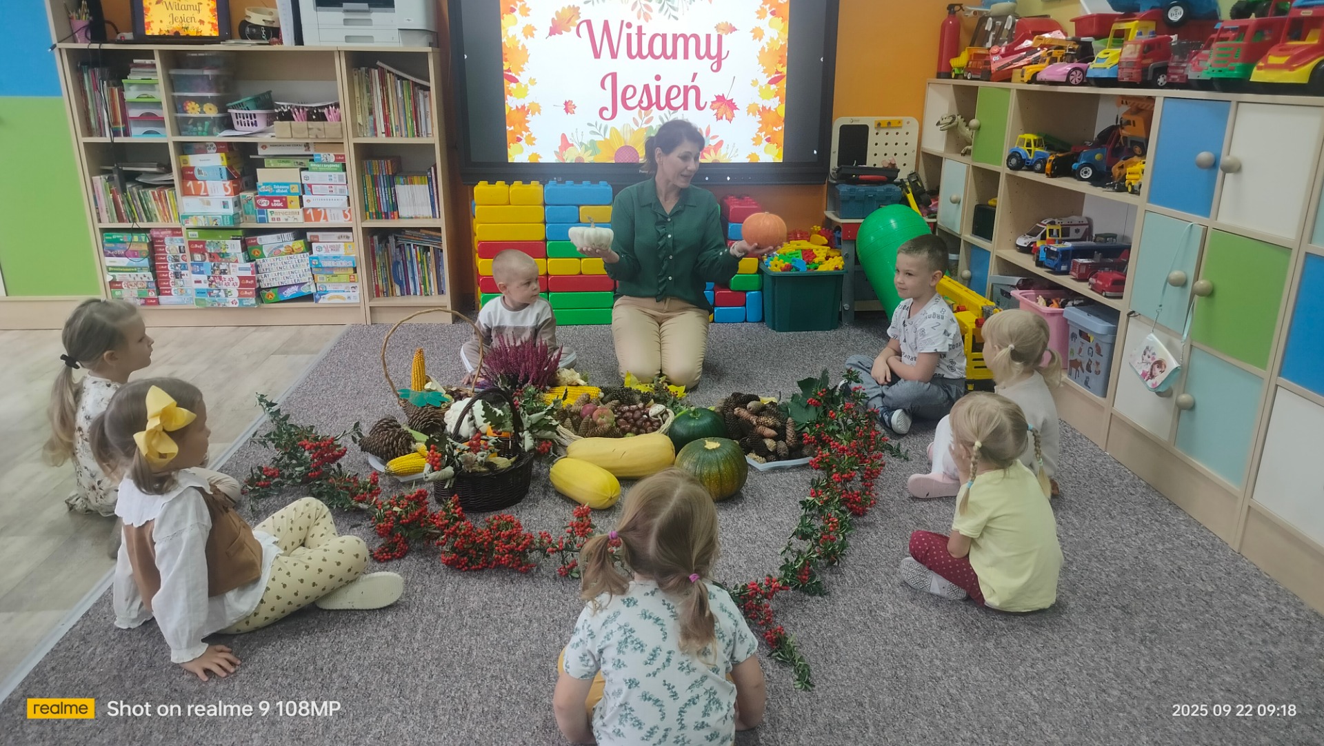 Pani Jesień przyniosła przedszkolakom koszyki wypełnione darami: kasztanami, żołędziami, jarzębiną, grzybami, szyszkami, kukurydzą, lawendą oraz kolorowymi liśćmi. Maluchy zapoznały się ze wszystkimi dobrodziejstwami matki natury i przez cały dzień tworzyły z nich min. ścieżkę sensoryczną, pracę plastyczną czy segregując je do odpowiednich pojemników. To był bardzo kolorowy i wesoły dzień. Bardzo się cieszymy, że Pani Jesień już do nas zawitała.