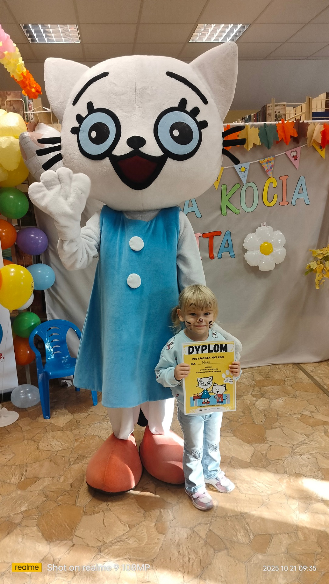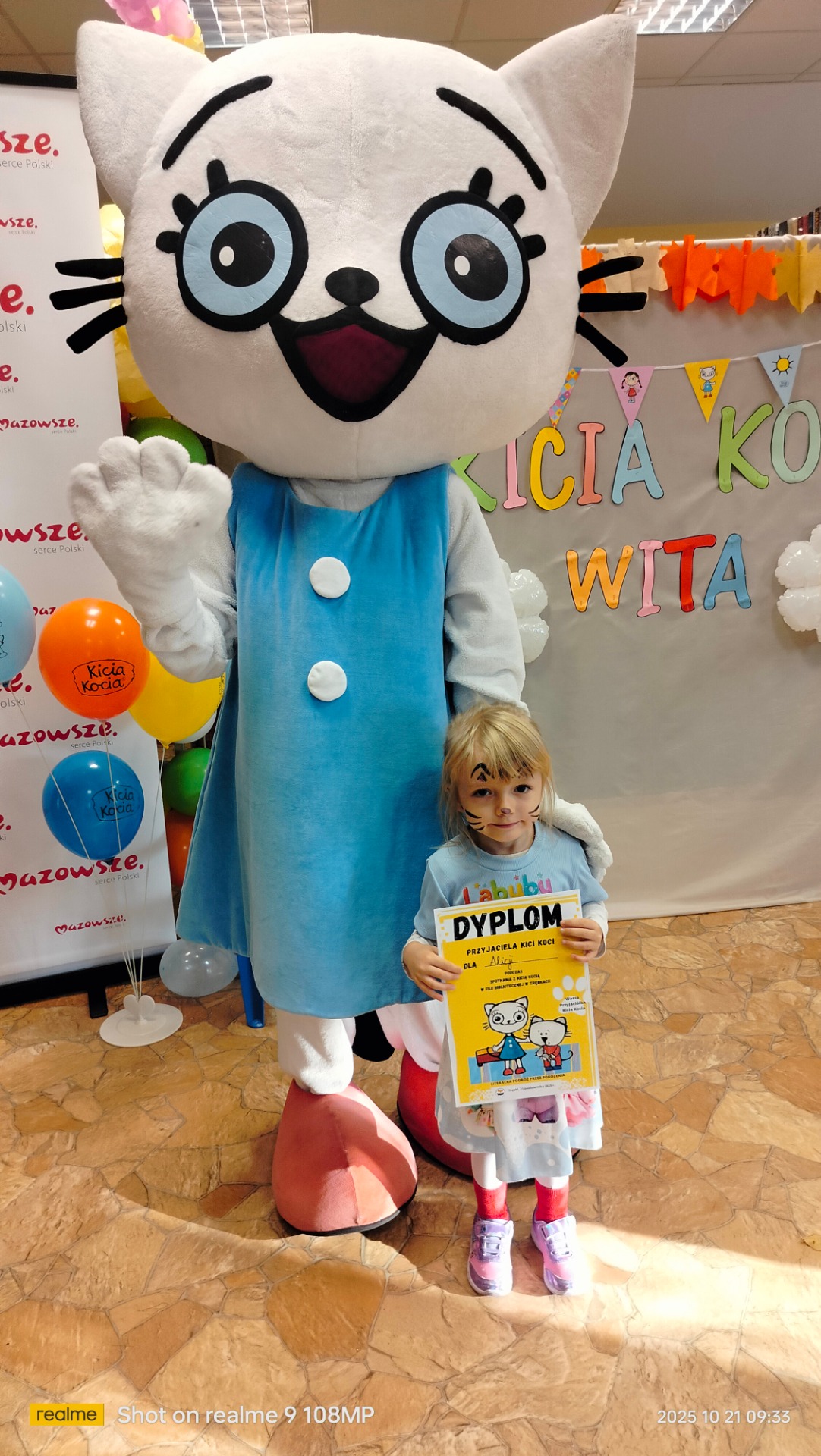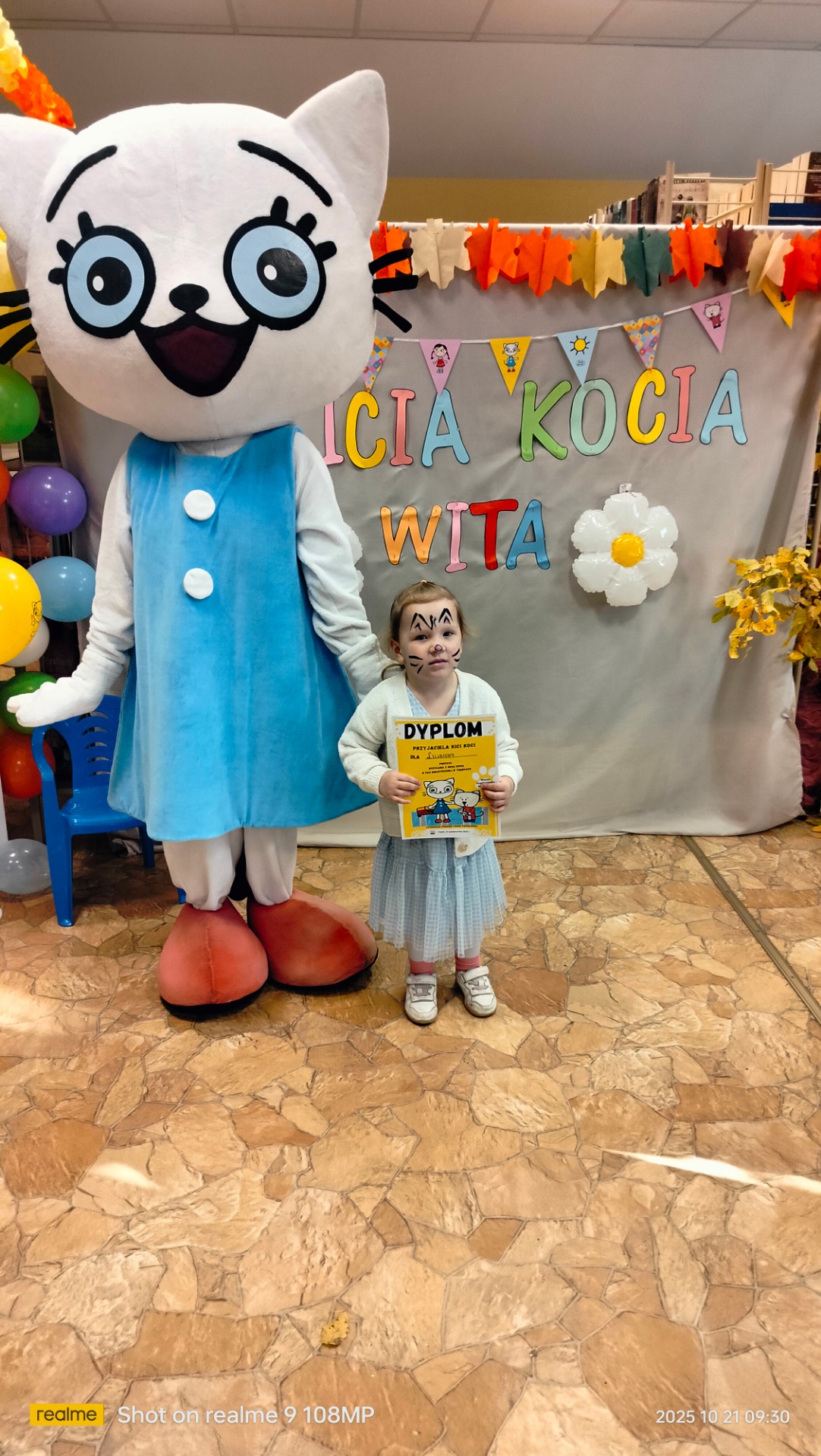 Spotkanie z Kicią Kocią było dla dzieci nie tylko atrakcją, ale też doskonałą okazją do rozwijania umiejętności społecznych, budowania relacji z rówieśnikami i dorosłymi oraz wzmacniania pewności siebie. Każdy przedszkolak otrzymał pamiątkowy dyplom Przyjaciela Kici Koci.
