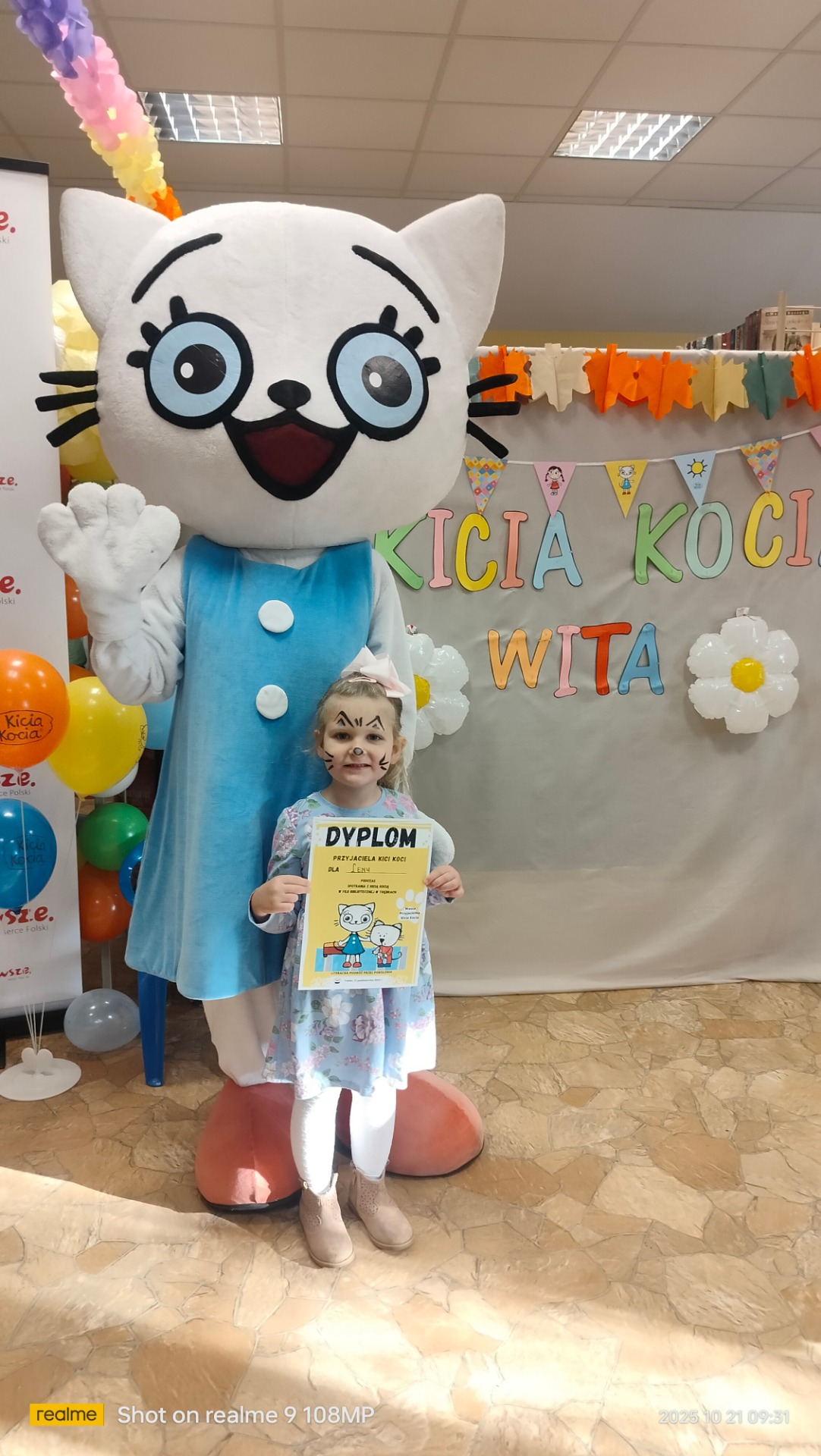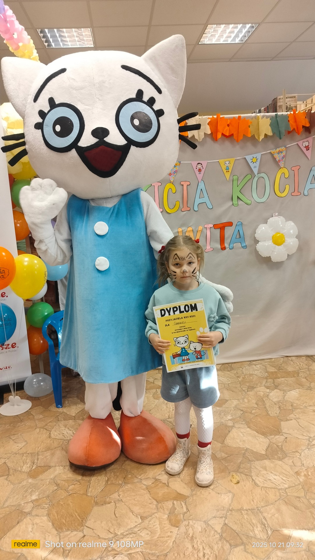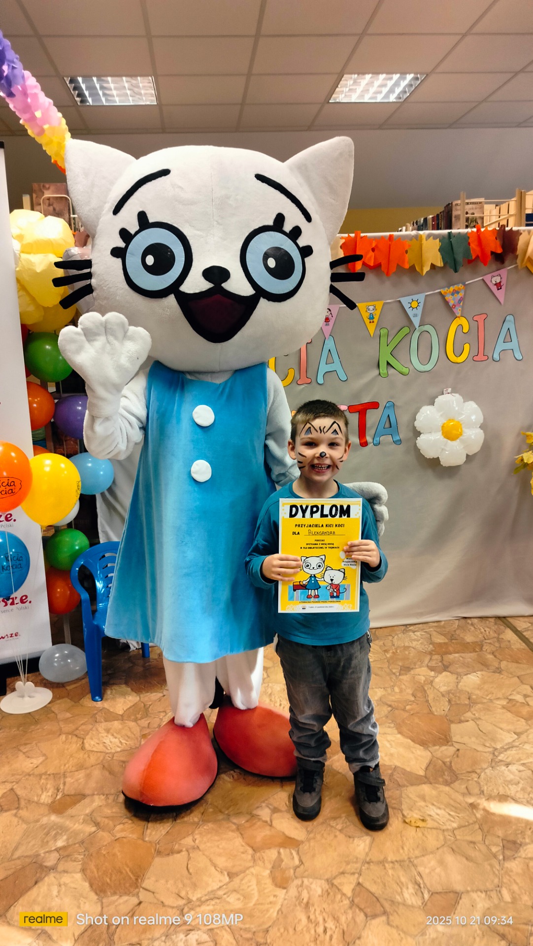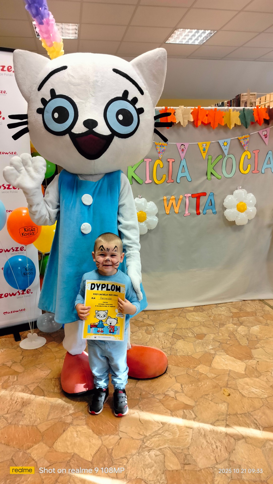 Spotkanie z Kicią Kocią było dla dzieci nie tylko atrakcją, ale też doskonałą okazją do rozwijania umiejętności społecznych, budowania relacji z rówieśnikami i dorosłymi oraz wzmacniania pewności siebie. Każdy przedszkolak otrzymał pamiątkowy dyplom Przyjaciela Kici Koci.
