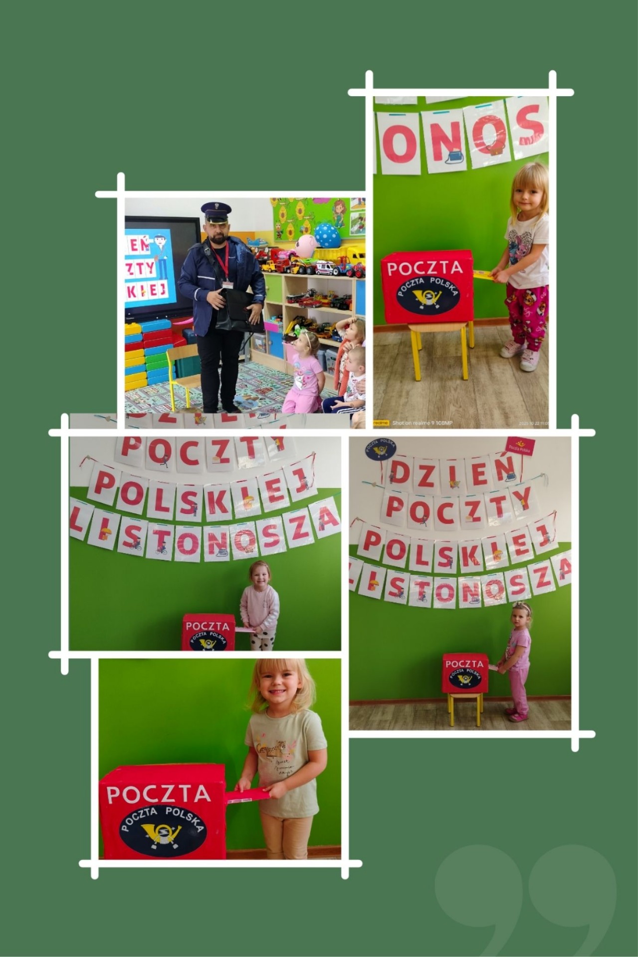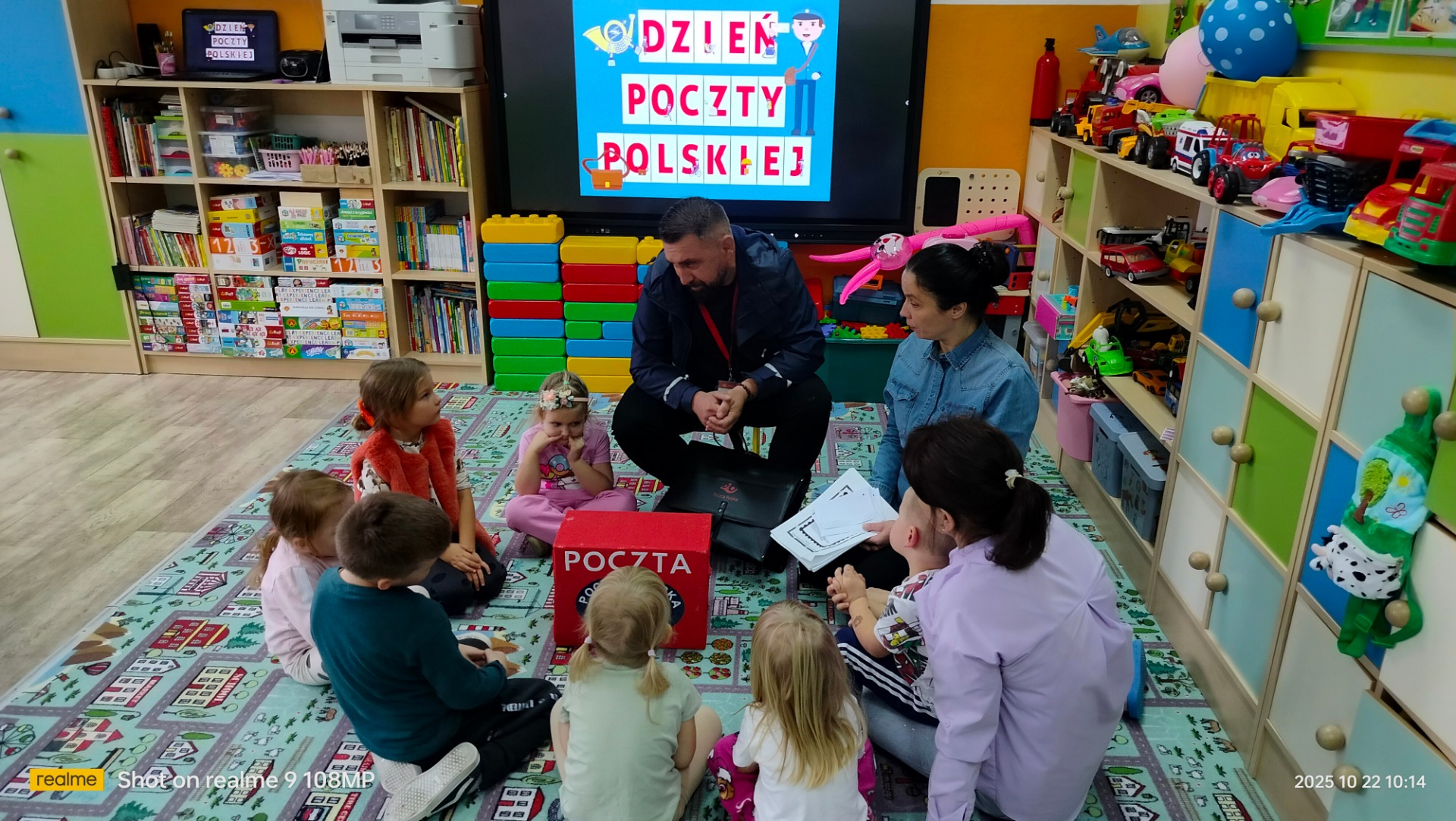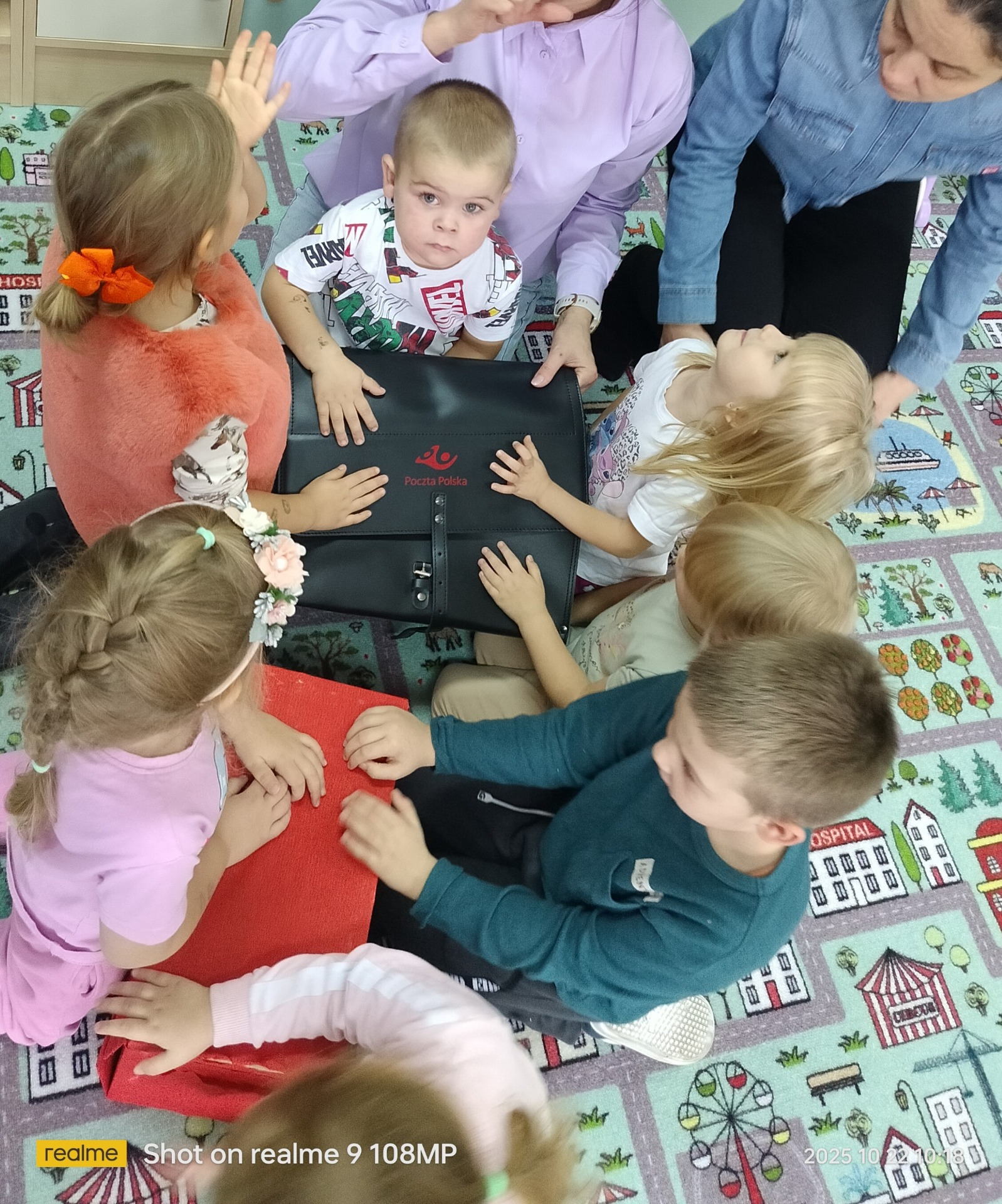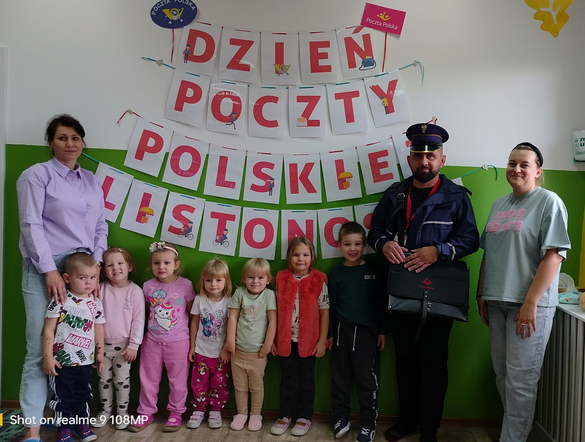 22 października- Światowy Dzień Poczty i Listonosza obchodziliśmy razem z naszym zaprzyjaźnionym listonoszem - panem Łukaszem Leśniewskim, który jest pracownikiem Poczty Polskiej. Pan listonosz przybył do nas w służbowym stroju, z dużym zaangażowaniem i uśmiechem na twarzy opowiedział dzieciom o swojej pracy. Dzieci z wielkim zainteresowaniem słuchały opowieści o pracy, jaką wykonuje listonosz, o trudnościach z jakimi się boryka. Przedszkolaki miały również okazję zobaczyć prawdziwą torbę listonosza oraz jej zawartość. W torbie pan listonosz miał nie tylko koperty i znaczki ale również niespodzianki dla dzieci, kolorowanki i cukierki, którymi obdarował dzieci.
