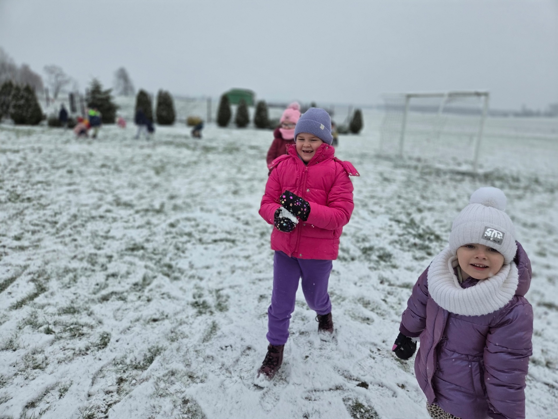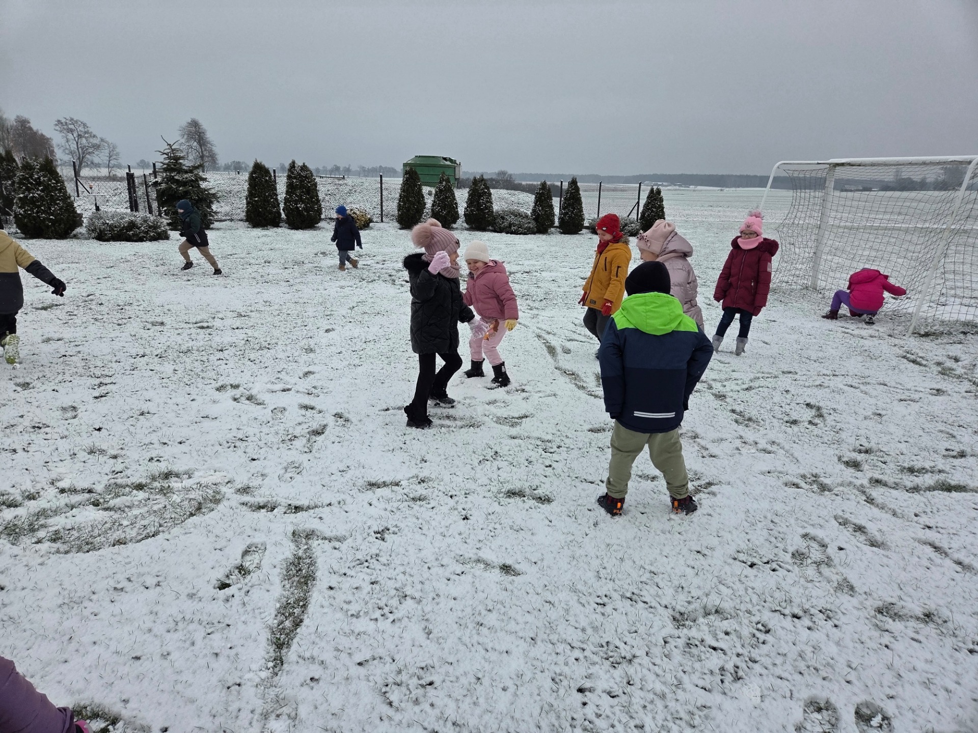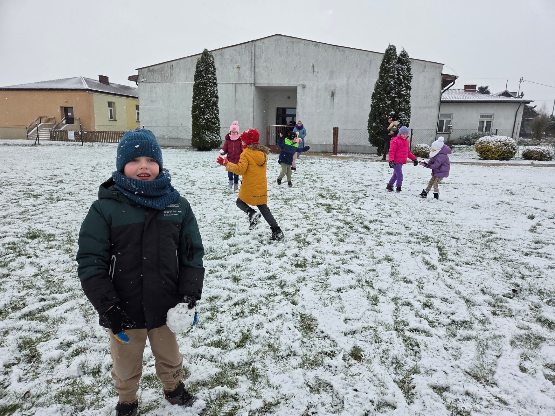 Dzieci z grupy „Słoneczka” z radością powitały pierwszy śnieg! Nasze wyjście na świeże powietrze było pełne wrażeń – rozpoczęliśmy od dokarmiania ptaków w szkolnym karmniku, dbając o naszych skrzydlatych przyjaciół w zimowym czasie. Następnie przyszedł czas na pierwsze zabawy na śniegu: lepienie małych bałwanków, rzucanie śnieżkami i odkrywanie zimowych śladów.