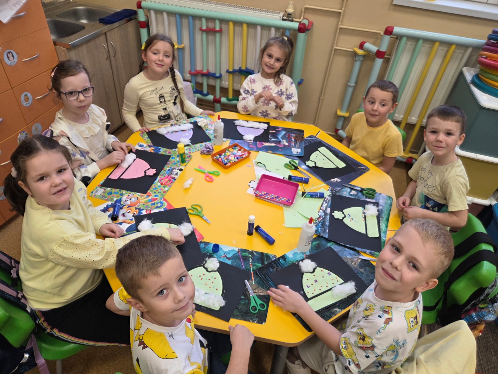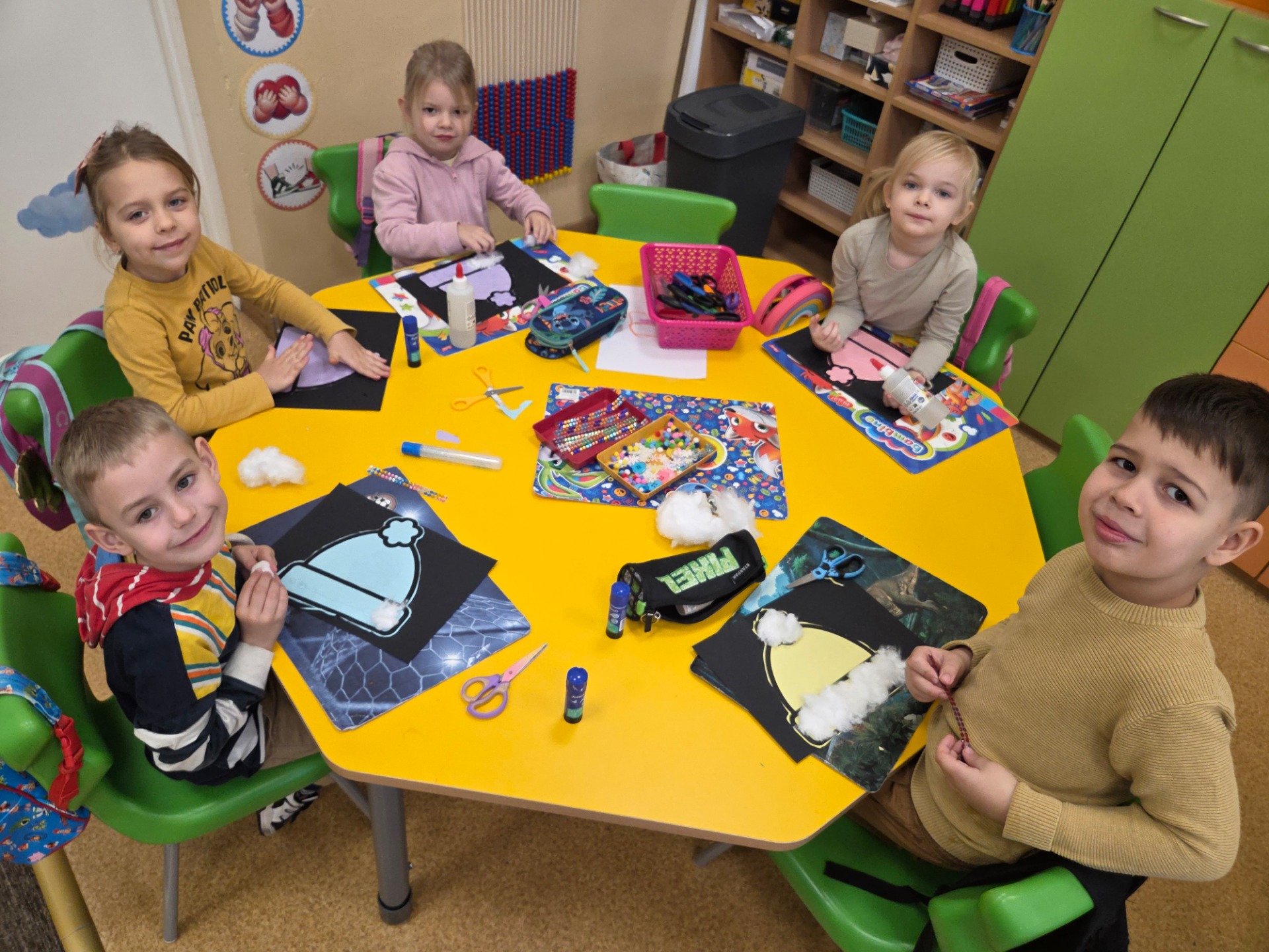 Po powrocie do sali dzieci wykonały pracę plastyczną pt. „Zimowa czapka”, wykorzystując kolorowy papier, watę i błyszczące elementy. Kreatywność i uśmiechy na twarzach były najlepszym dowodem na to, jak bardzo podobały się zajęcia!