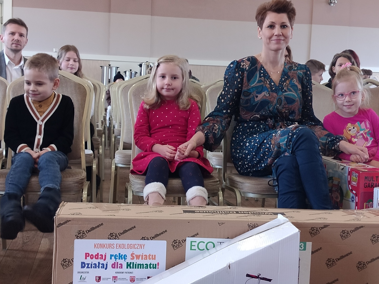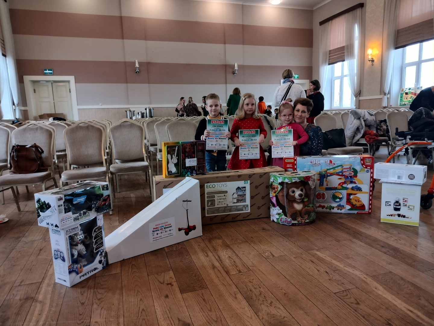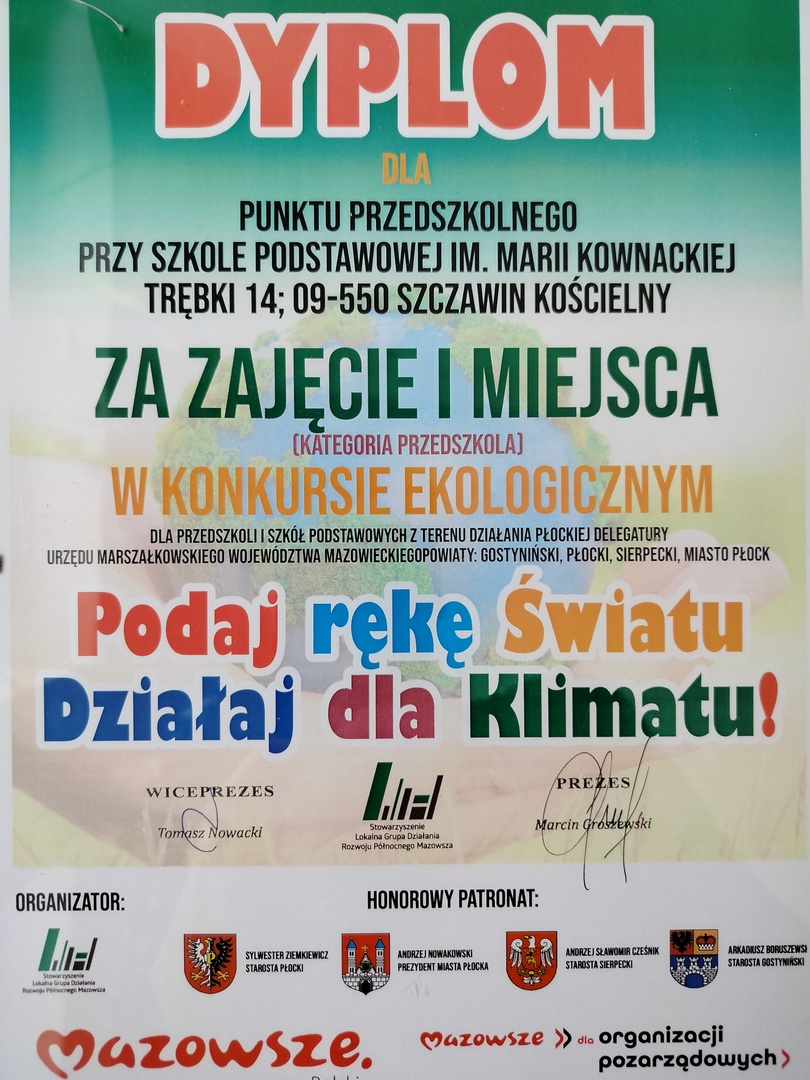 W dniu 16 grudnia 2022 r. nastąpiło rozdanie nagród z konkursu ekologicznego pt. ,,Podaj rękę światu, działaj dla klimatu”, organizowanego przez Stowarzyszenie Lokalna Grupa Działania ,,Rozwoju Północnego Mazowsza”, w ramach realizacji zadania publicznego województwa mazowieckiego. Podczas uroczystej Gali która odbyła się w Sali Galowej jednostki Ochotniczej Straży Pożarnej w Gąbinie, nastąpiło oficjalne wręczenie nagród. Trójka naszych dzieci z Punktu Przedszkolnego- Luiza Rutkowska, Emilia Dzięcielewska i Leon Sierant zajęli I miejsce w kategorii ,,Przedszkole”. Podczas uroczystości zwycięzcą konkursu zostały wręczone dyplomy i nagrody rzeczowe. Dzieci odebrały nagrody z rąk Zastępcy Dyrektora Departamentu Polityki Ekologicznej, Geologii i Łowiectwa Urzędu Marszałkowskiego Województwa Mazowieckiego, zarazem przewodniczącego Komisji Konkursowej Andrzeja Różyckiego, Wicestarosty Gostynińskiego Marii Wróblewskiej oraz Wicestarosty Płockiego Iwony Sierockiej. Konkurs ekologiczny realizowany przez Stowarzyszenie LGD ,,Rozwoju Północnego Mazowsza” w ramach projektu finansowanego ze środków Urzędu Marszałkowskiego Województwa Mazowieckiego.