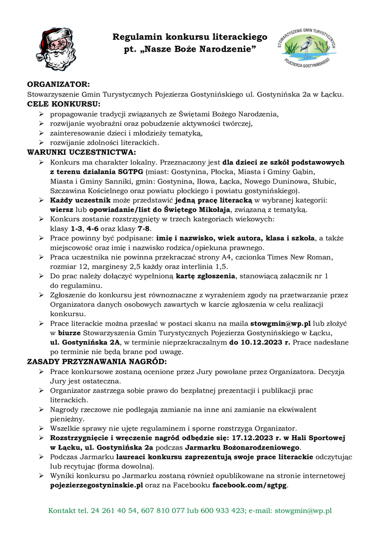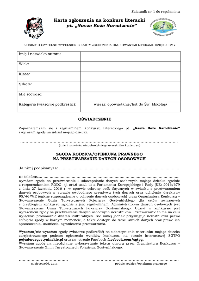 Karta zgłoszenia na konkurs literacki [155.60 kB] Regulamin Konkurs Bożonarodzeniowy [133.55 kB]
