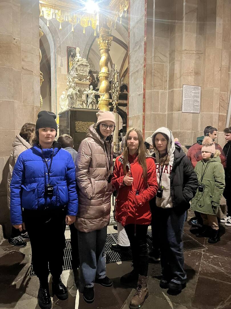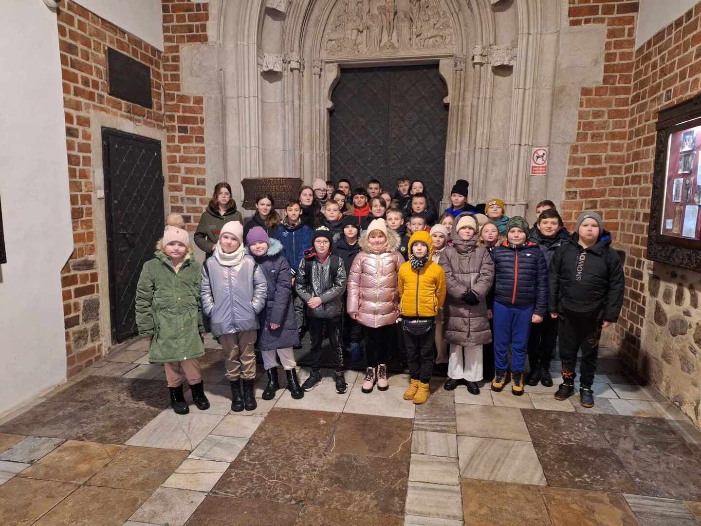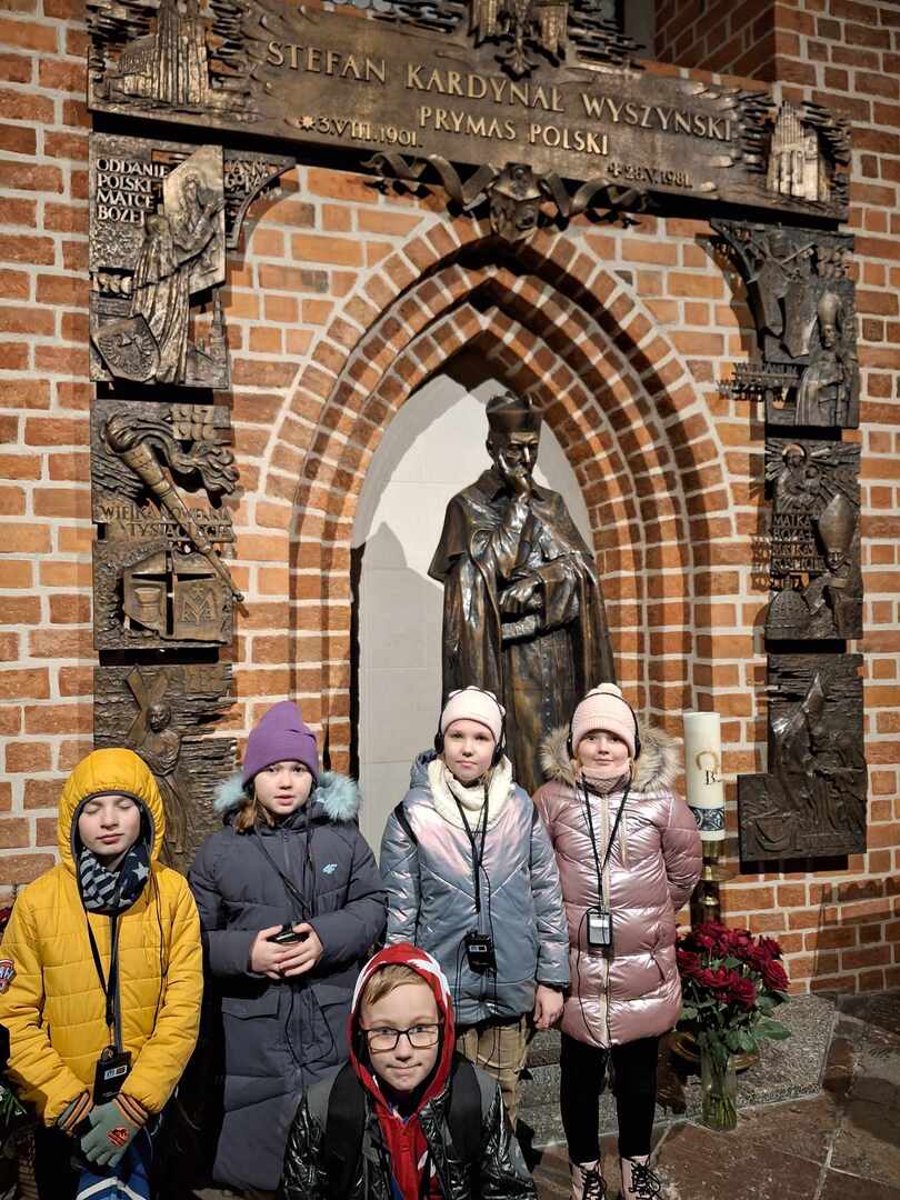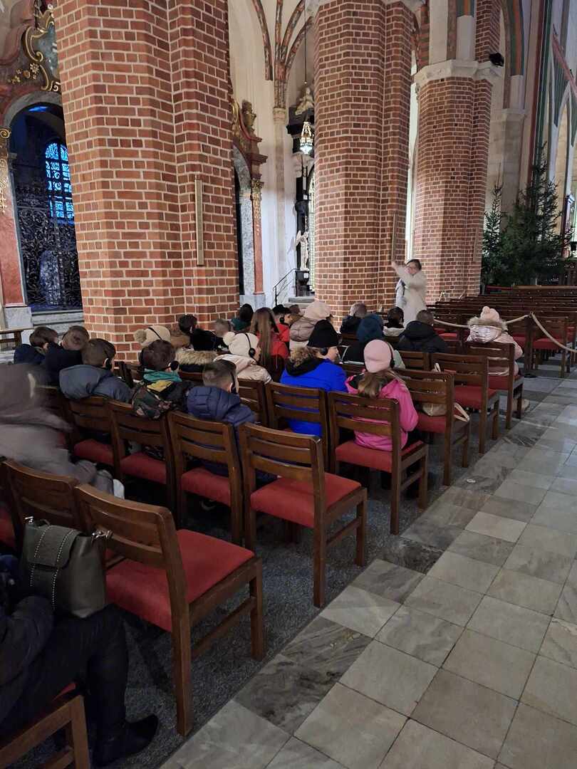 Kolejnym punktem naszej wycieczk było zwiedzanie położonej na Wzgórzu Lecha Katedry, zwanej „MATKĄ KATEDR”. Uczniowie zobaczyli między innymi srebrny relikwiarz św. Wojciecha i Drzwi Gnieźnieńskie z ilustracjami życia i męczeńskiej śmierci świętego. Z wielkim zainteresowaniem słuchali opowieści przewodnika.