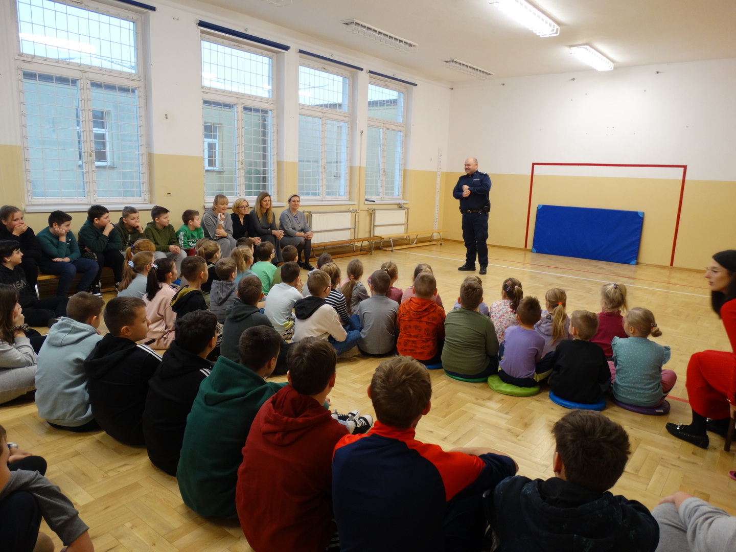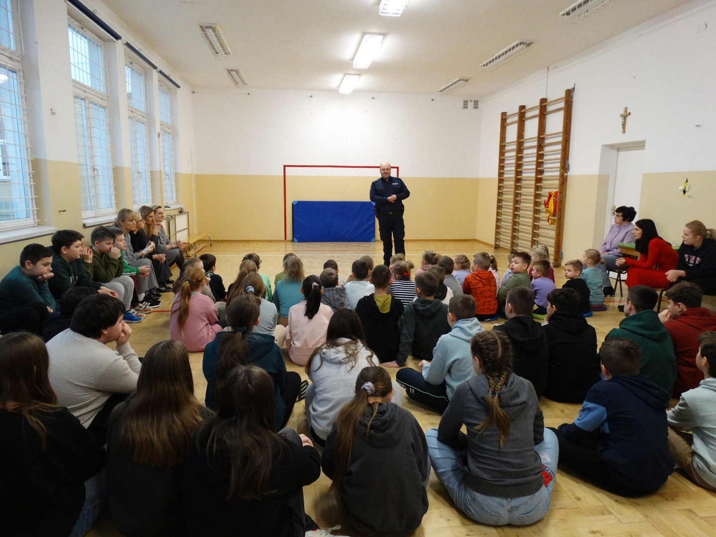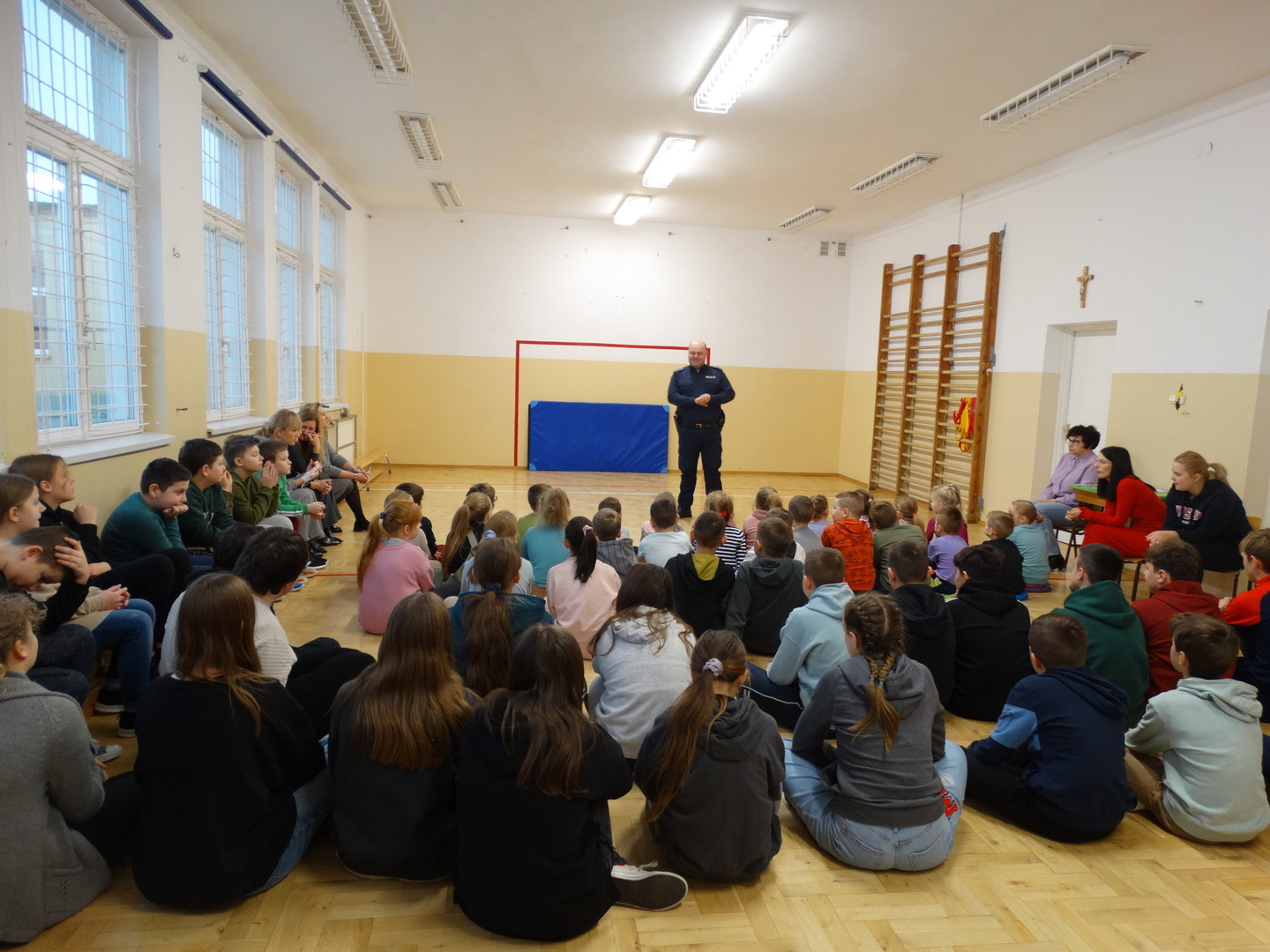 11 stycznia 2024 r. w naszej szkole odbyło się spotkanie z dzielnicowym terenu gminy Szczawin Kościelny asp. szt. Arnoldem Zarębą, w którym udział wzięły dzieci z oddziału przedszkolnego oraz kl. I-VIII. Funkcjonariusz policji przypomniał o zagrożeniach mogących pojawić się w trakcie ferii i przypomniał zasady zachowania bezpieczeństwa podczas uprawiania sportów zimowych, gier i zabaw na świeżym powietrzu. Wskazał również na konieczność właściwego zachowania się w czasie przebywania w domu.