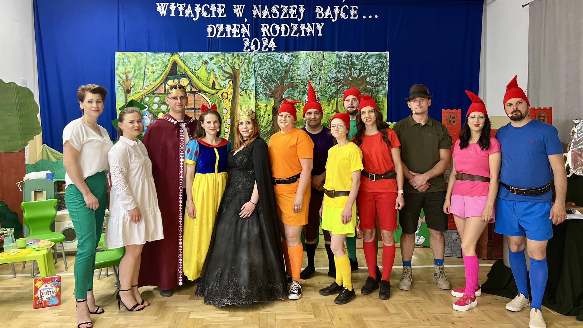 28 maja 2024 r. odbył się przedszkolny ,,DZIEŃ RODZINY” pt. ,,WITAJCIE W NASZEJ BAJCE…”z udziałem rodziców w roli głównej. Po raz drugi w naszej szkole rodzice dzieci z Punktu i Oddziału Przedszkolnego wcielili się w role aktorów i zagrali w przedstawieniu dla dzieci. Tym razem wykonali bajkę pt. ,,Królewna Śnieżka i siedmiu krasnoludków”, a na widowni zasiedli zaproszeni goście, wychowankowie przedszkola i rodzice. Atrakcyjność przedstawienia dodatkowo zwiększyła odpowiednio dobrana scenografia, kolorowe stroje aktorów. Utalentowani rodzice i wyjątkowa oprawa muzyczna przyczyniła się do powstania wspaniałego, artystycznego widowiska.