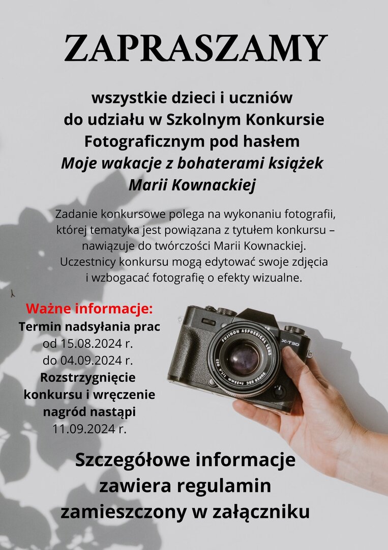 Serdecznie zapraszamy wszystkie dzieci i uczniów do udziału w Szkolnym Konkursie Fotograficznym pod hasłem Moje wakacje z bohaterami książek Marii Kownackiej. Zadanie konkursowe polega na wykonaniu fotografii, której tematyka jest powiązana z tytułem konkursu – nawiązuje do twórczości Marii Kownackiej. Zachęcamy do zapoznania się z treścią regulaminu, który zawiera szczegółowe informacje dotyczące Konkursu.