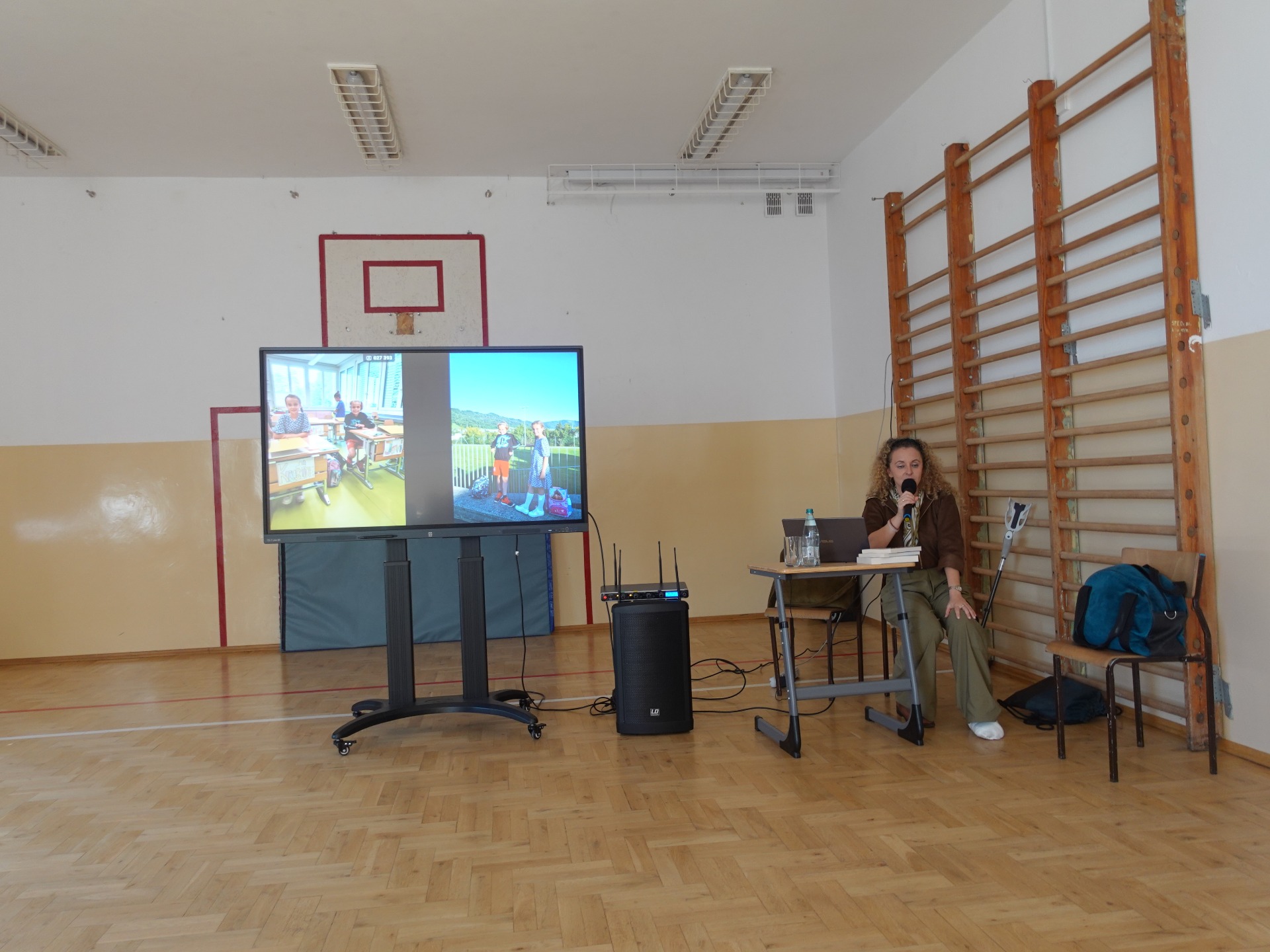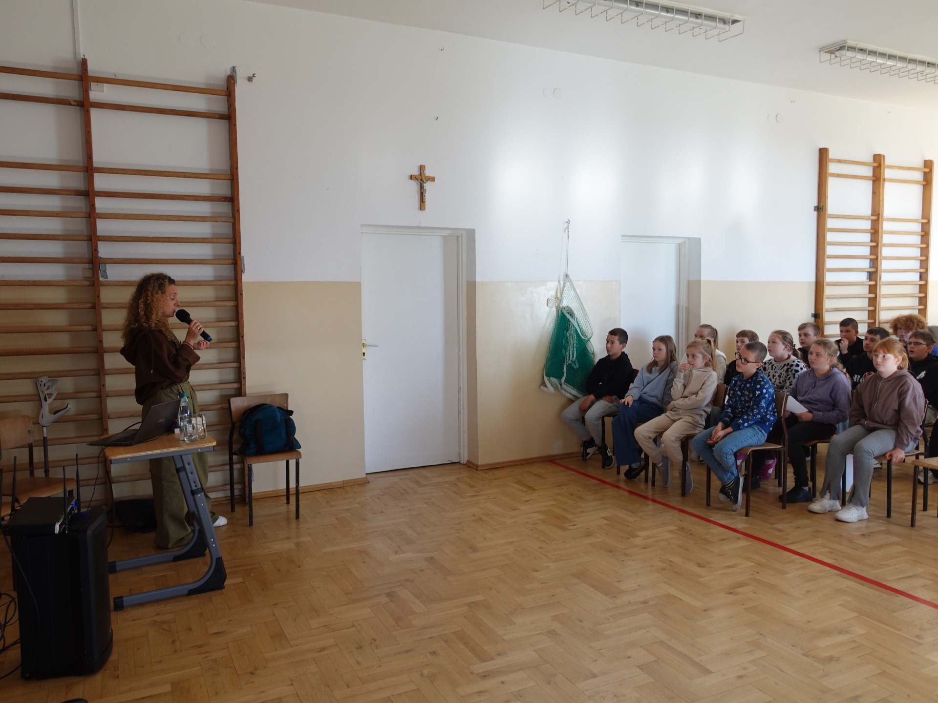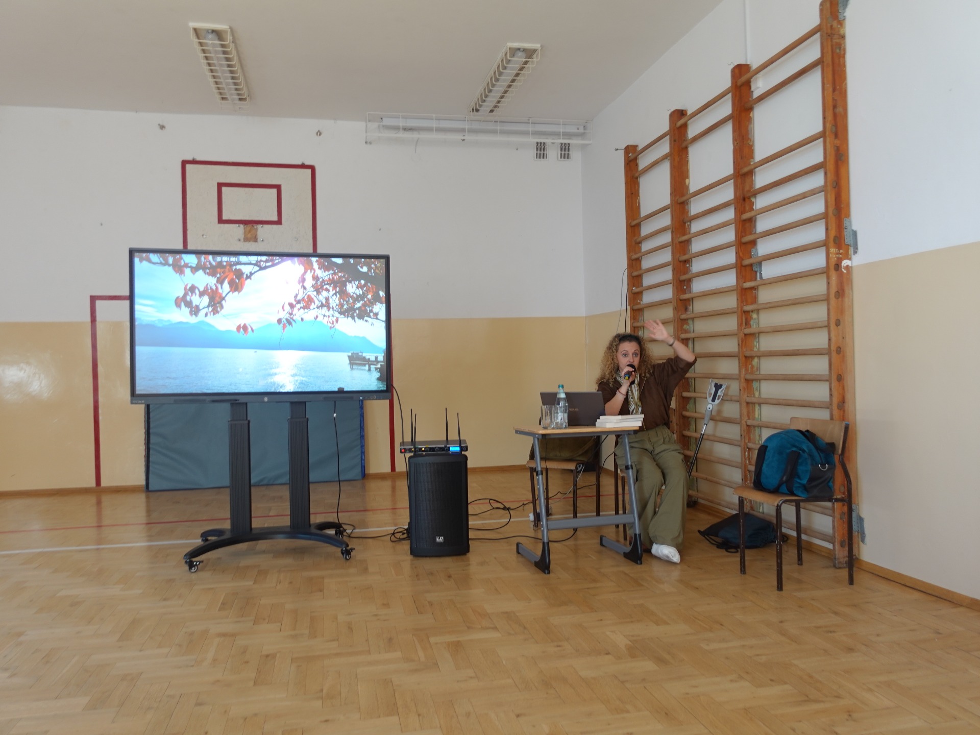 Dnia 2 października 2025 r. mieliśmy zaszczyt i ogromną przyjemność gościć Panią Martynę Górniak - Pełech, autorkę książek "Optymistka" i “Dzieci wielojęzyczne”. Pani Martyna jest również podróżniczką, która zwiedziła 35 krajów. Dzięki prezentacji multimedialnej, którą dla nas przygotowała, zobaczyliśmy, jak wygląda życie w Szwajcarii. Opowiedziała nam o kulturze i tradycjach, jakie tam panują. Szczególnie zainteresowała nas szkoła i organizacja zajęć. Wielokrotnie podkreślała, jak ważne są marzenia. Dzięki nim możemy przezwyciężyć największe trudności i zdobyć to, co pragniemy mieć. Zaszczepiła w nas ciekawość świata i zainspirowała do odbywania podróży, tych małych i tych dużych. Wizyta to uświadomiła nam również, jak ważne jest poznawanie i nauka języków obcych, ile korzyści daje nam umiejętność władania nimi.