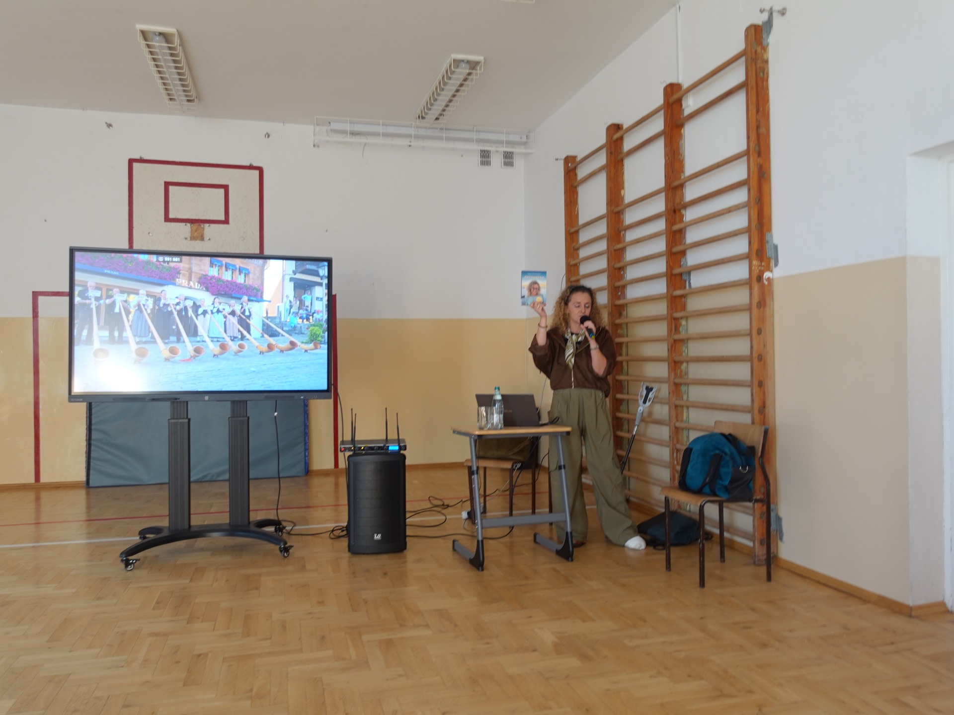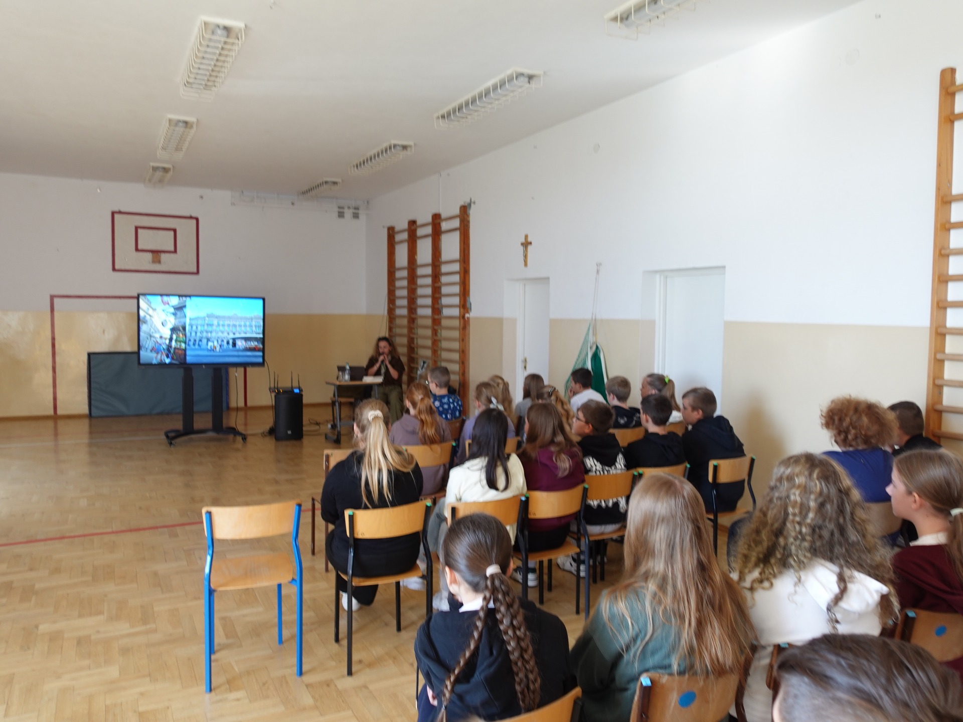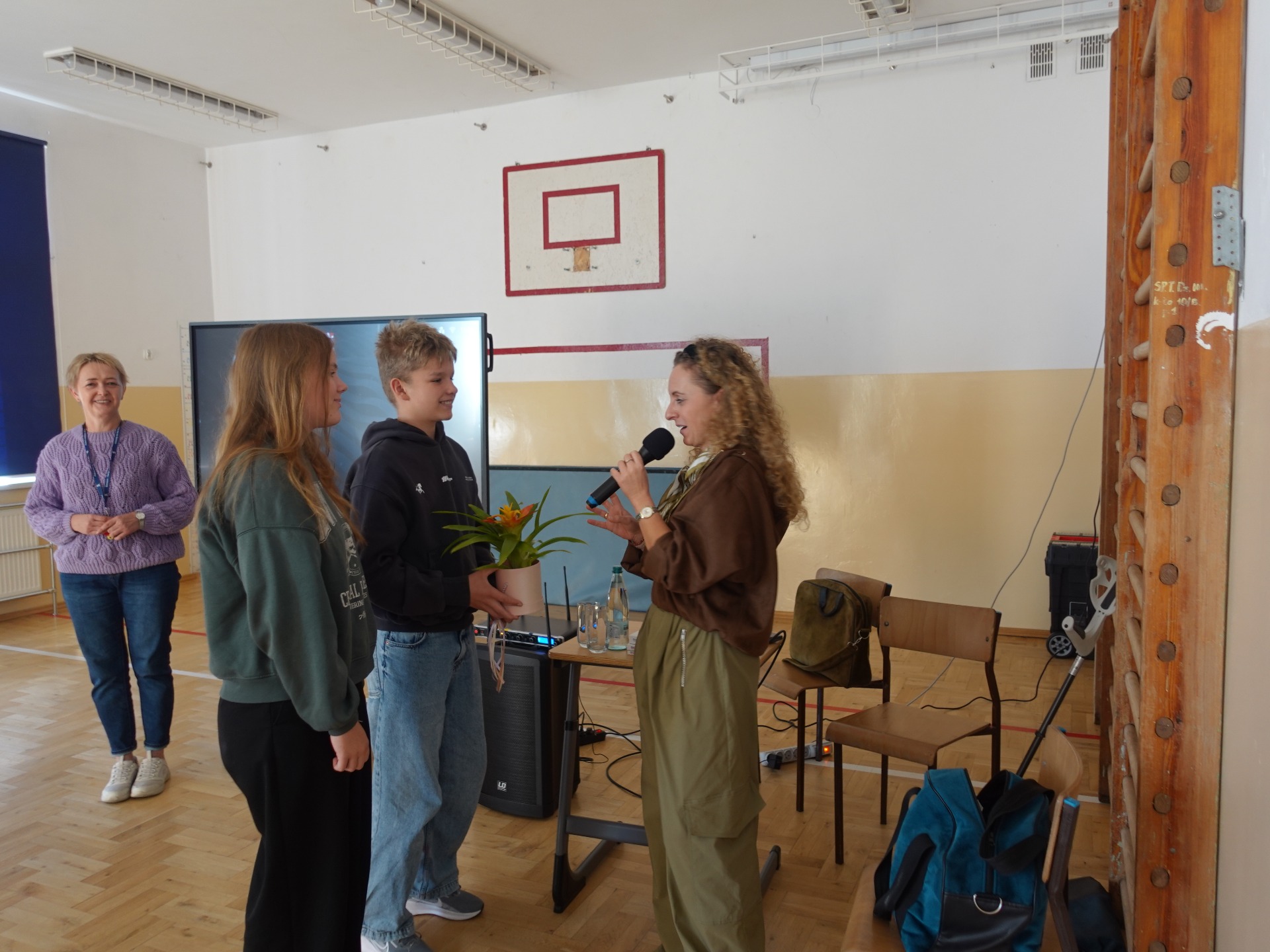 Dnia 2 października 2025 r. mieliśmy zaszczyt i ogromną przyjemność gościć Panią Martynę Górniak - Pełech, autorkę książek "Optymistka" i “Dzieci wielojęzyczne”. Pani Martyna jest również podróżniczką, która zwiedziła 35 krajów. Dzięki prezentacji multimedialnej, którą dla nas przygotowała, zobaczyliśmy, jak wygląda życie w Szwajcarii. Opowiedziała nam o kulturze i tradycjach, jakie tam panują. Szczególnie zainteresowała nas szkoła i organizacja zajęć. Wielokrotnie podkreślała, jak ważne są marzenia. Dzięki nim możemy przezwyciężyć największe trudności i zdobyć to, co pragniemy mieć. Zaszczepiła w nas ciekawość świata i zainspirowała do odbywania podróży, tych małych i tych dużych. Wizyta to uświadomiła nam również, jak ważne jest poznawanie i nauka języków obcych, ile korzyści daje nam umiejętność władania nimi.