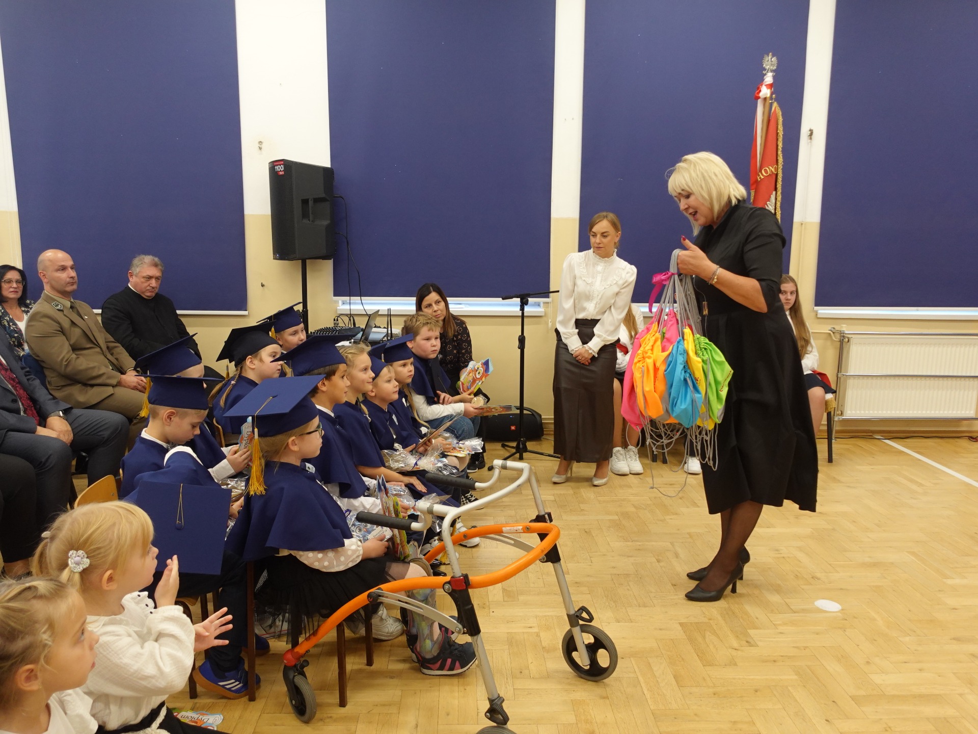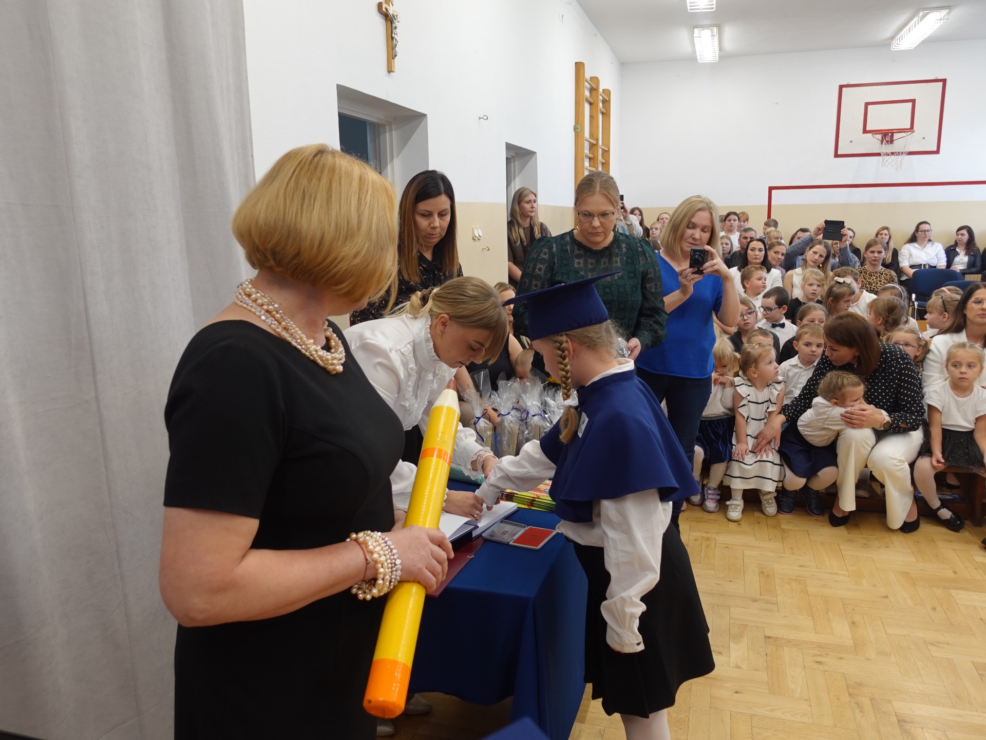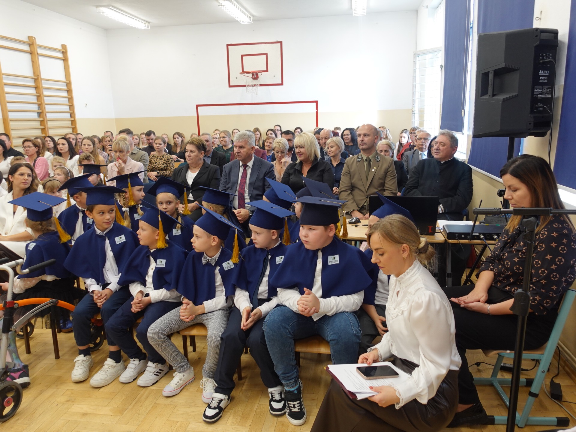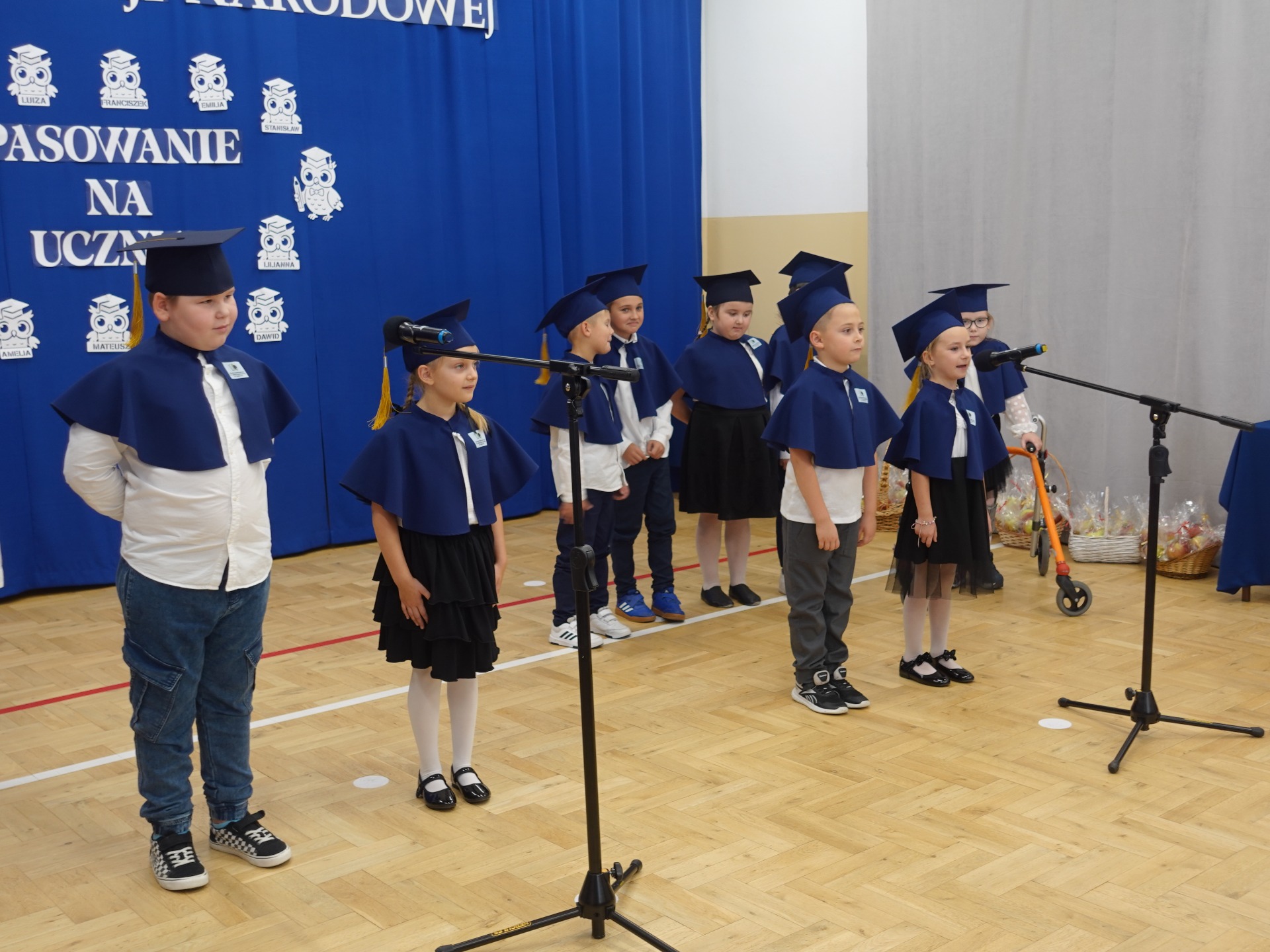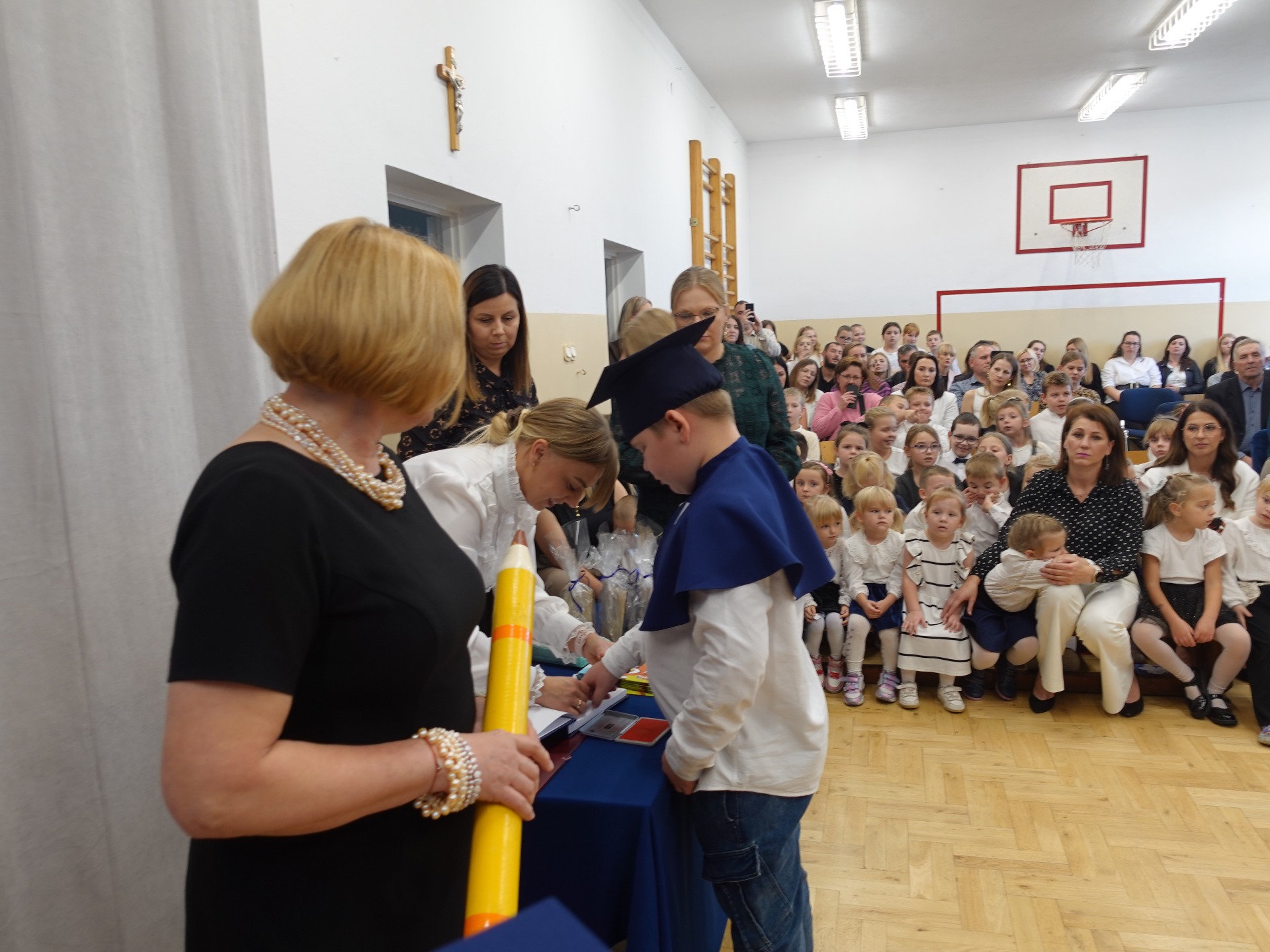 Był to szczególny dzień, który na długo pozostanie w pamięci każdego ucznia klasy pierwszej. Dzieci oficjalnie przyjęte zostały do grona uczniów naszej szkoły. Pierwszoklasiści odświętnie ubrani zaprezentowali swoje umiejętności. Recytowali wiersze, zaśpiewali i uroczyście zatańczyli specjalnie na tę okazję.