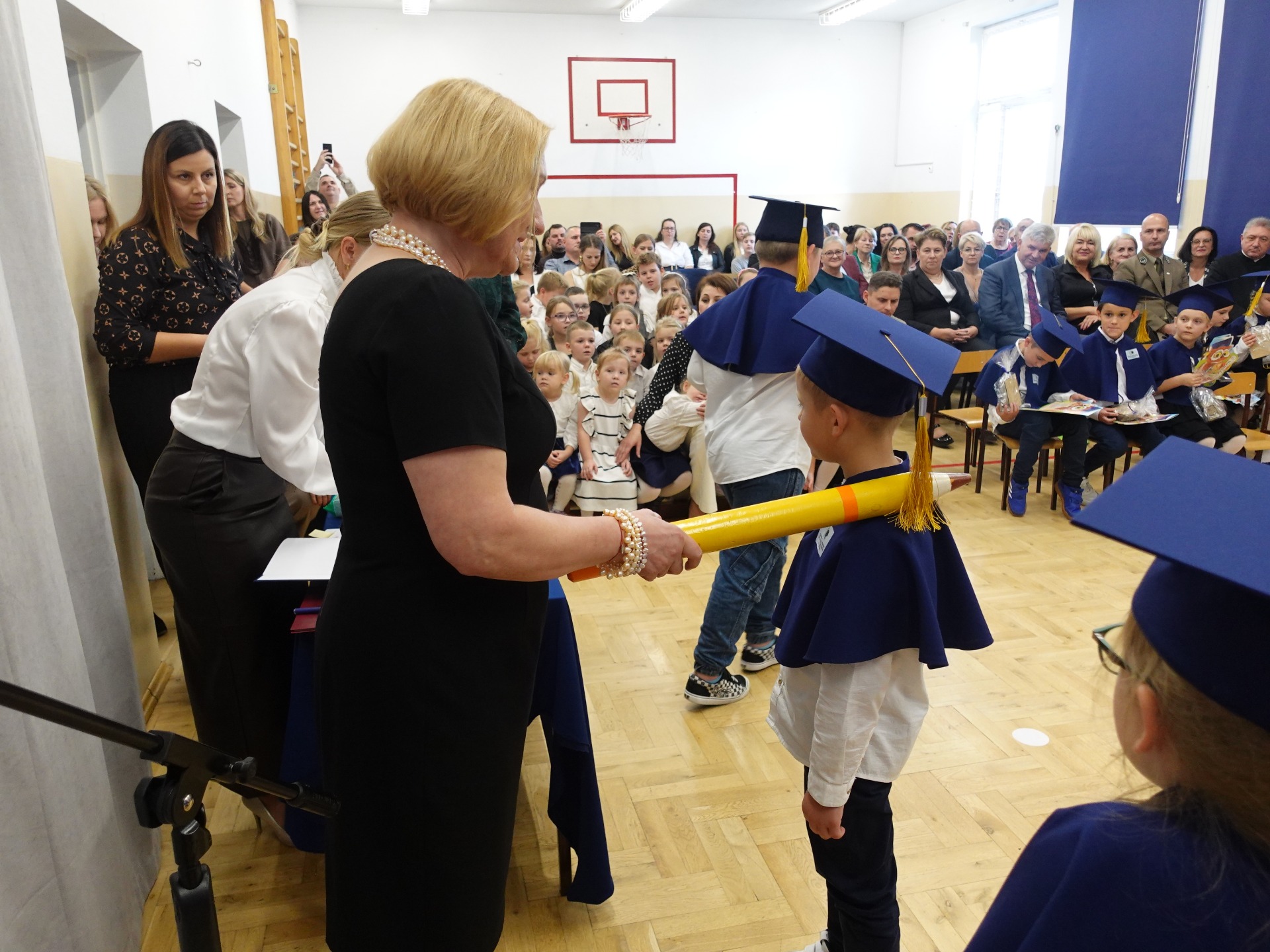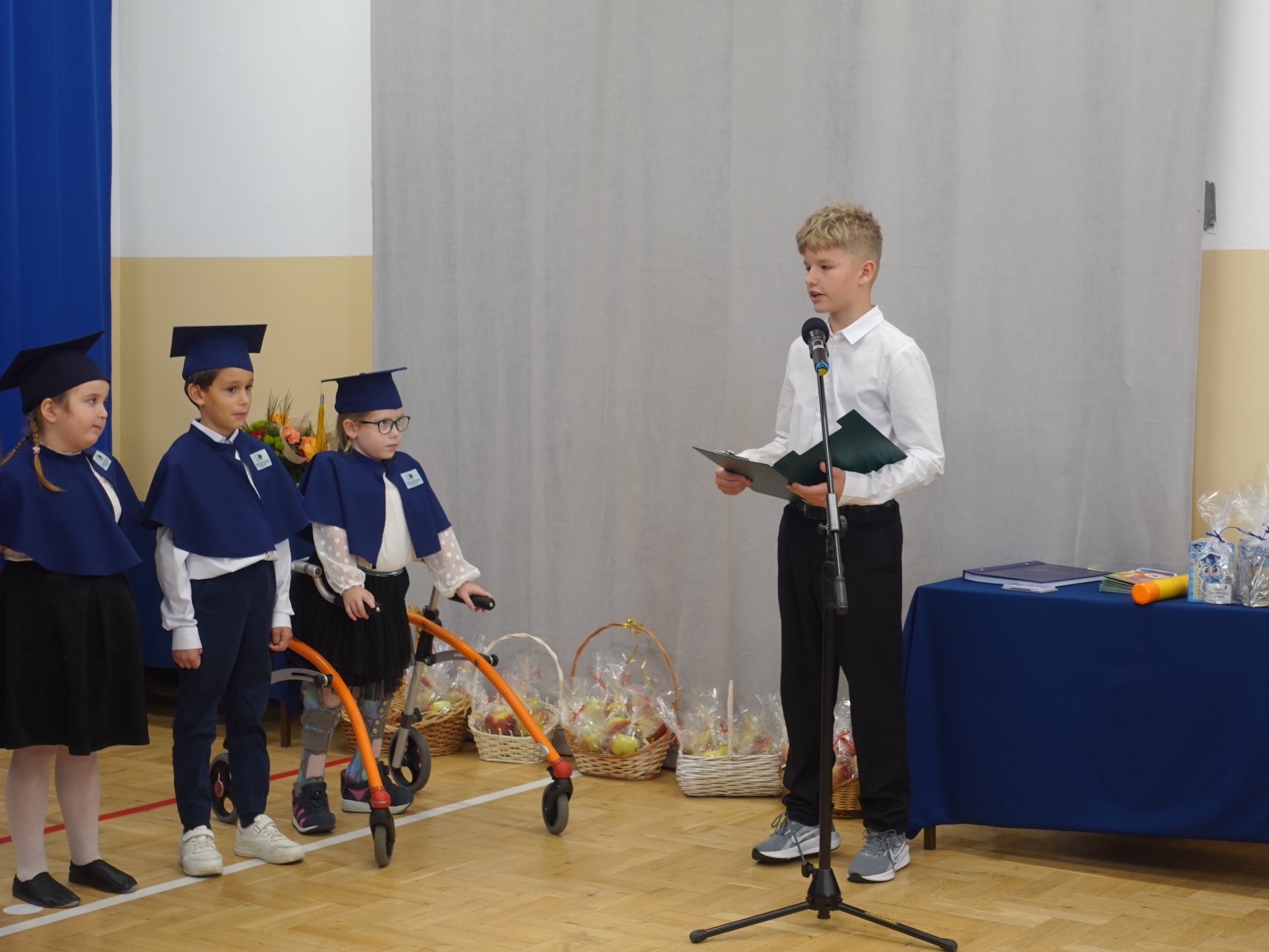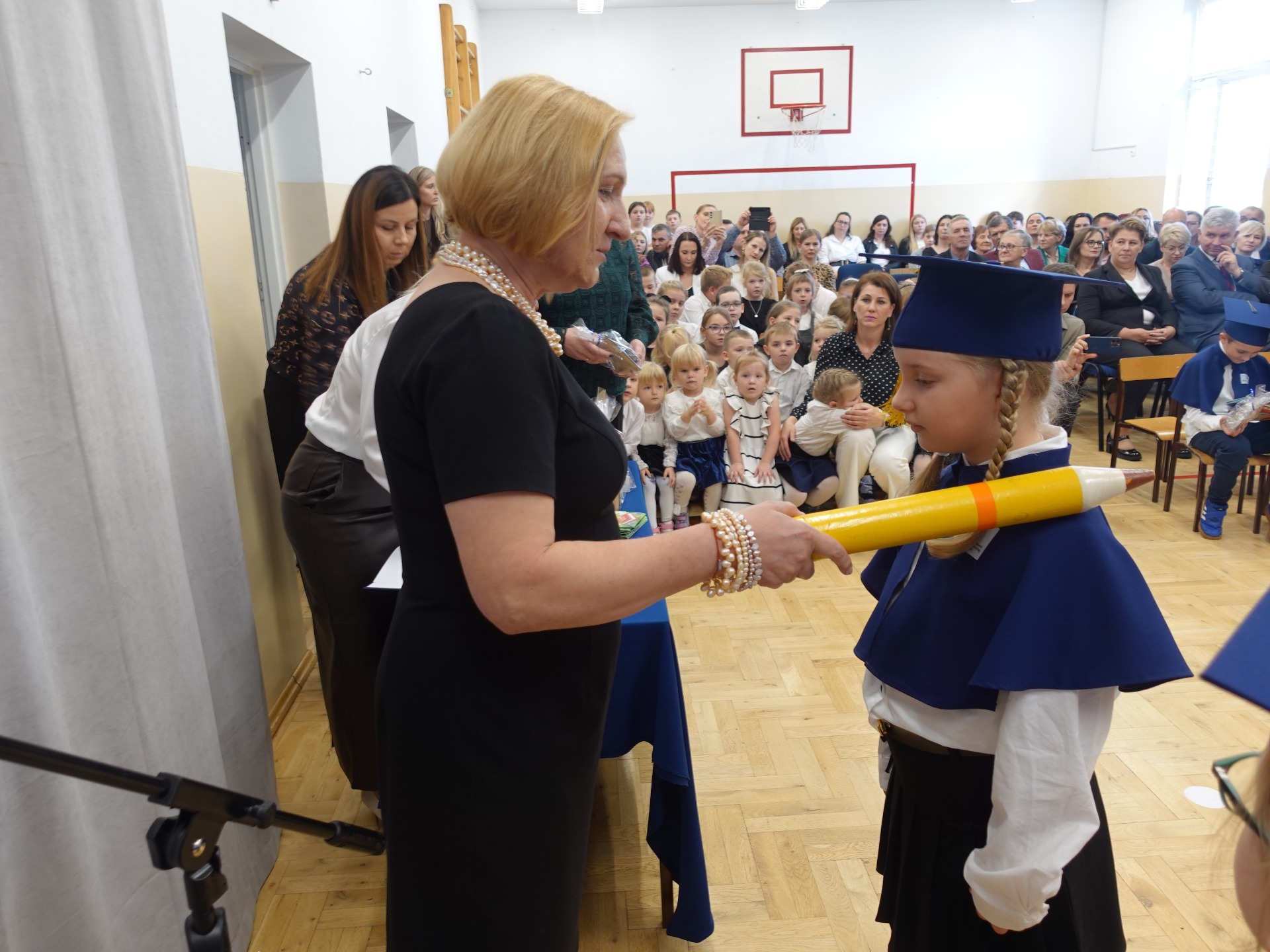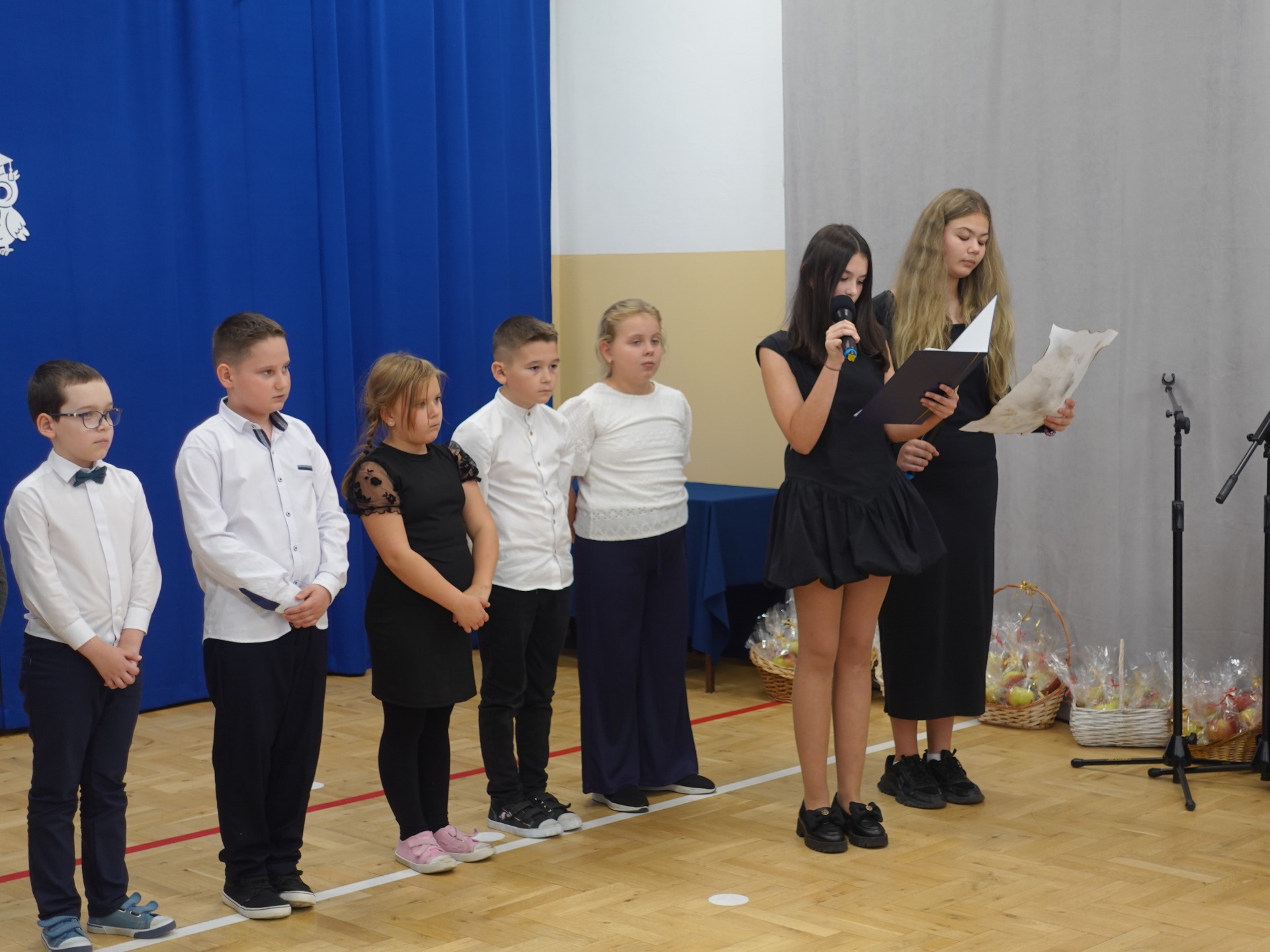 Był to szczególny dzień, który na długo pozostanie w pamięci każdego ucznia klasy pierwszej. Dzieci oficjalnie przyjęte zostały do grona uczniów naszej szkoły. Pierwszoklasiści odświętnie ubrani zaprezentowali swoje umiejętności. Recytowali wiersze, zaśpiewali i uroczyście zatańczyli specjalnie na tę okazję.