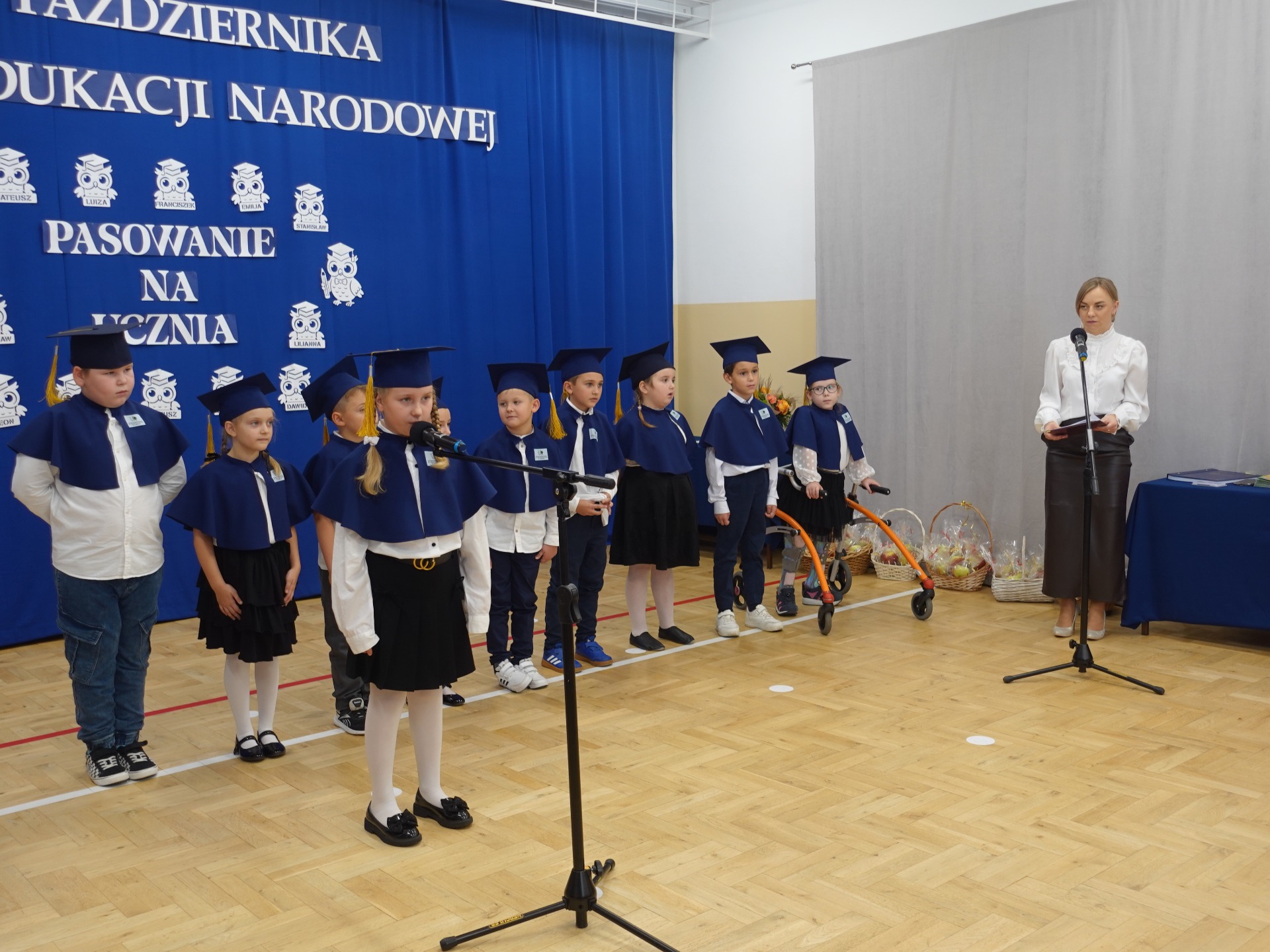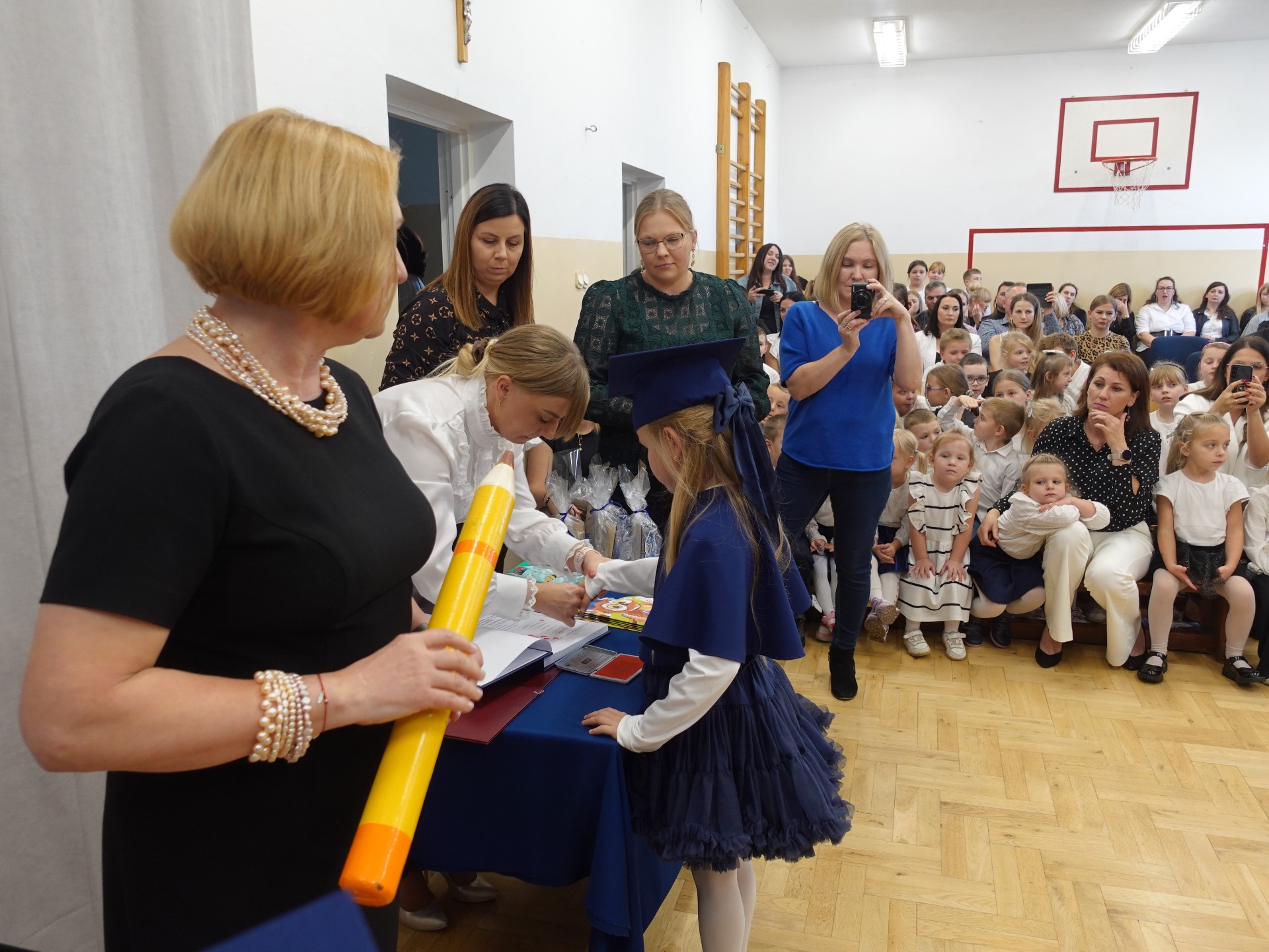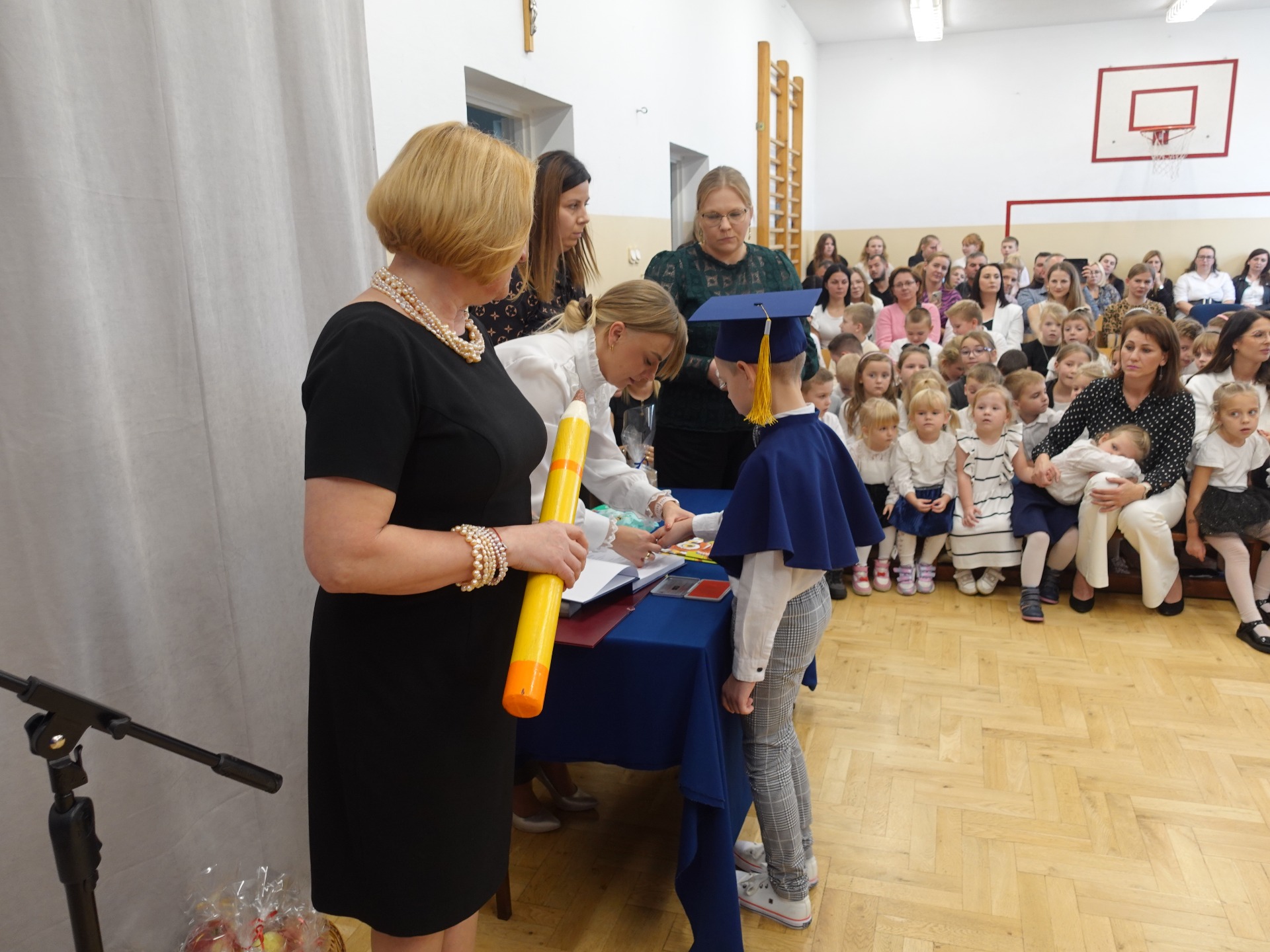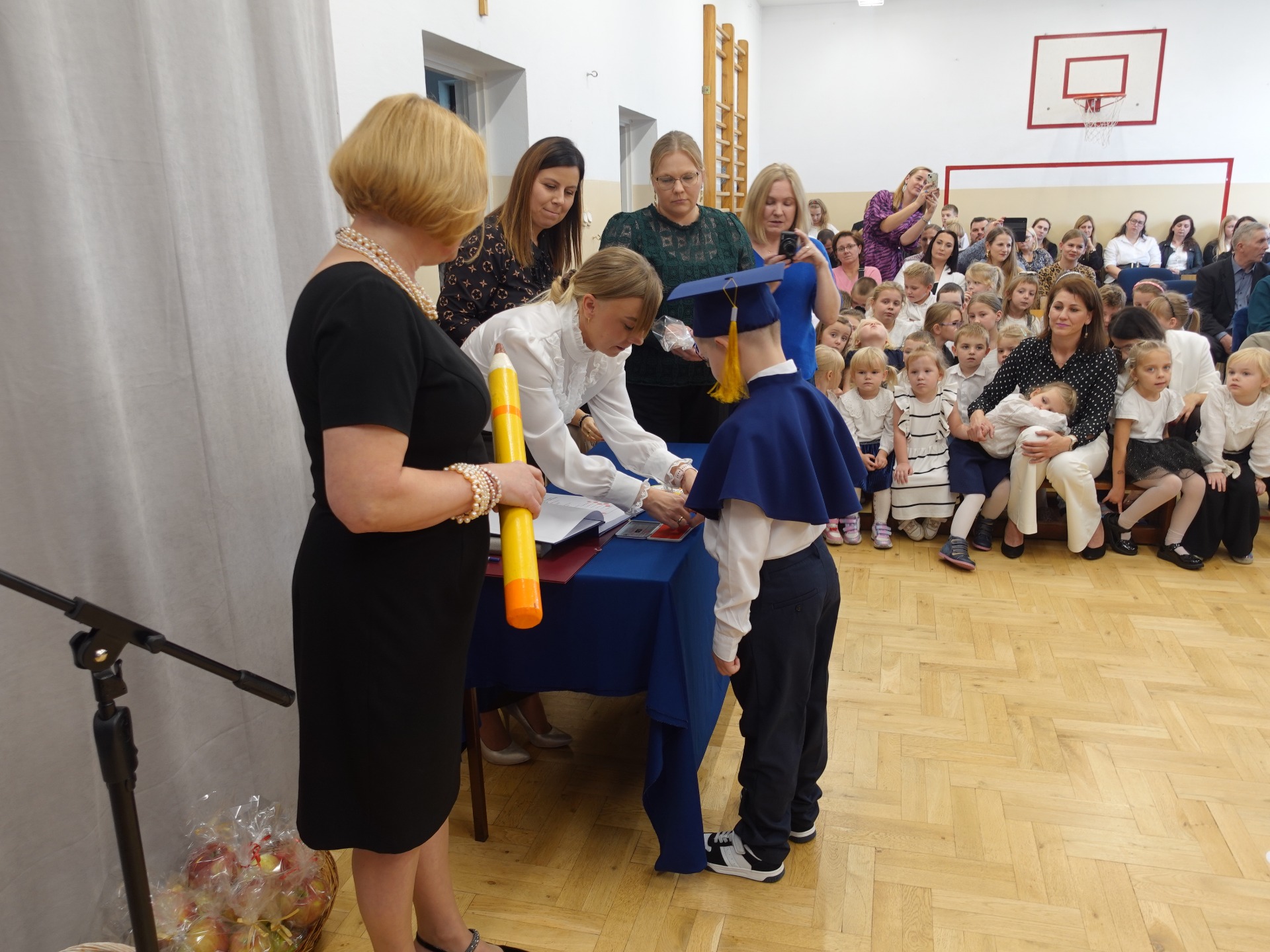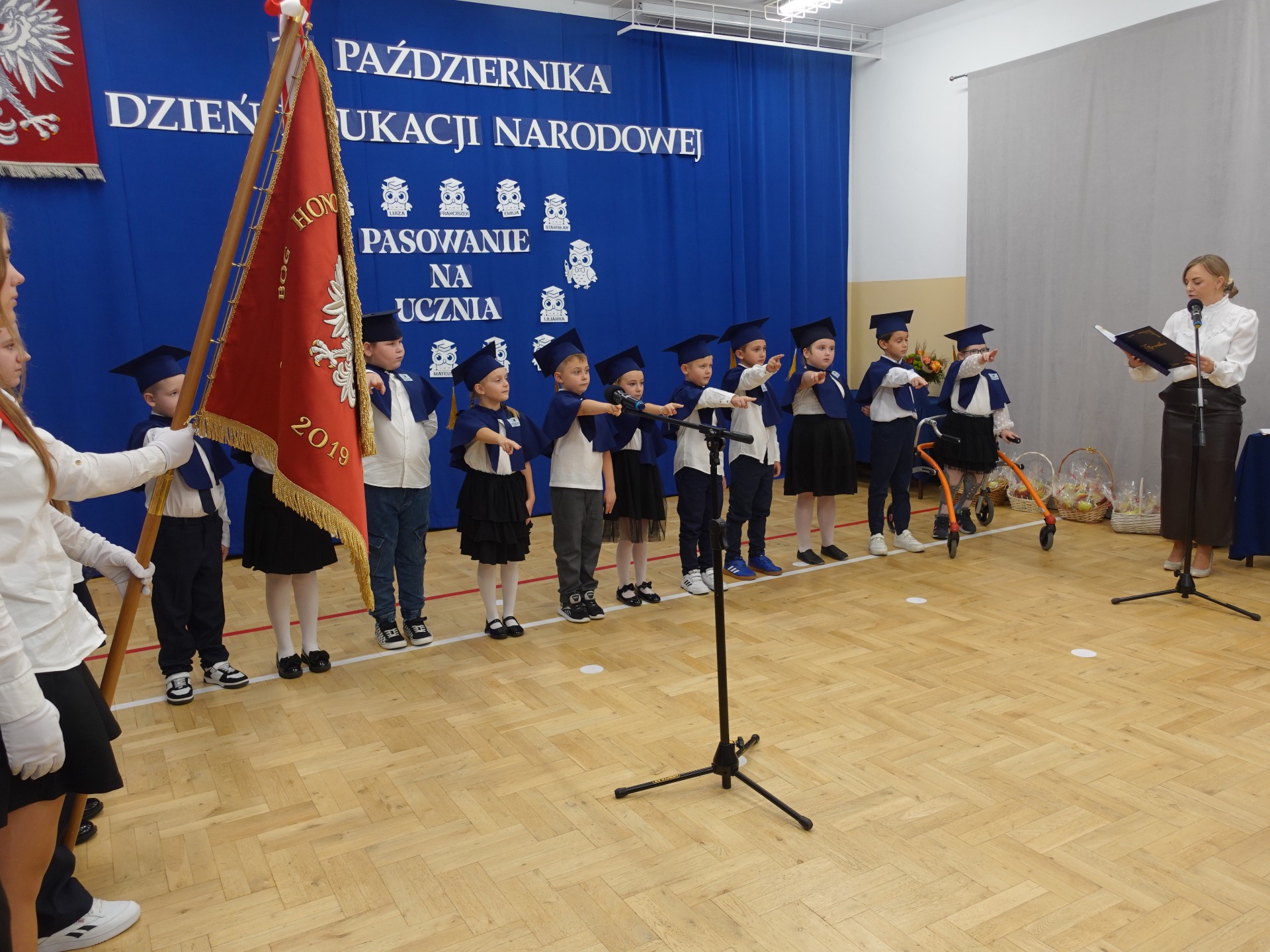 Był to szczególny dzień, który na długo pozostanie w pamięci każdego ucznia klasy pierwszej. Dzieci oficjalnie przyjęte zostały do grona uczniów naszej szkoły. Pierwszoklasiści odświętnie ubrani zaprezentowali swoje umiejętności. Recytowali wiersze, zaśpiewali i uroczyście zatańczyli specjalnie na tę okazję.