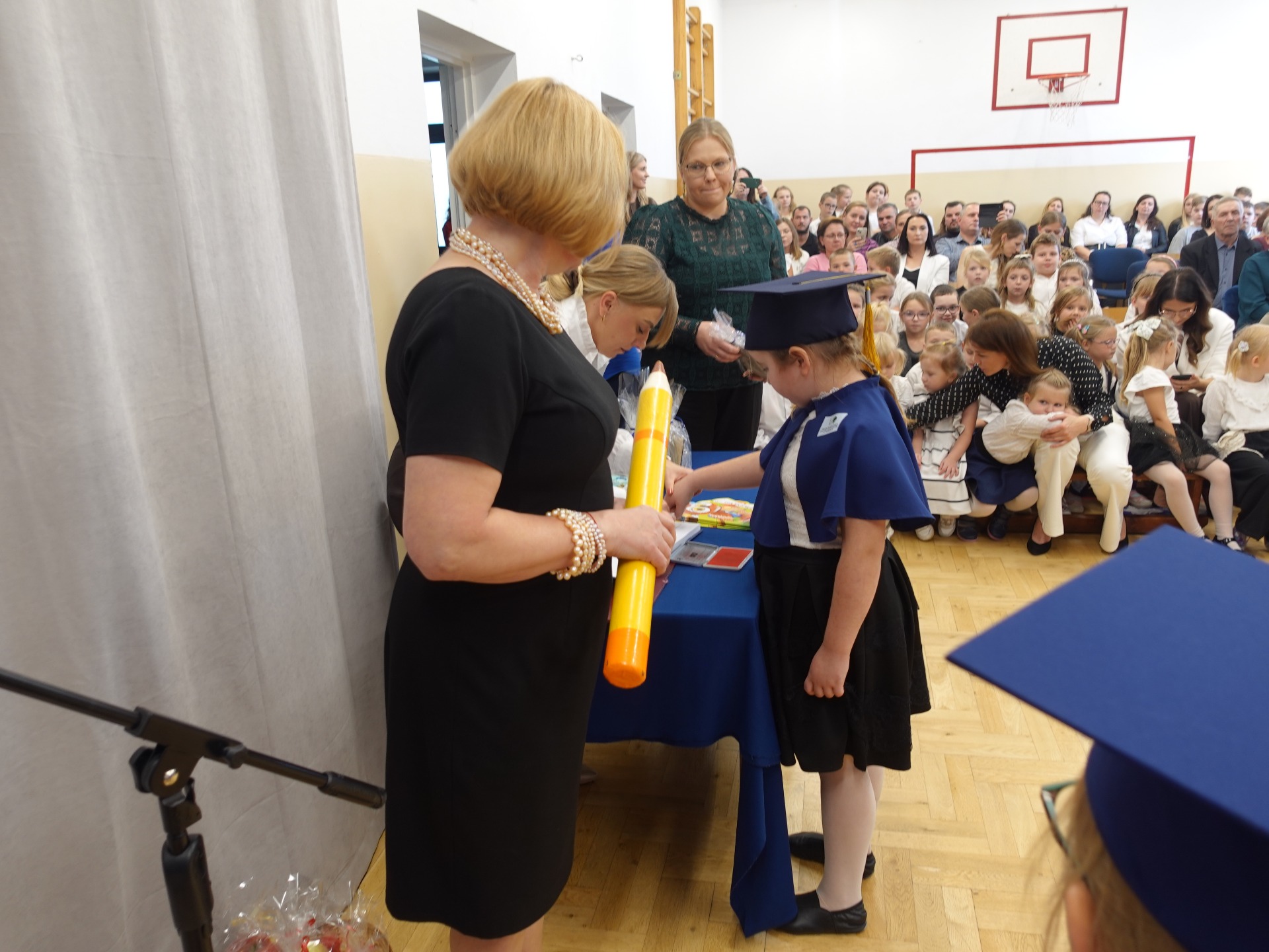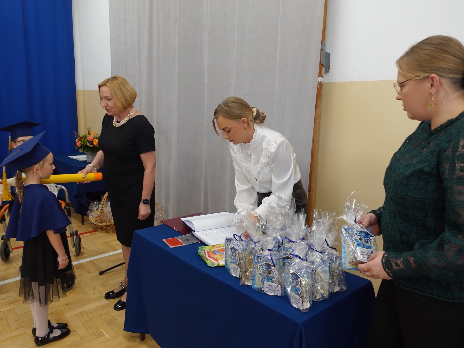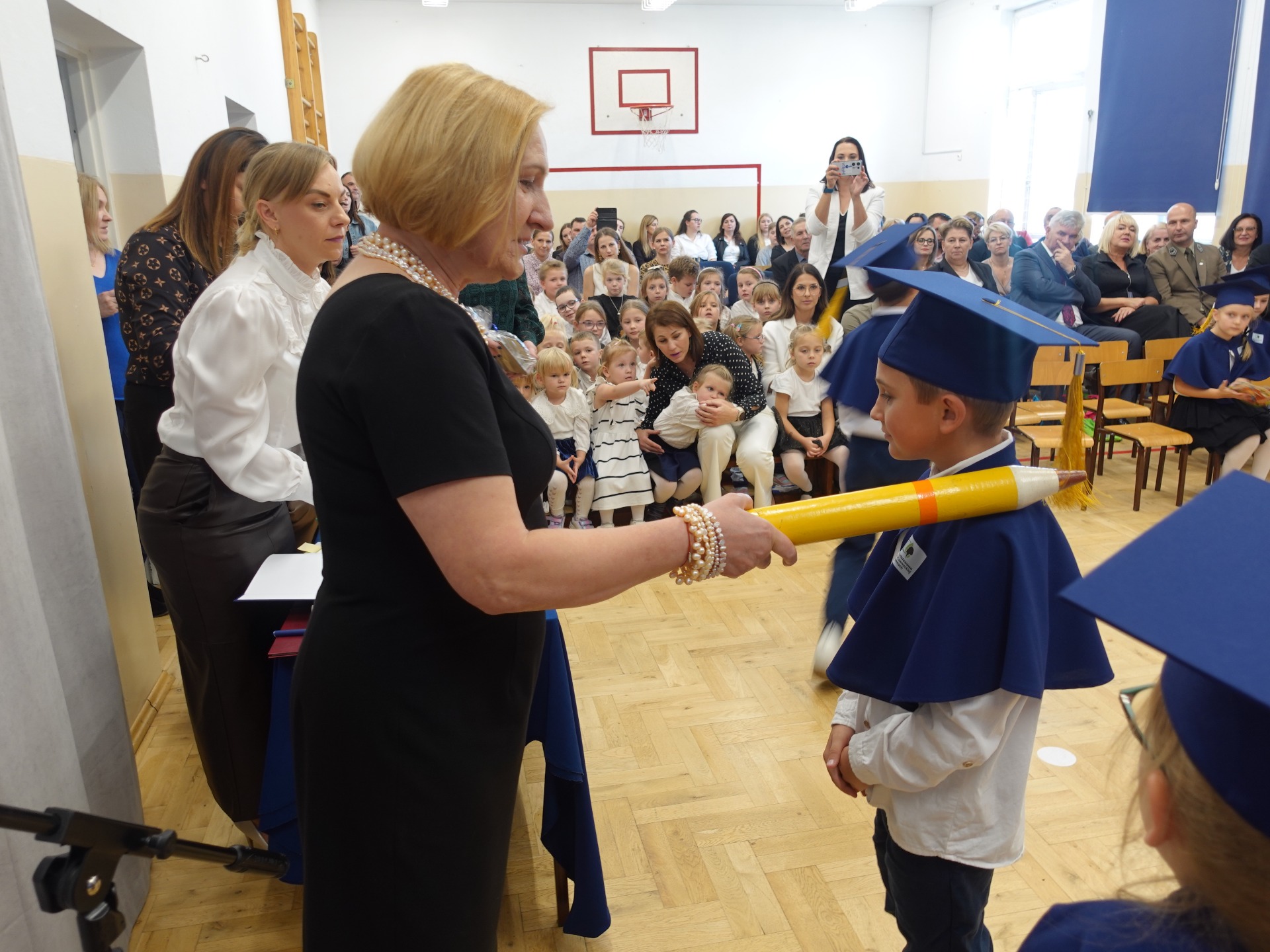 Pani Dyrektor dokonała pasowania, dotykając ramienia każdego ucznia dużym ołówkiem i wypowiadając słowa ,,Pasuję Cię na ucznia klasy pierwszej”. Odciskiem swoich paluszków, uczniowie przypieczętowali akt ślubowania w Księdze Pamiątkowej . Przewodnicząca Rady Rodziców Pani Marta Szymczak wraz z wychowawcą klasy Panią Sylwią Młocek rozdały dzieciom upominki i dyplomy.