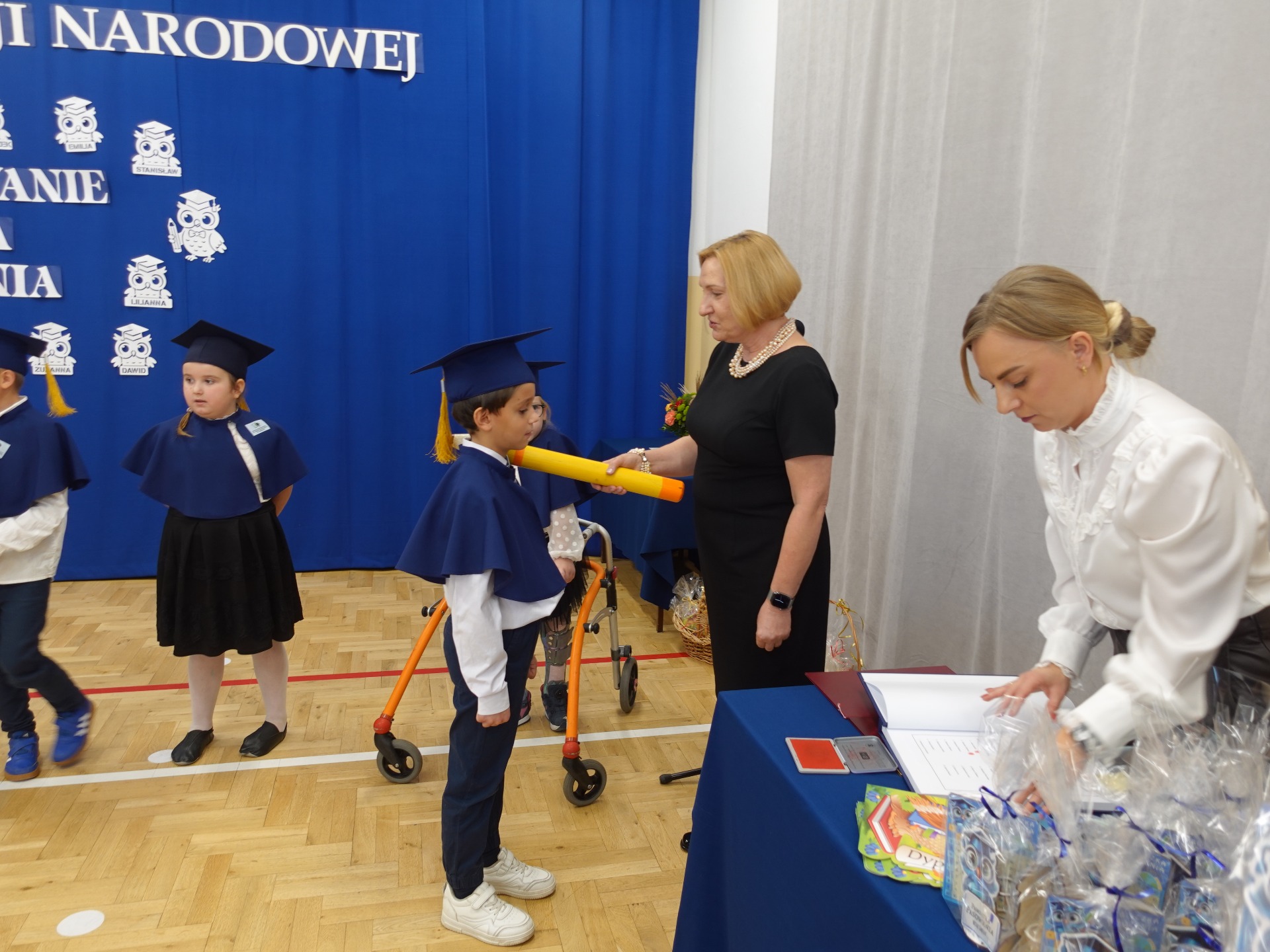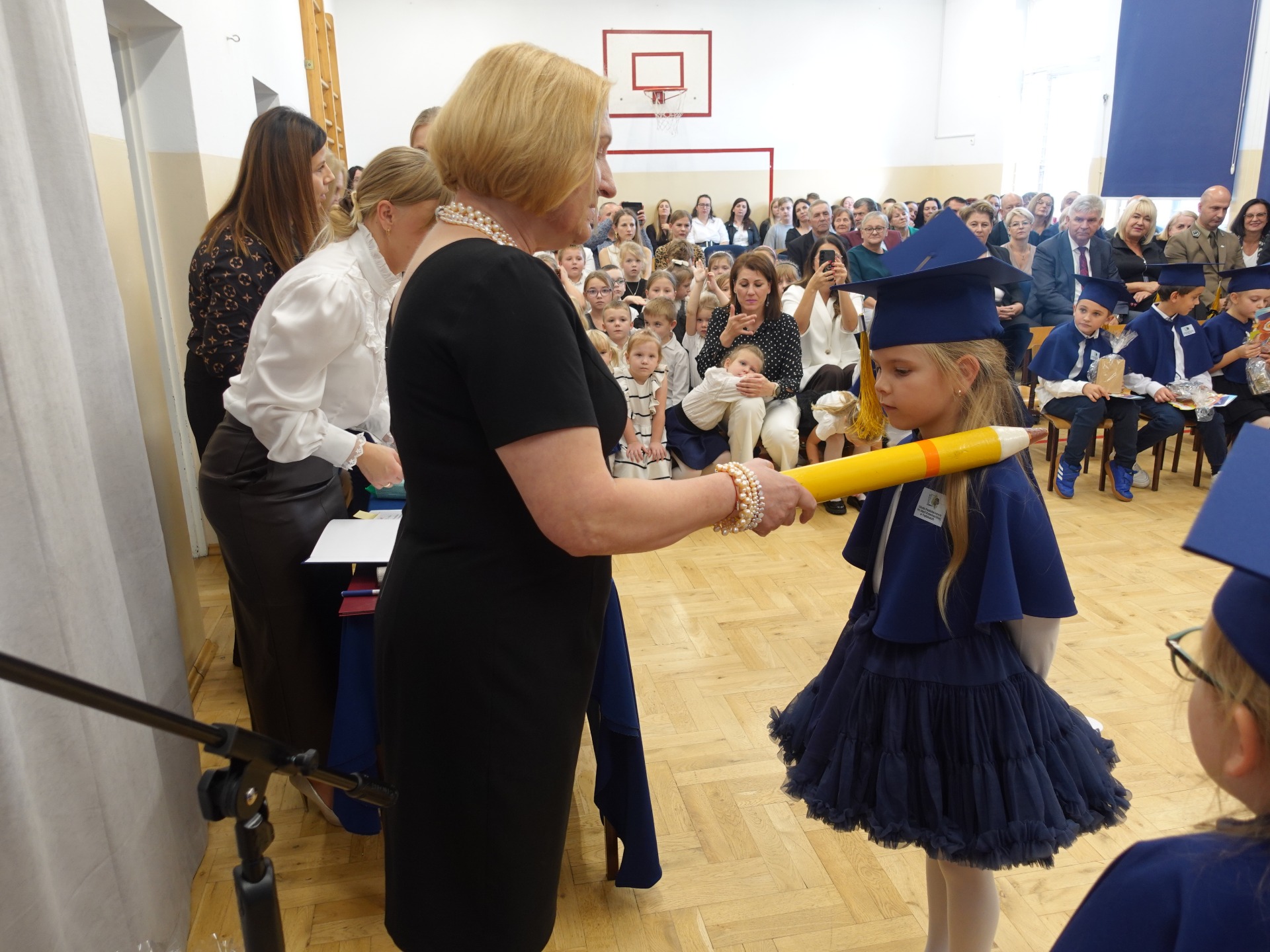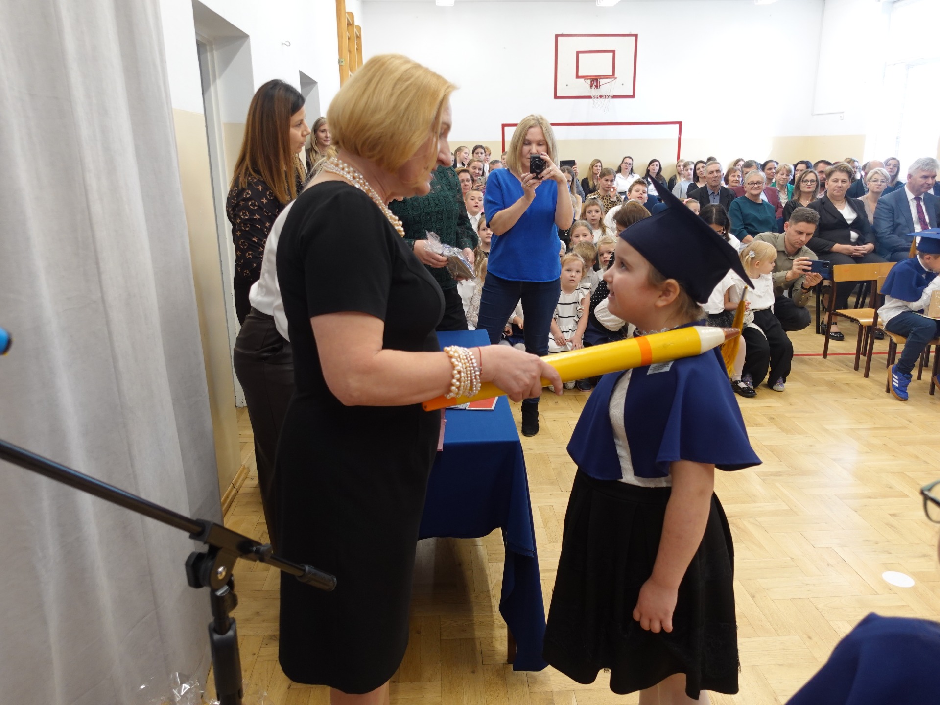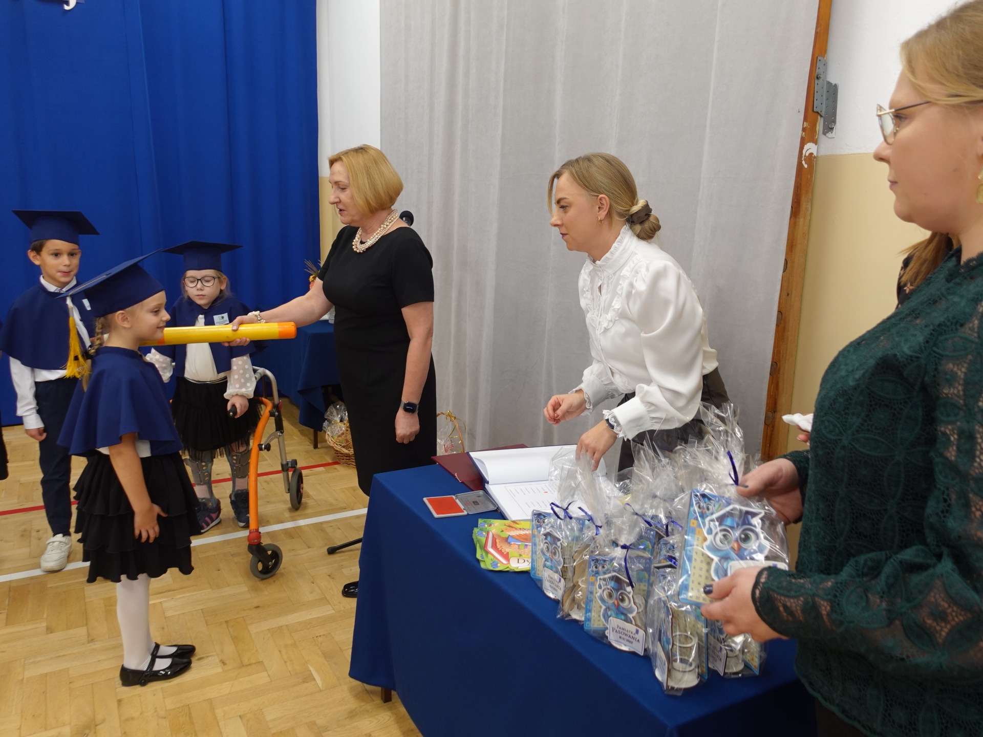 Pani Dyrektor dokonała pasowania, dotykając ramienia każdego ucznia dużym ołówkiem i wypowiadając słowa ,,Pasuję Cię na ucznia klasy pierwszej”. Odciskiem swoich paluszków, uczniowie przypieczętowali akt ślubowania w Księdze Pamiątkowej . Przewodnicząca Rady Rodziców Pani Marta Szymczak wraz z wychowawcą klasy Panią Sylwią Młocek rozdały dzieciom upominki i dyplomy.