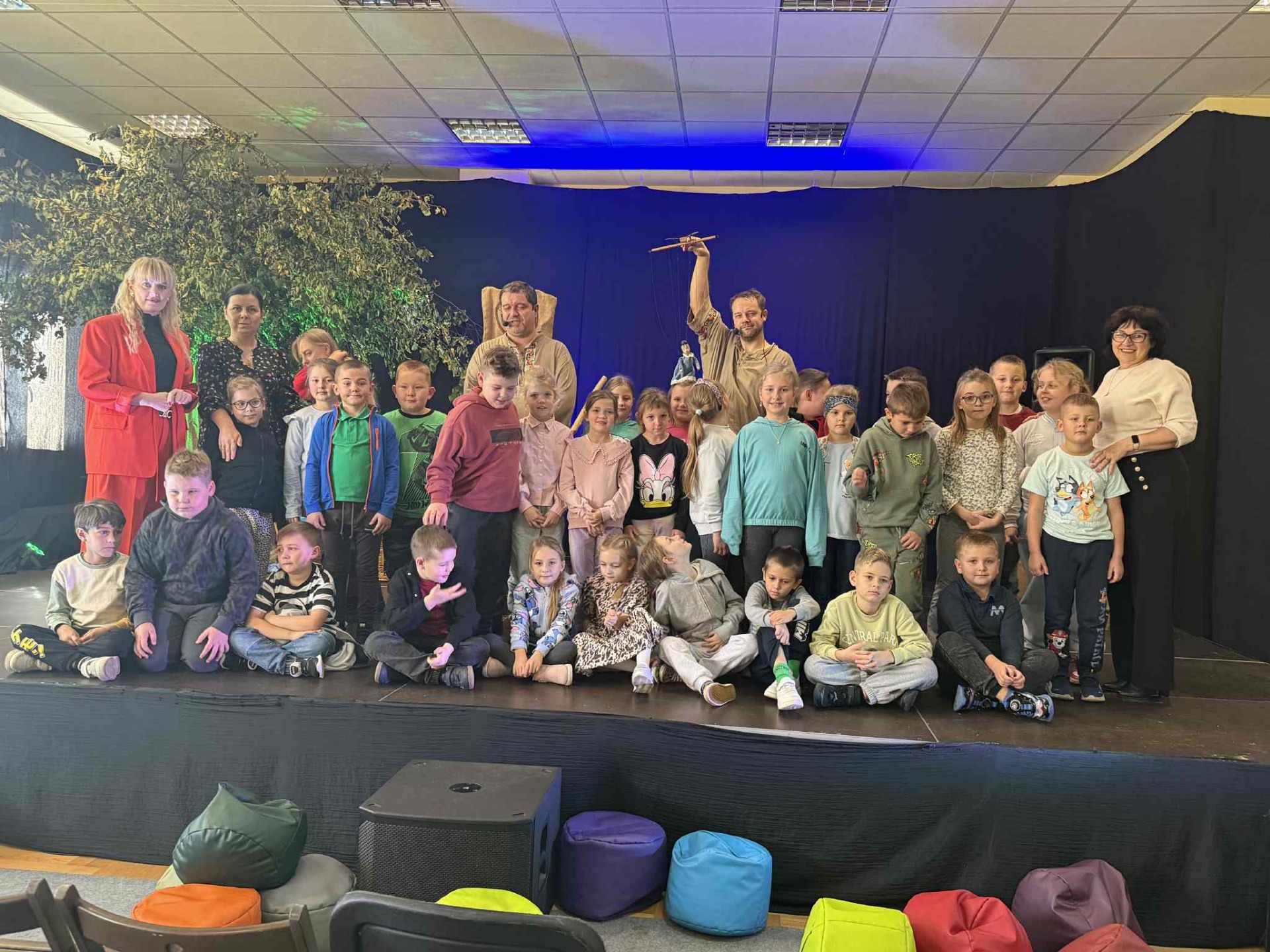 Klasy I-III na spektaklu ,,O smoku Znad Wisły” w ramach obchodów 75-lecia działalności Gminnej Biblioteki Publicznej w Szczawinie Kościelnym