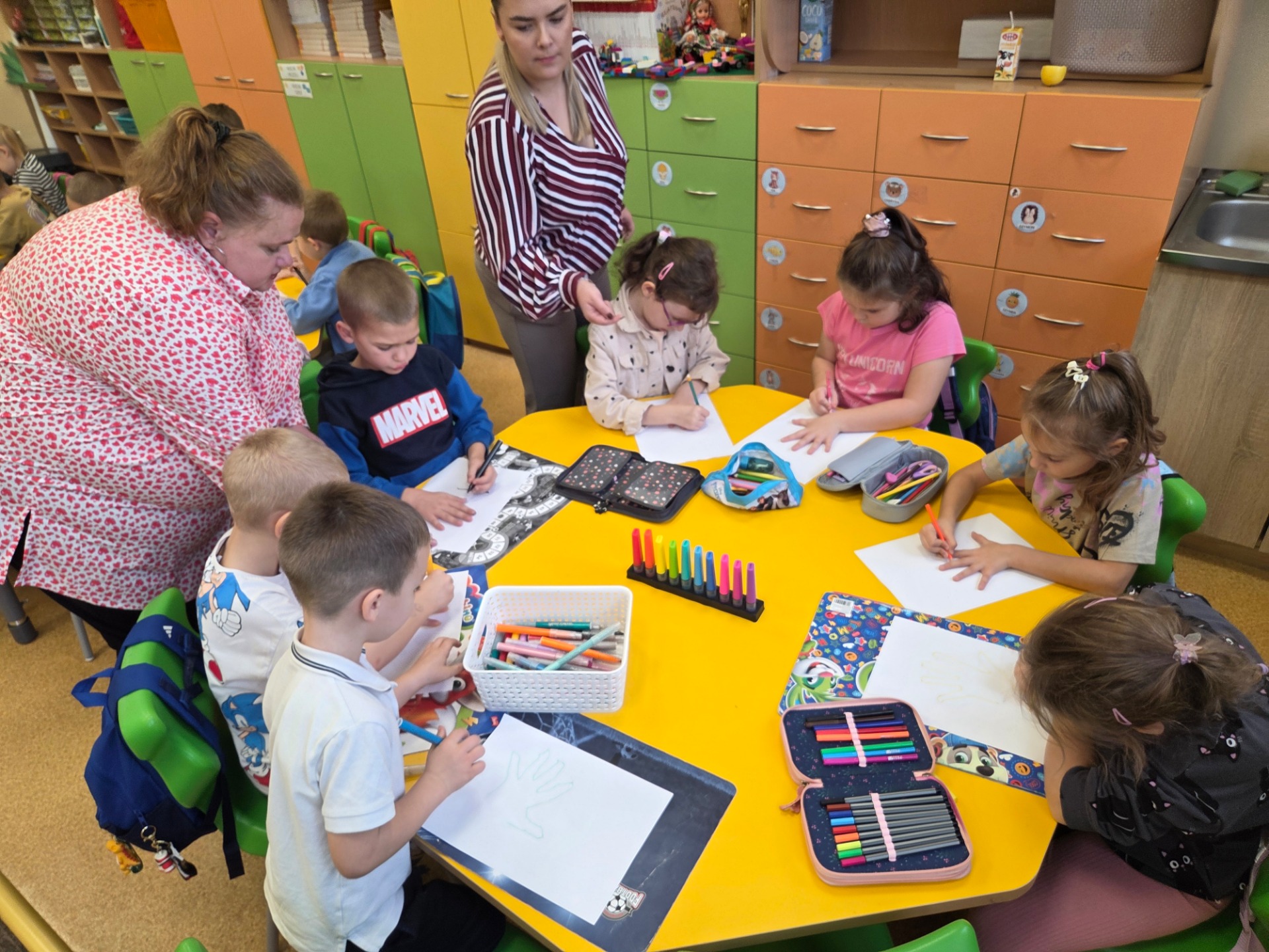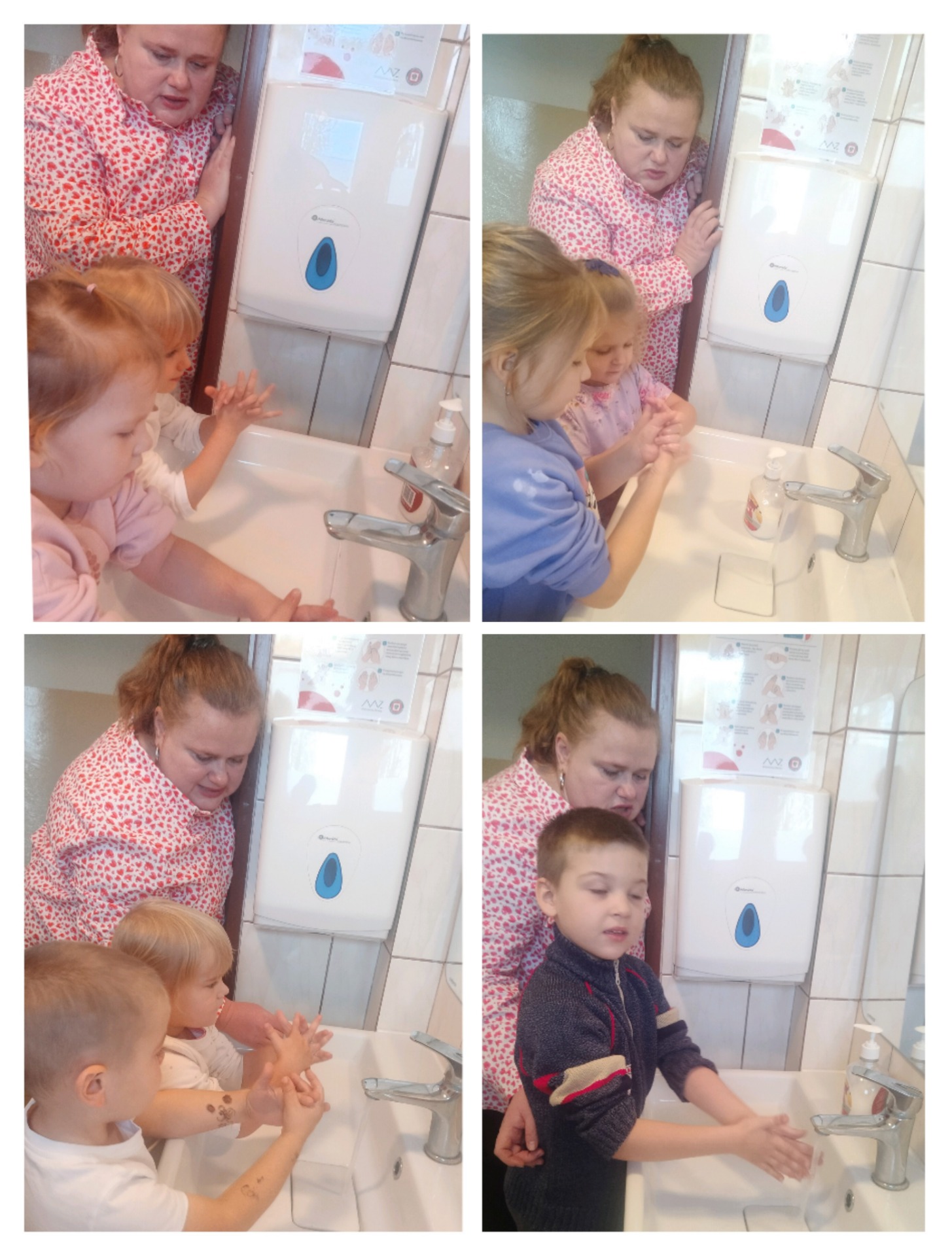 Nasz zaproszony gość pani Joanna Zając ze Stacji Sanitarno-Epidemiologicznej z Gostynina poprowadziła zajęcia na temat zdrowia, czystości rąk i tego w jaki sposób wirusy i bakterie dostają się do naszego organizmu. Przypomniała o znaczeniu prawidłowej higieny dłoni w zapobieganiu chorobom. Każdy przedszkolak miał okazję samodzielnie dokładnie umyć rączki pod czujnym okiem pani Joasi. Wspólnie wykonaliśmy prace plastyczne promujące mycie rąk.