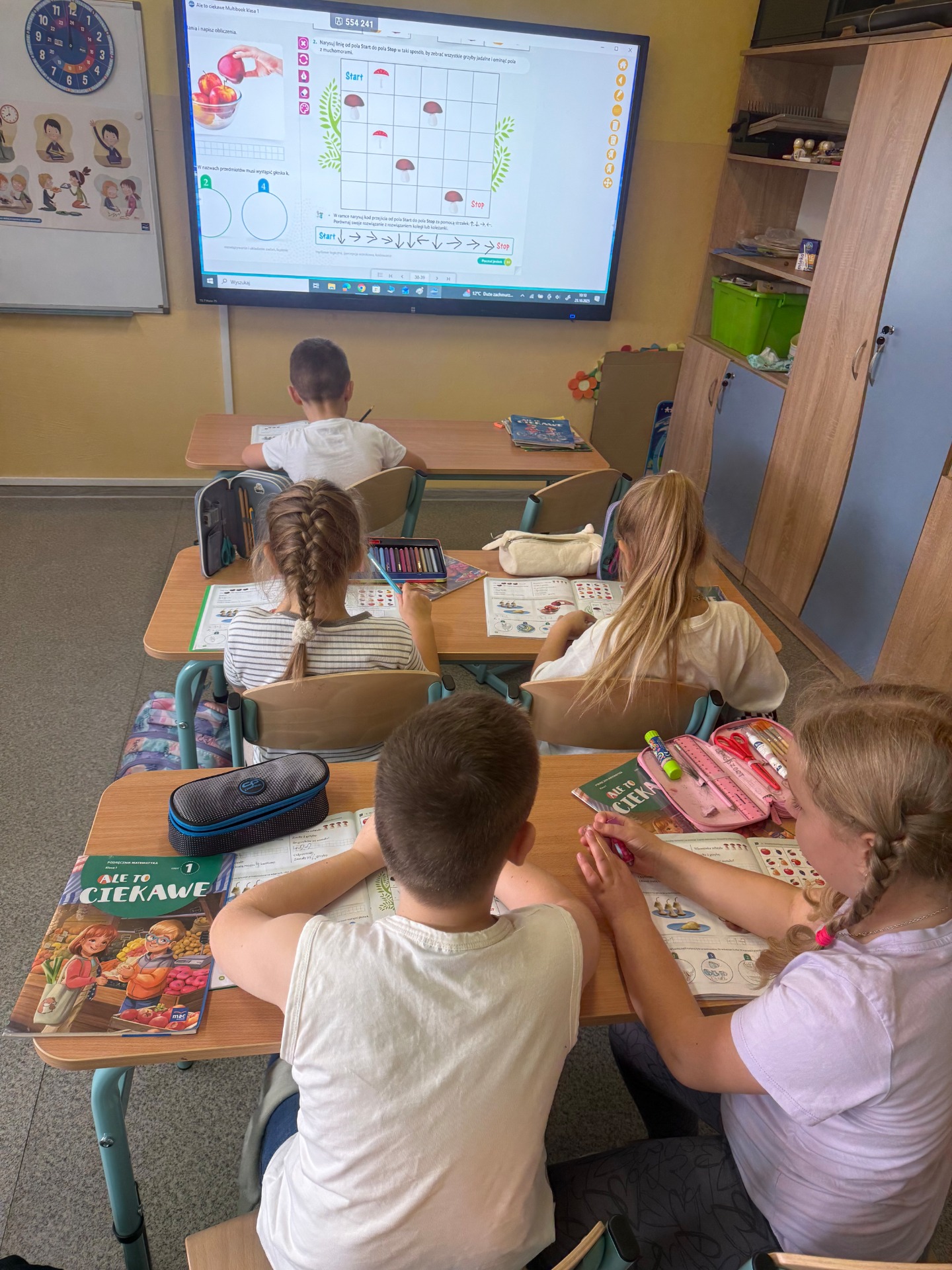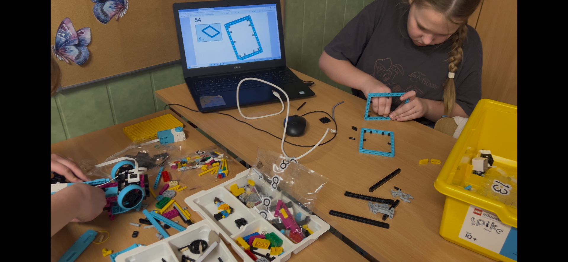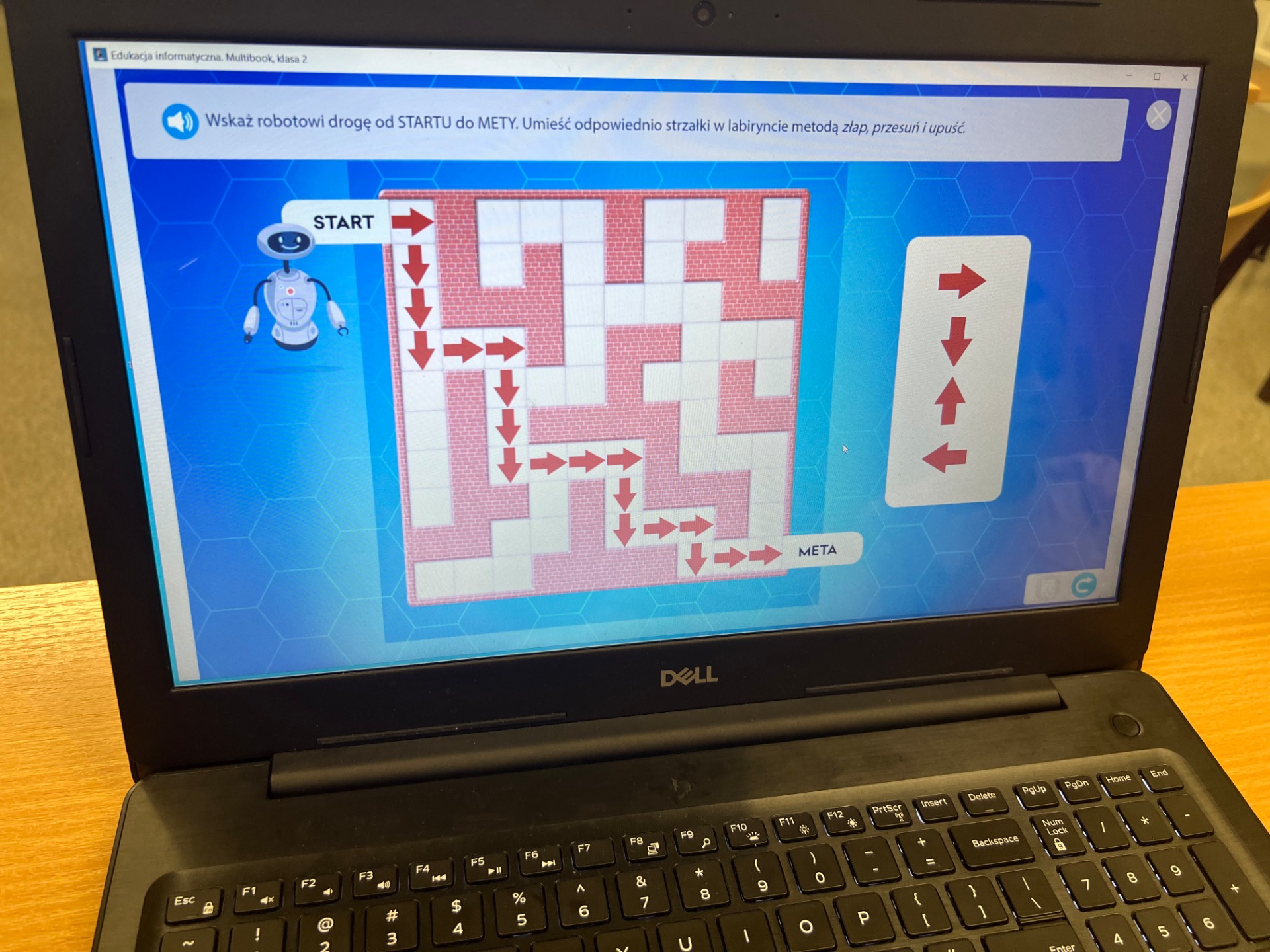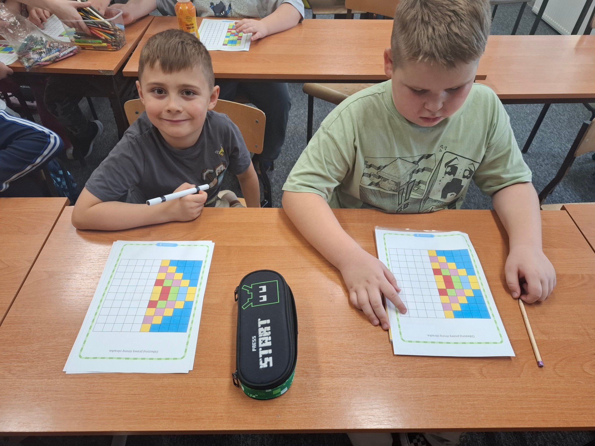 Nie zabrakło też kreatywności na kole informatycznym, gdzie uczniowie programowali roboty z zestawów Lego Spike Prime, oraz w świetlicy szkolnej, gdzie kodowanie odbywało się zarówno z wykorzystaniem internetu, jak i w wersji „offline” – na kartkach papieru.