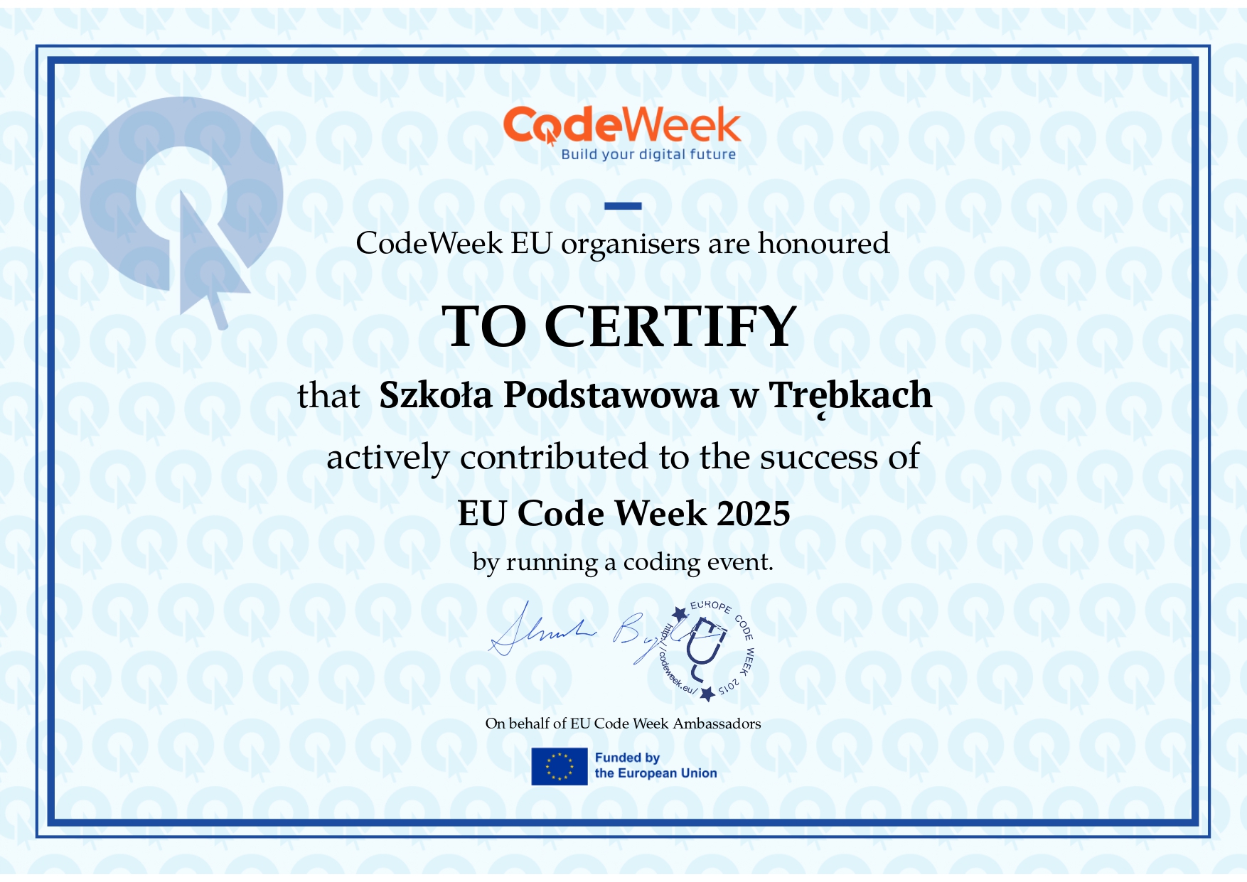 Za udział w ogólnoeuropejskiej akcji nasza szkoła otrzymała certyfikat uczestnictwa w Code Week 2025.