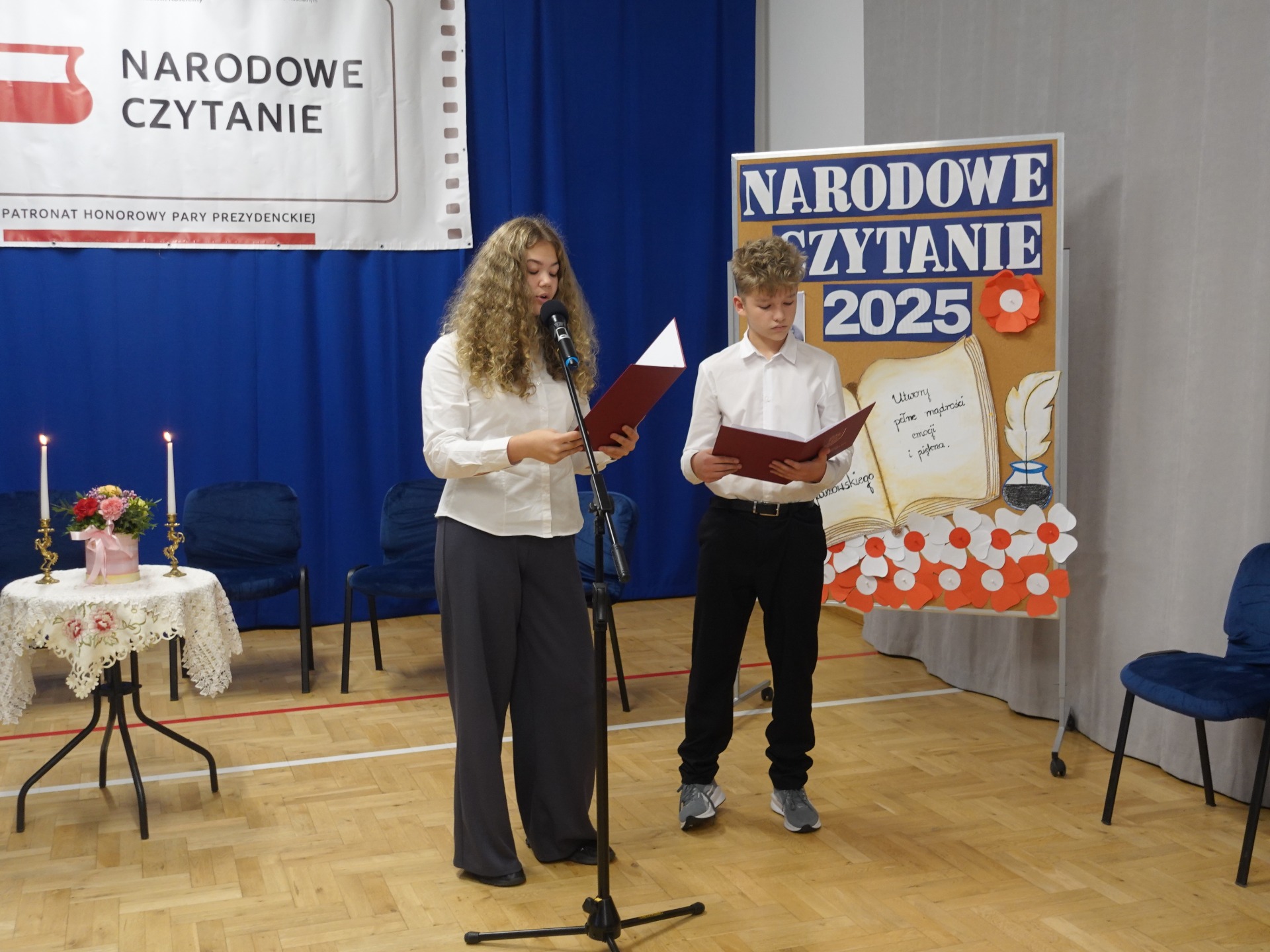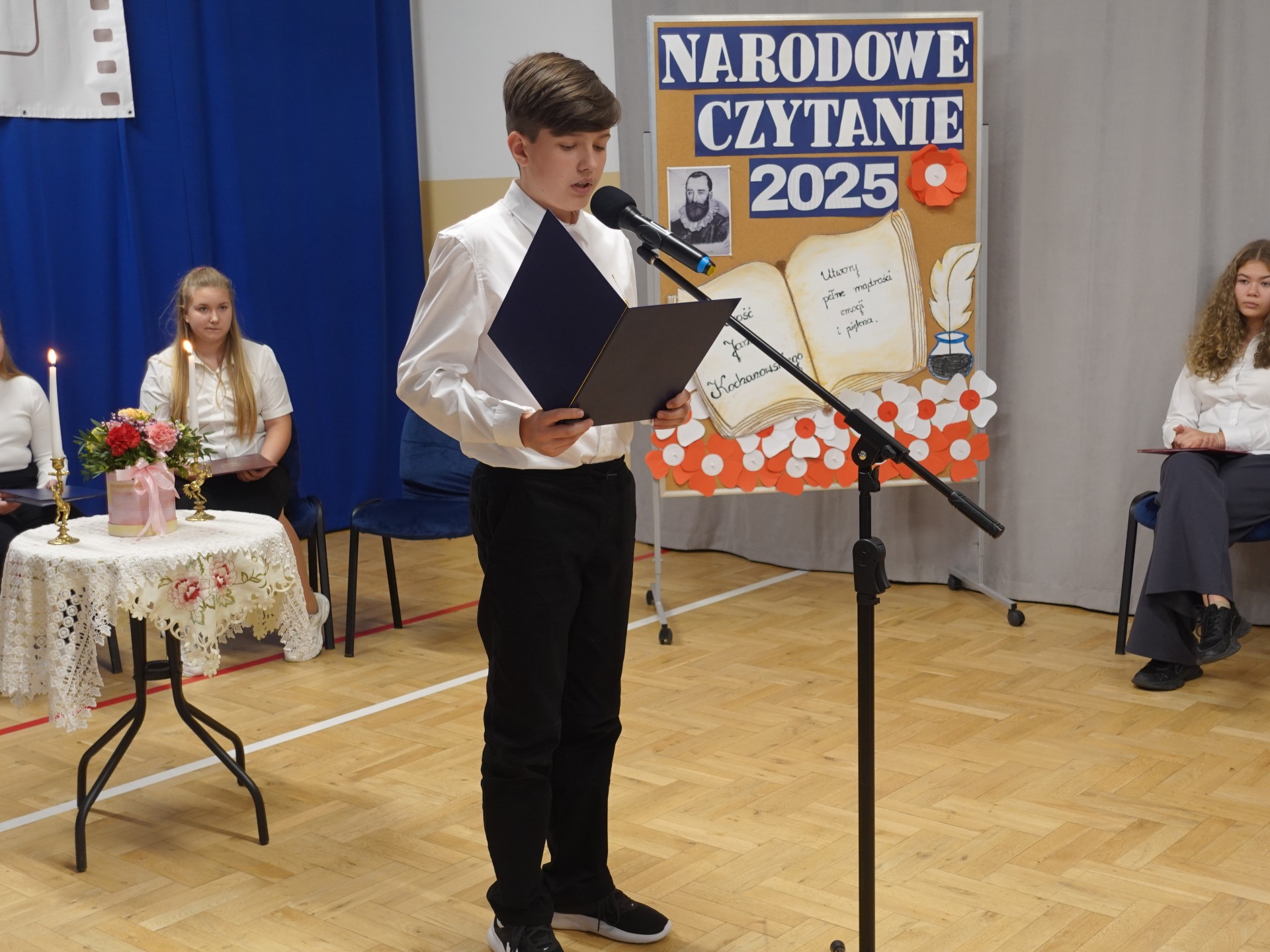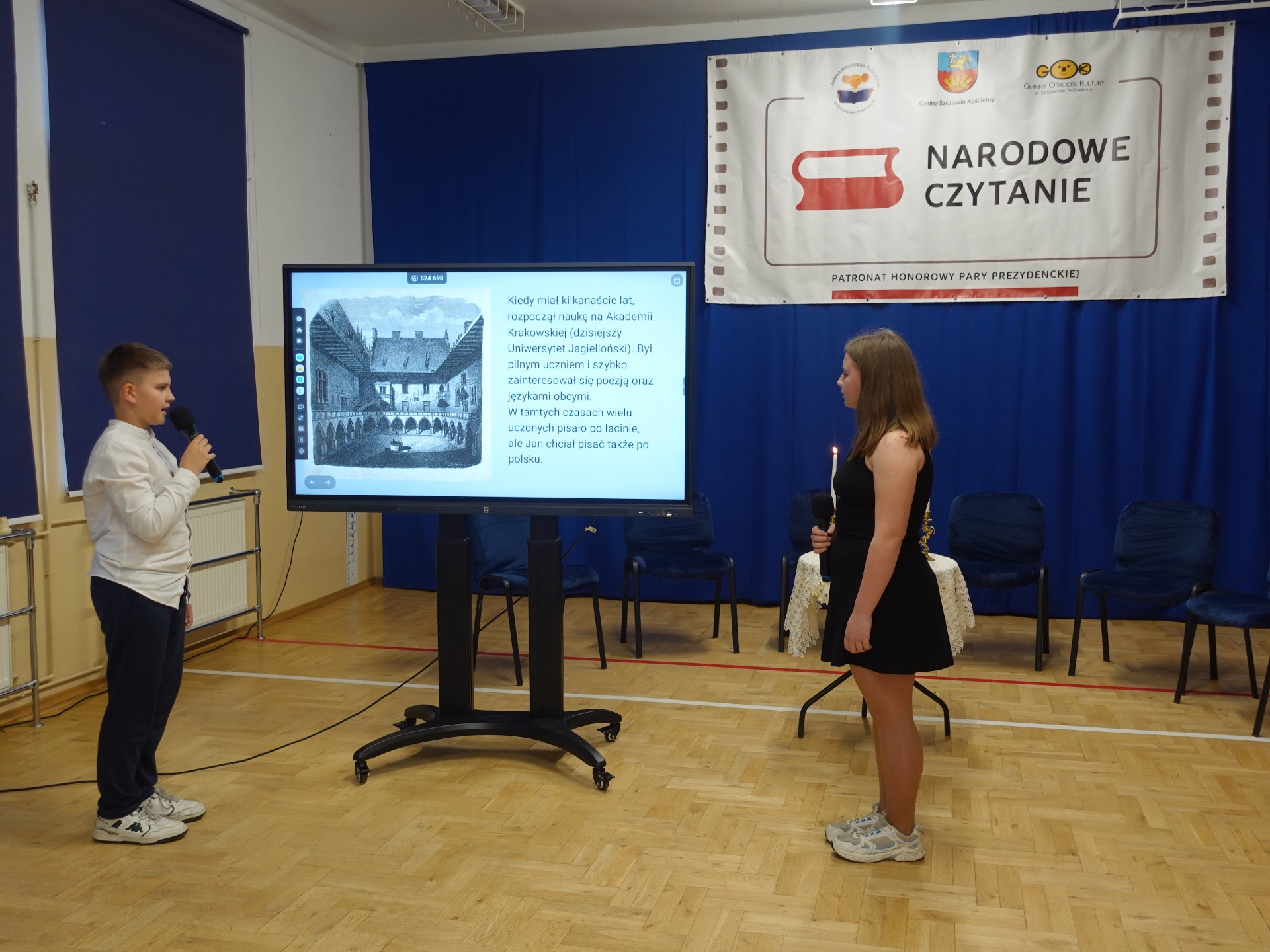Uczciliśmy pamięć i złożyliśmy hołd wielkiemu poecie, Janowi Kochanowskiemu, ojcu poezji polskiej. Zrobiliśmy to w najpiękniejszy sposób, jaki potrafiliśmy, czyli wspominając go i czytając jego poezję. W klimat dawnej epoki przeniosła nas piękna dekoracja oraz muzyka renesansowa. Obejrzeliśmy wystąpienie Prezydenta Karola Nawrockiego wraz z małżonką Martą Nawrocką, którzy zaingurowali wspólną lekturę wielkiego mistrza dnia 06 września w Warszawskim Ogrodzie Saskim. Zaprosiliśmy wszystkich do uczestnictwa w niezwykłej lekcji języka polskiego i historii, która mogła powstać dzięki zaangażowaniu zaproszonych gości, pani dyrektor, nauczycieli, pracowników szkoły i uczniów. Zaprezentowaliśmy fraszki, treny i pieśni Kochanowskiego oraz obejrzeliśmy prezentację multimedialną stworzoną na jego cześć.