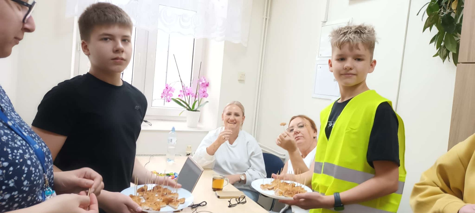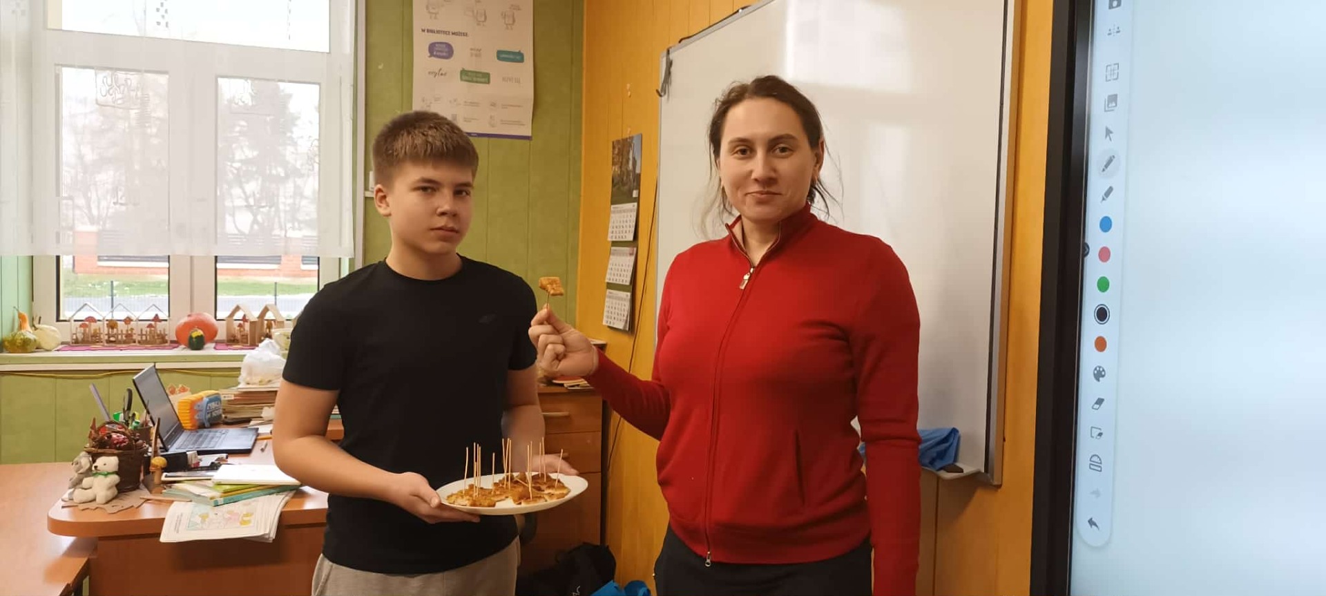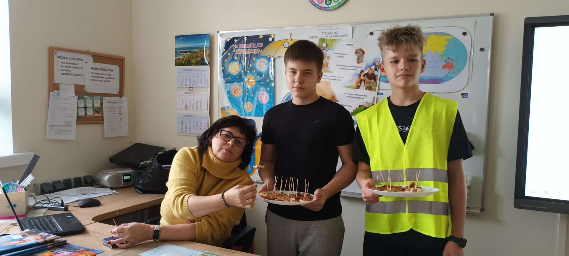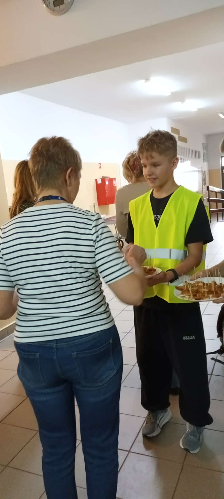 Podczas przerwy obiadowej przewodniczący Samorzadu Uczniowskiego przeszli korytarzem, częstując uczniów i nauczycieli kawałkami kotleta schabowego, co wywołało wiele uśmiechów na twarzach.
