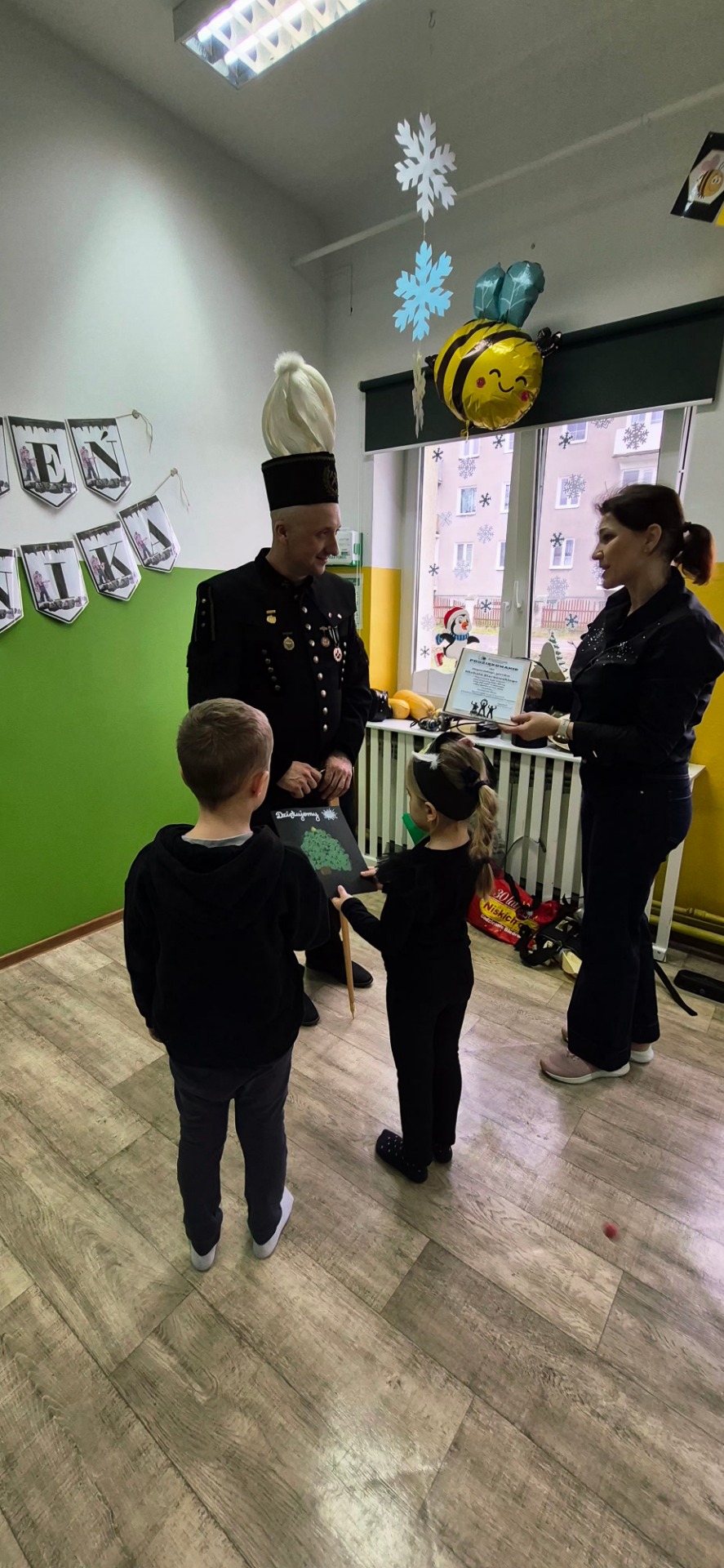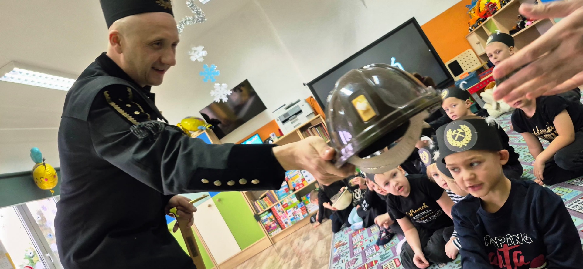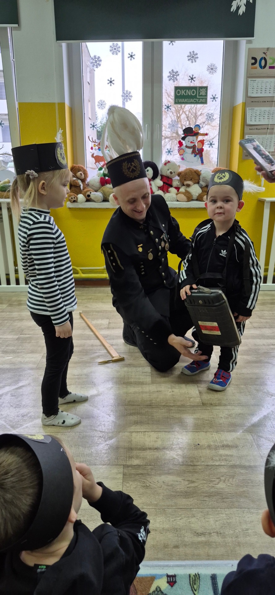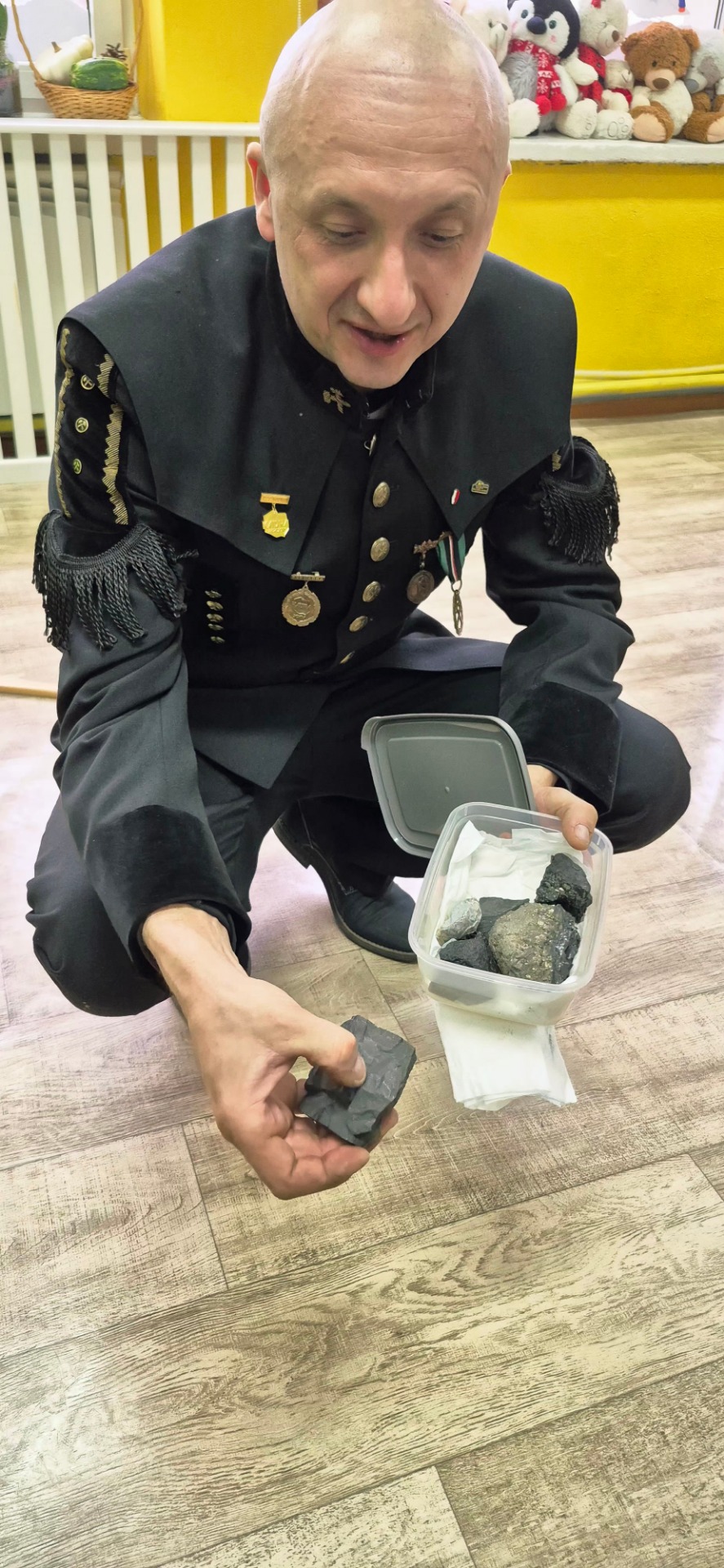 Nasz gość przyjechał ubrany w piękny galowy mundur, czapkę, która poprawnie nazywa się czako, na której lśnił biały pióropusz z prawdziwych gęsich piór. Pan Michał pokazał strój górniczy oraz charakterystyczne elementy wyposażenia oraz opowiedział dzieciom o swojej pracy pod ziemią i maszynach górniczych na których pracuje. Dzieci zobaczyły także różne odmiany węgla.