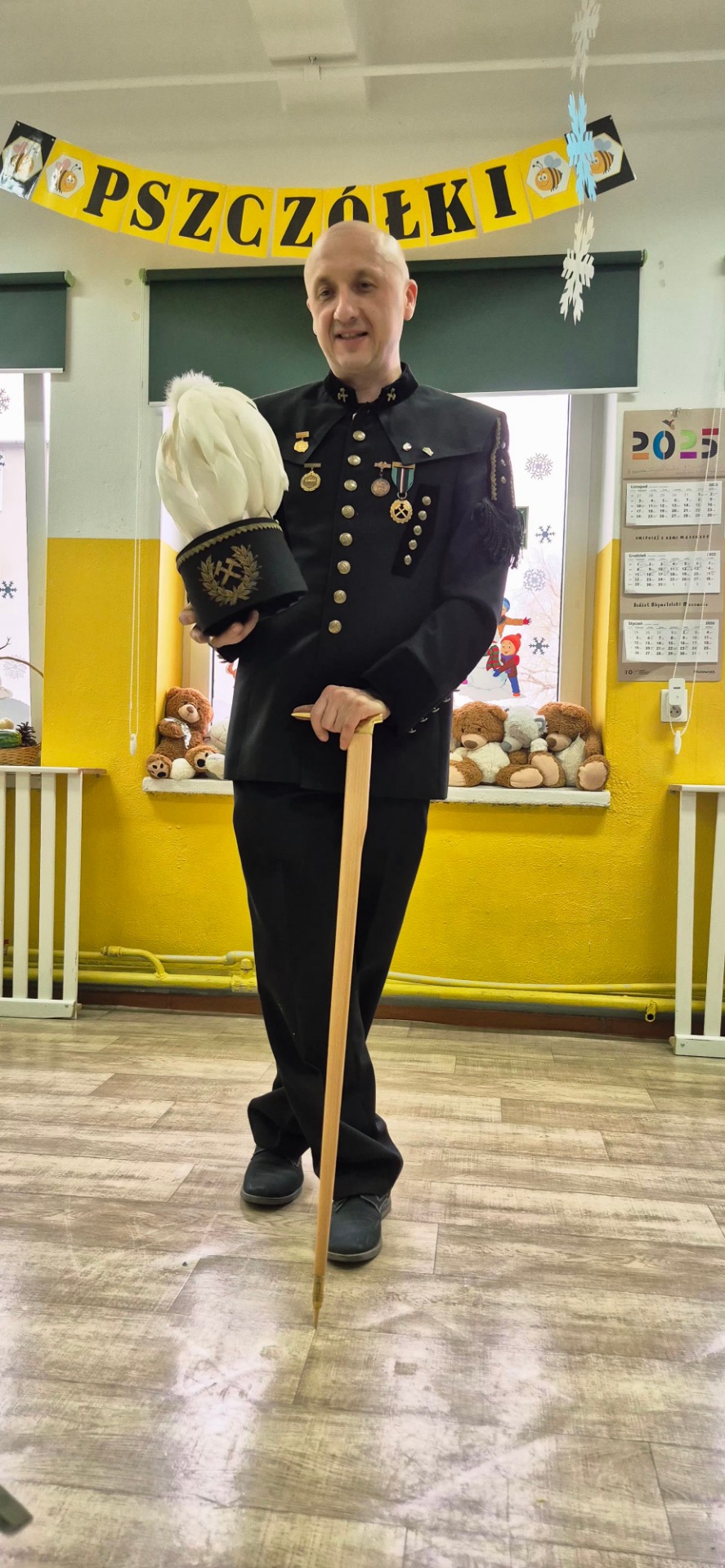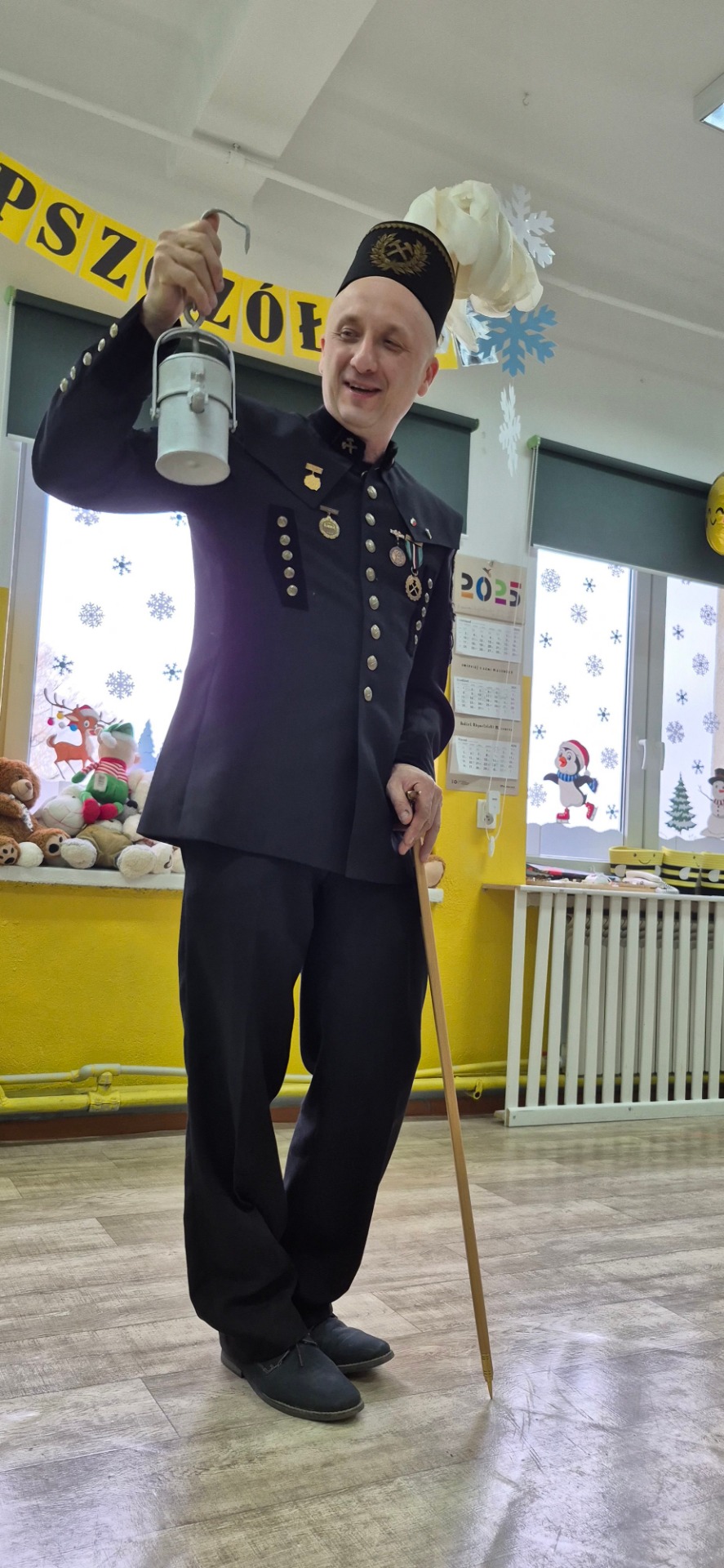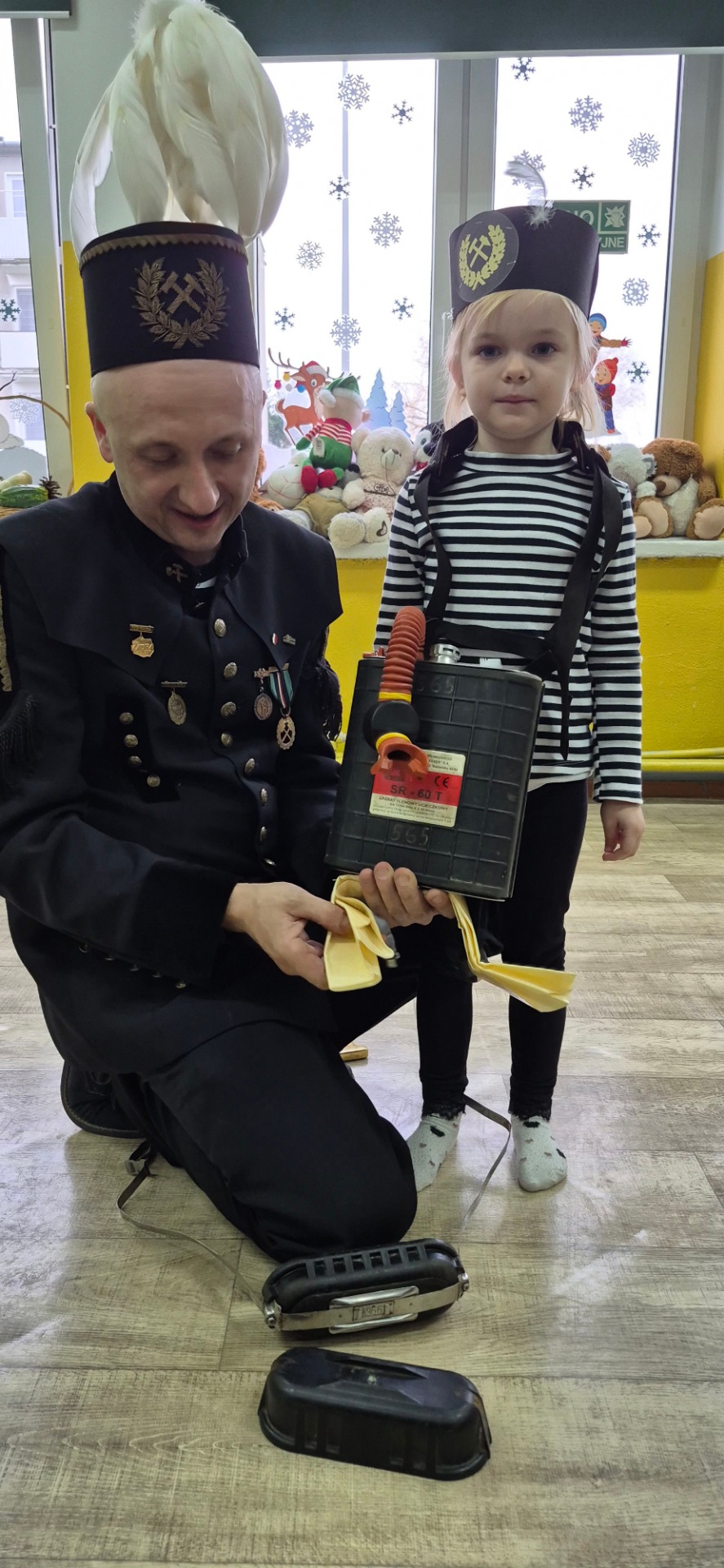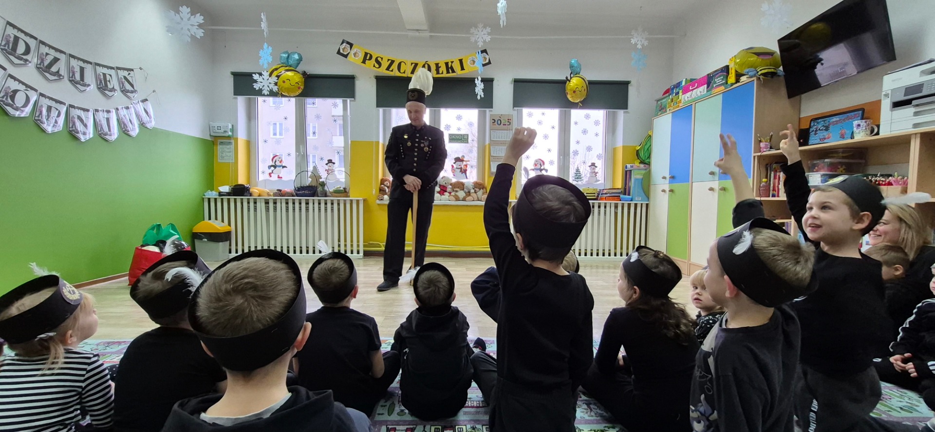 Nasz gość przyjechał ubrany w piękny galowy mundur, czapkę, która poprawnie nazywa się czako, na której lśnił biały pióropusz z prawdziwych gęsich piór. Pan Michał pokazał strój górniczy oraz charakterystyczne elementy wyposażenia oraz opowiedział dzieciom o swojej pracy pod ziemią i maszynach górniczych na których pracuje. Dzieci zobaczyły także różne odmiany węgla.