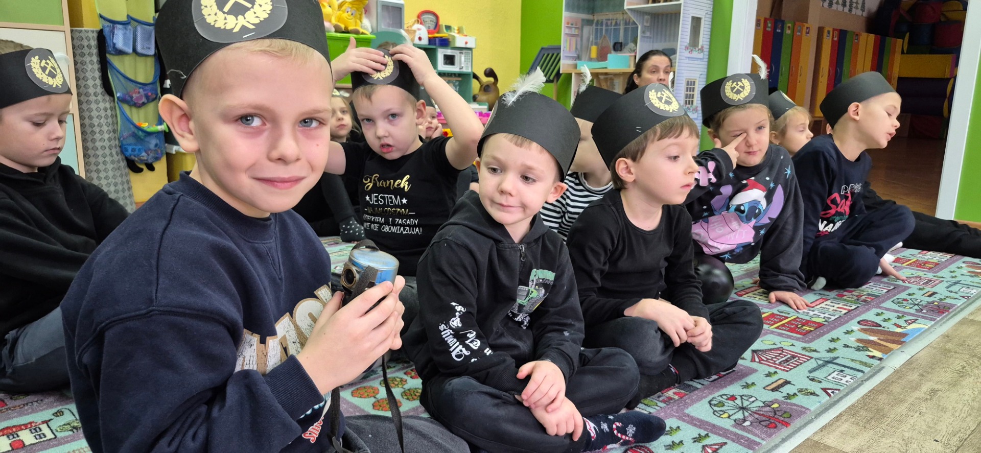Dziś 3 grudnia wszystkie przedszkolaki przyszły do przedszkola ubrane na czarno. W pięknych czapkach czako świętowały ,,Dzień Górnika" zwany - ,,Barbórką". Święta Barbara jest patronką górników, która przypomina o ciężkiej i niebezpiecznej pracy w kopalni. Zatem była to doskonała okazja do wzbogacenia wiedzy na temat ich pracy. Chcąc przybliżyć przedszkolakom zawód górnika zaprosiliśmy do przedszkola pana Michała Ziarkowskiego - górnika KWK Halemba, mieszkającego na Śląsku.