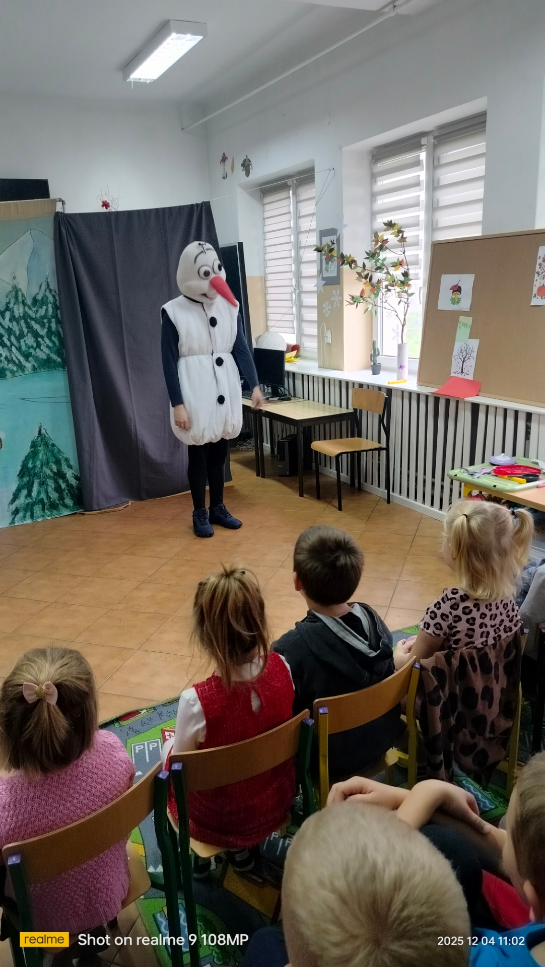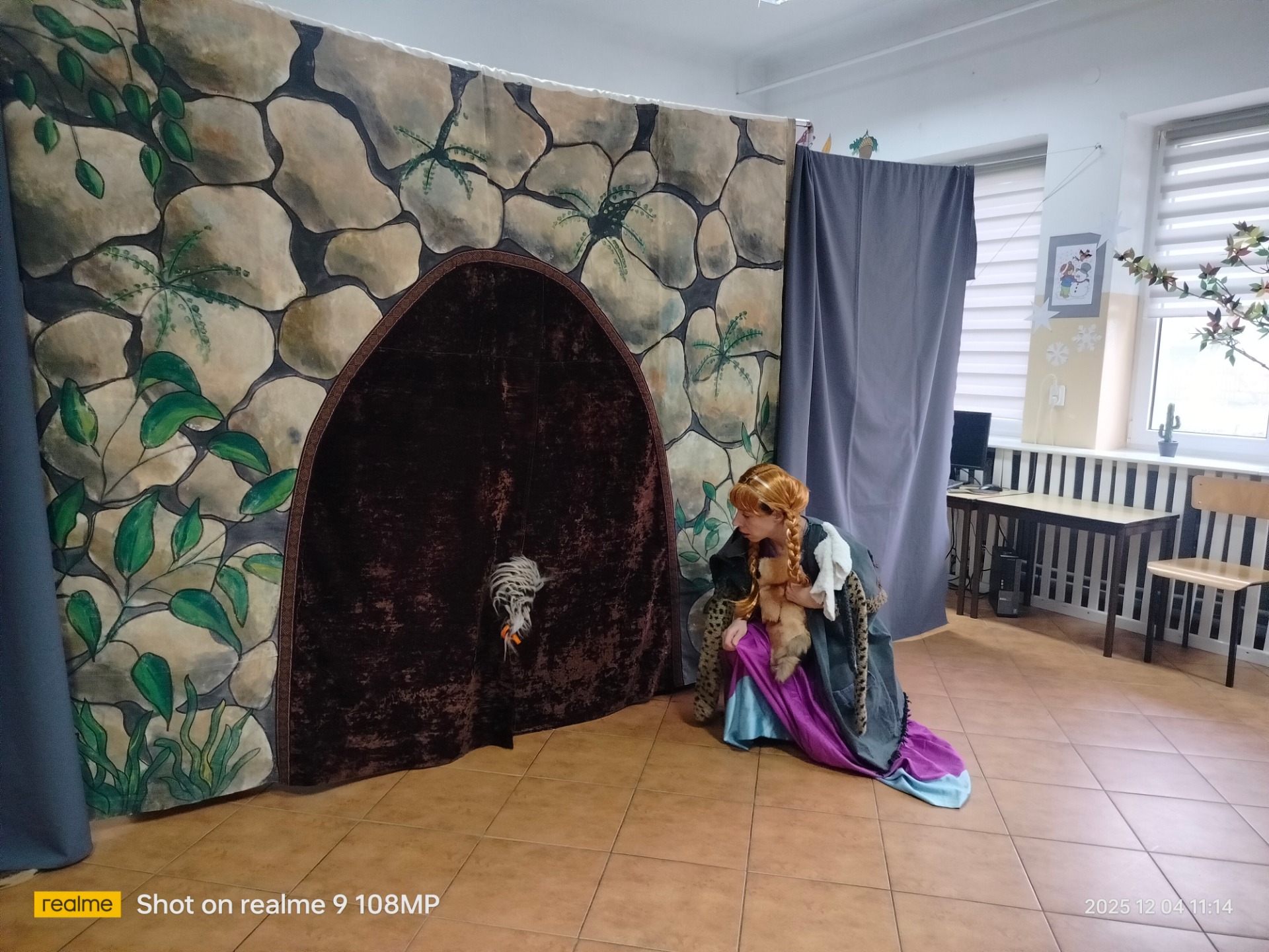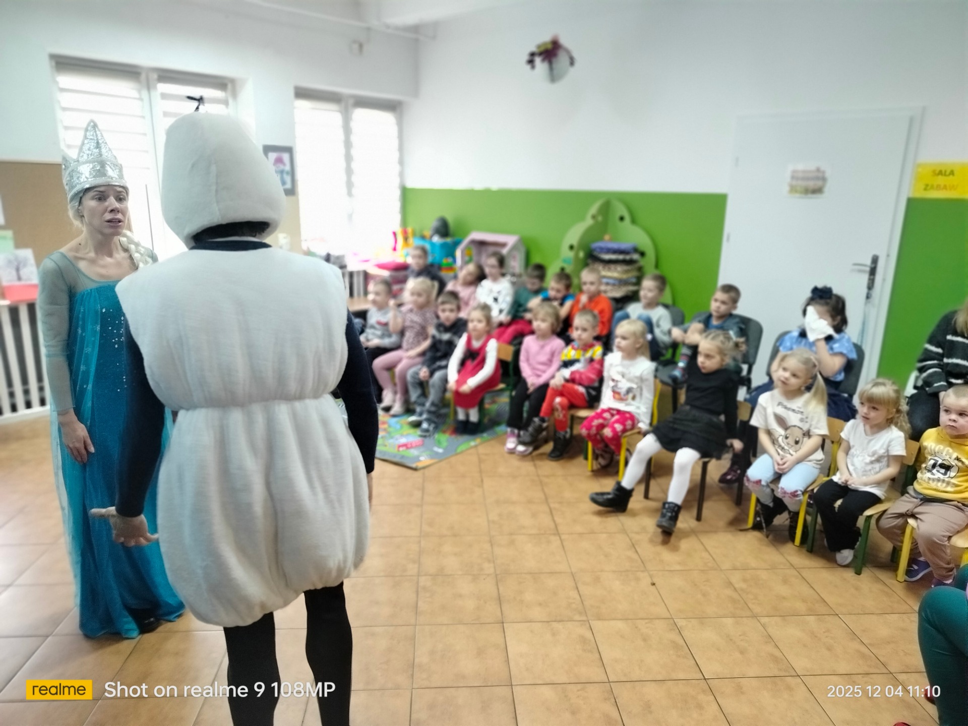 Dziś 4 grudnia w naszym przedszkolu odbyło się wyjątkowe wydarzenie – gościliśmy po raz kolejny teatrzyk „Krak Art Bis” z przedstawieniem pt. ,,Kraina Lodu", który przeniósł dzieci w magiczny świat pełen kolorów, muzyki i radosnych przygód. Mali widzowie z zapartym tchem śledzili losy bohaterów Elzy, Anny, Olafa,Kristoffa i renifera Svenna ucząc się przy tym, jak ważne są przyjaźń, dobro, wzajemna pomoc i miłość, która przezwycięża wszystko. Spektakl był pełen humoru, pięknych kostiumów i interakcji z publicznością, dzięki czemu każde dziecko mogło poczuć się częścią tej niezwykłej opowieści.