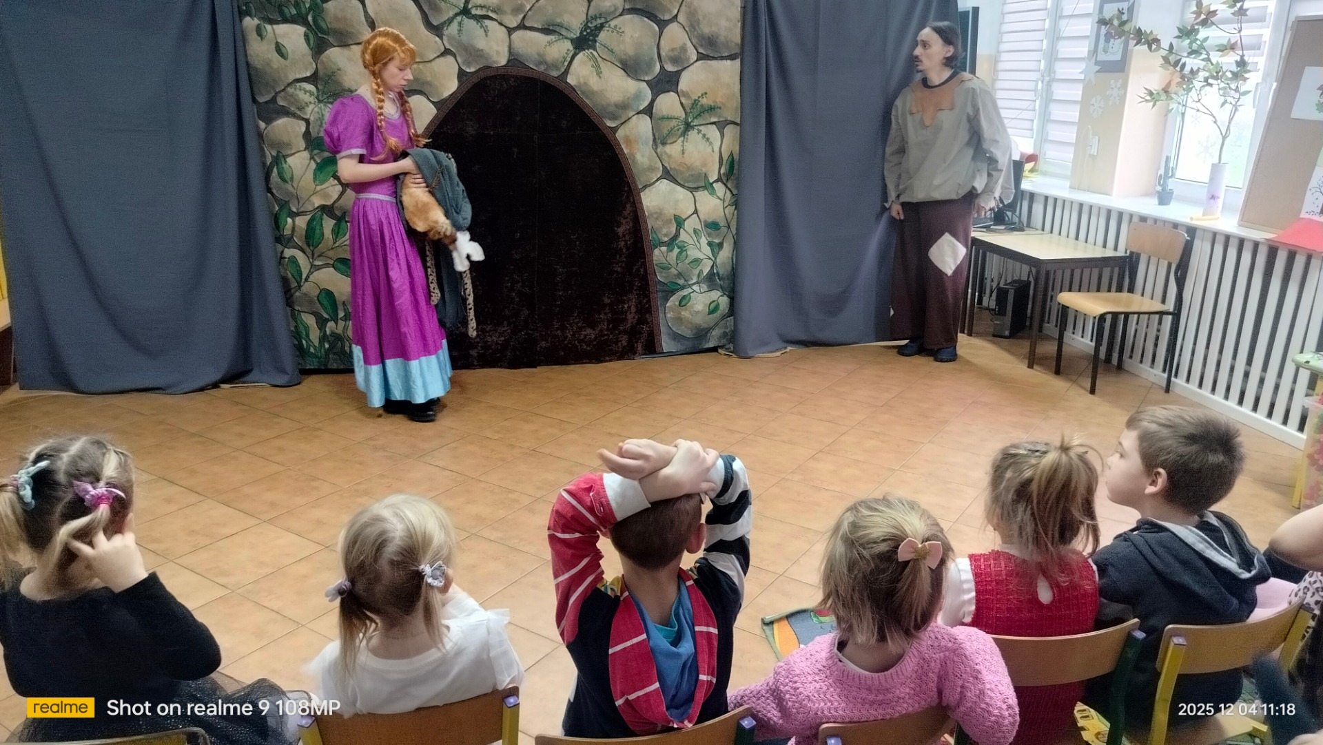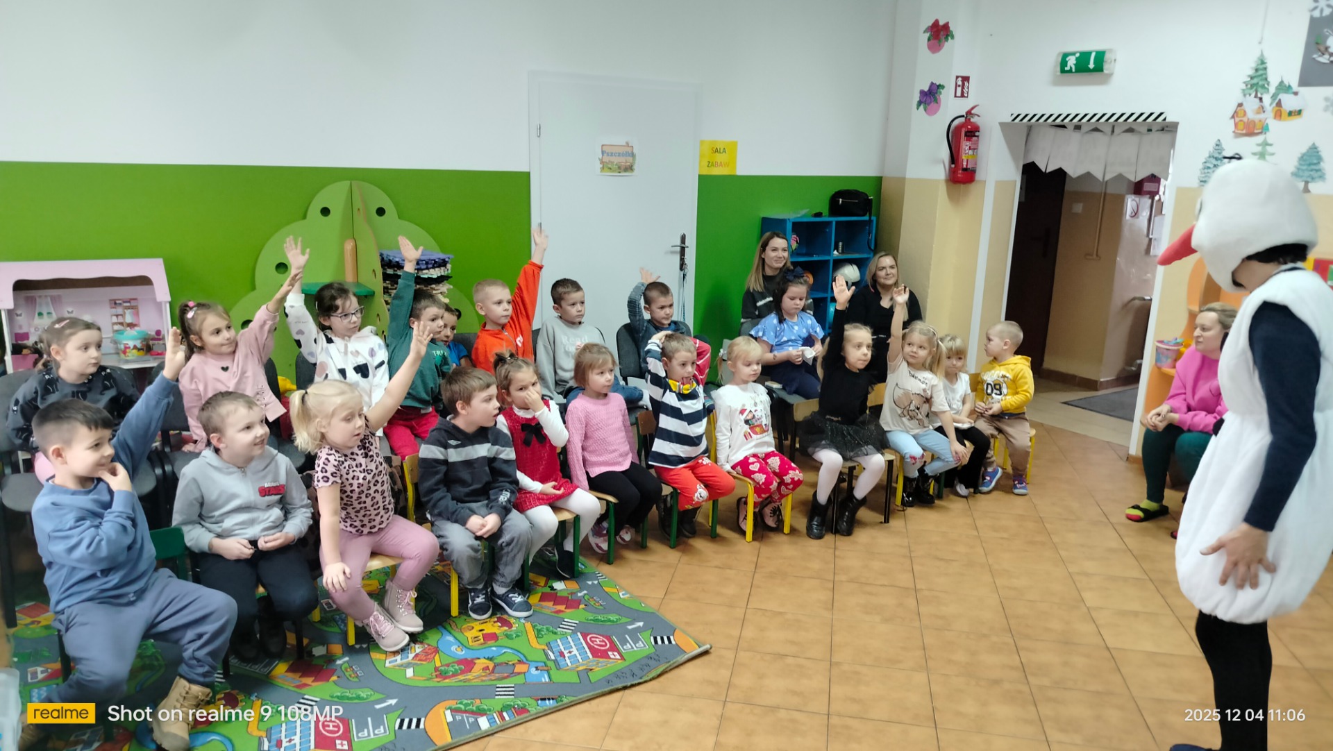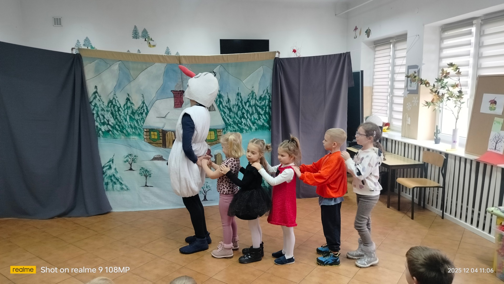 Dziś 4 grudnia w naszym przedszkolu odbyło się wyjątkowe wydarzenie – gościliśmy po raz kolejny teatrzyk „Krak Art Bis” z przedstawieniem pt. ,,Kraina Lodu", który przeniósł dzieci w magiczny świat pełen kolorów, muzyki i radosnych przygód. Mali widzowie z zapartym tchem śledzili losy bohaterów Elzy, Anny, Olafa,Kristoffa i renifera Svenna ucząc się przy tym, jak ważne są przyjaźń, dobro, wzajemna pomoc i miłość, która przezwycięża wszystko. Spektakl był pełen humoru, pięknych kostiumów i interakcji z publicznością, dzięki czemu każde dziecko mogło poczuć się częścią tej niezwykłej opowieści.